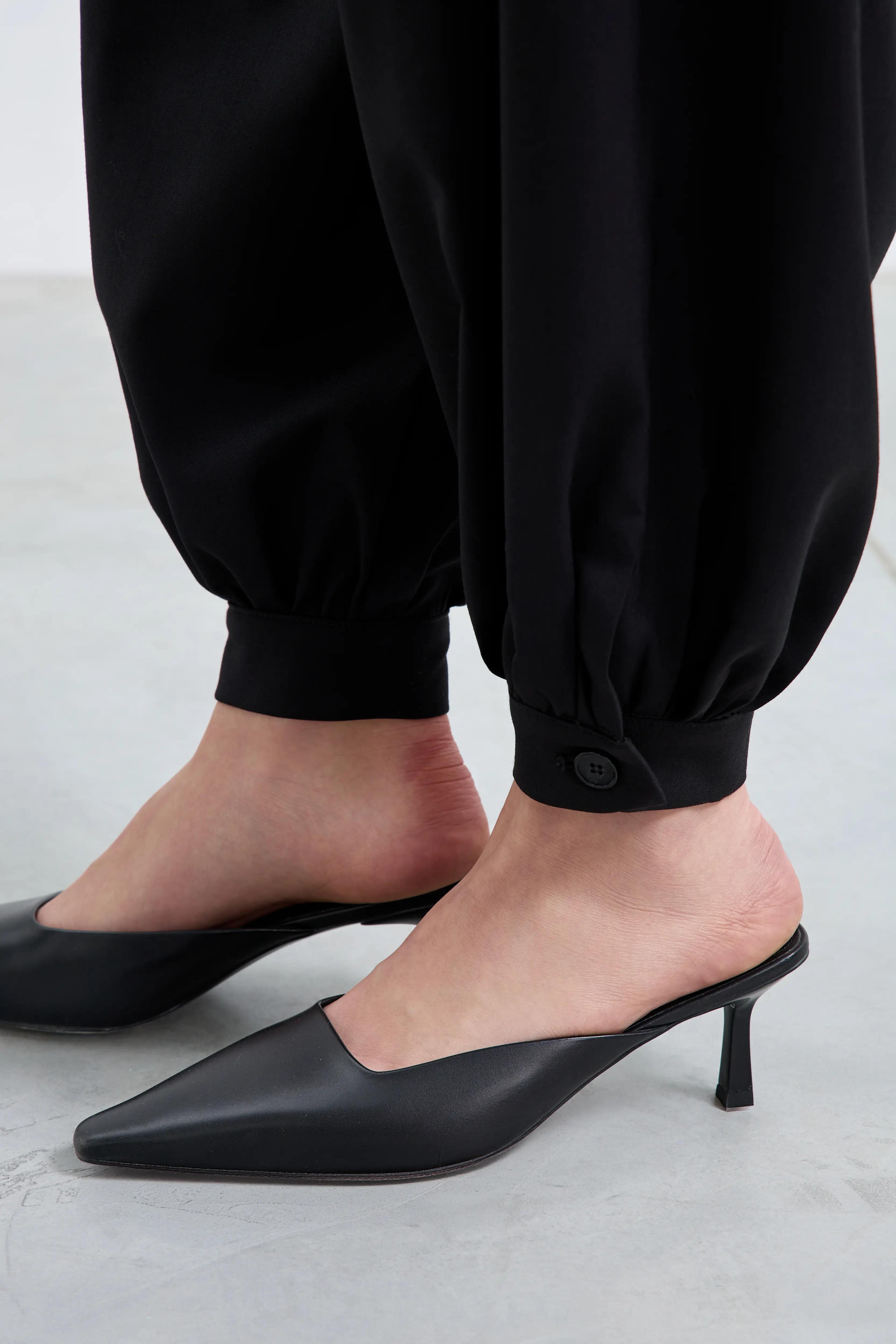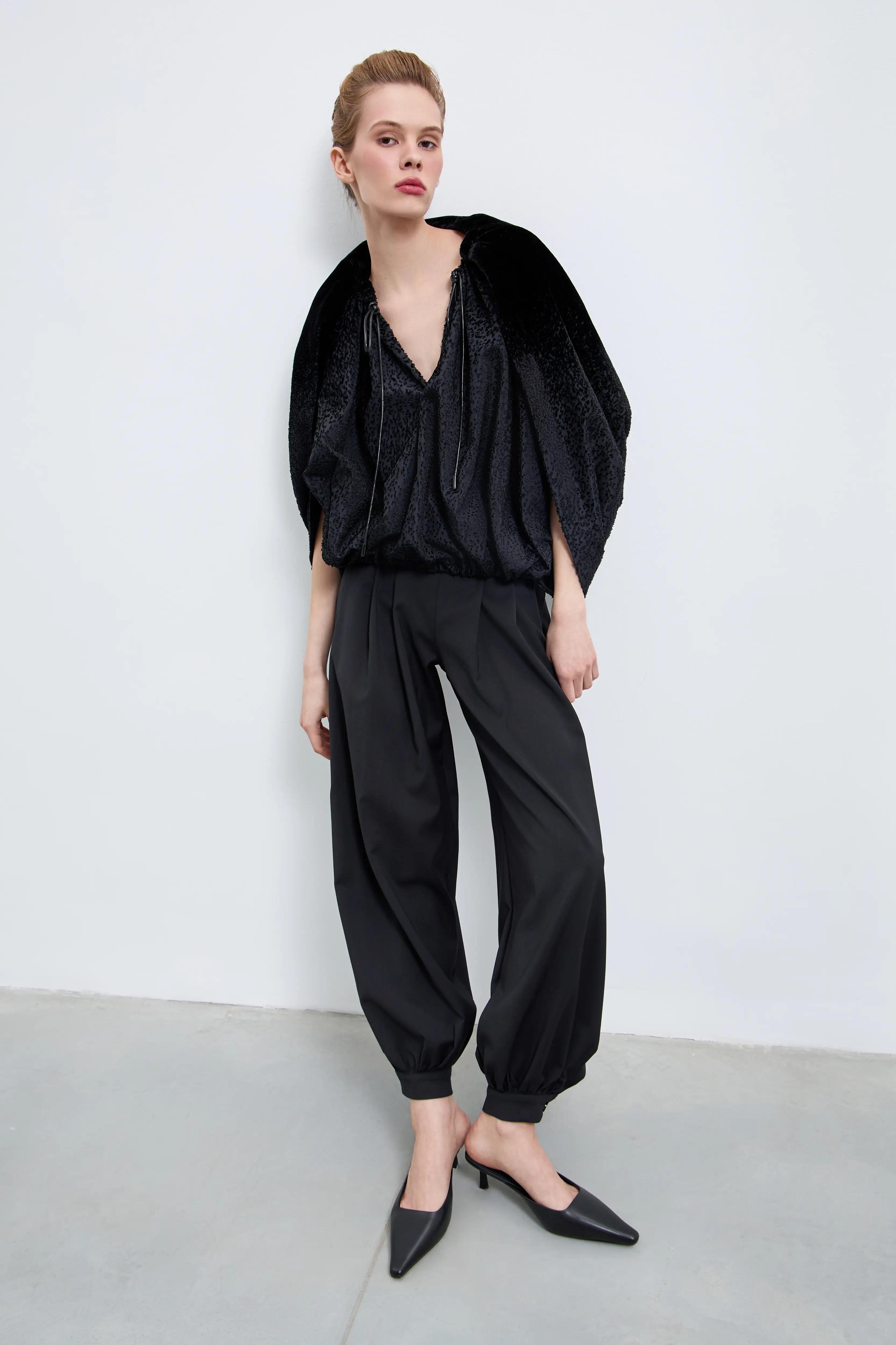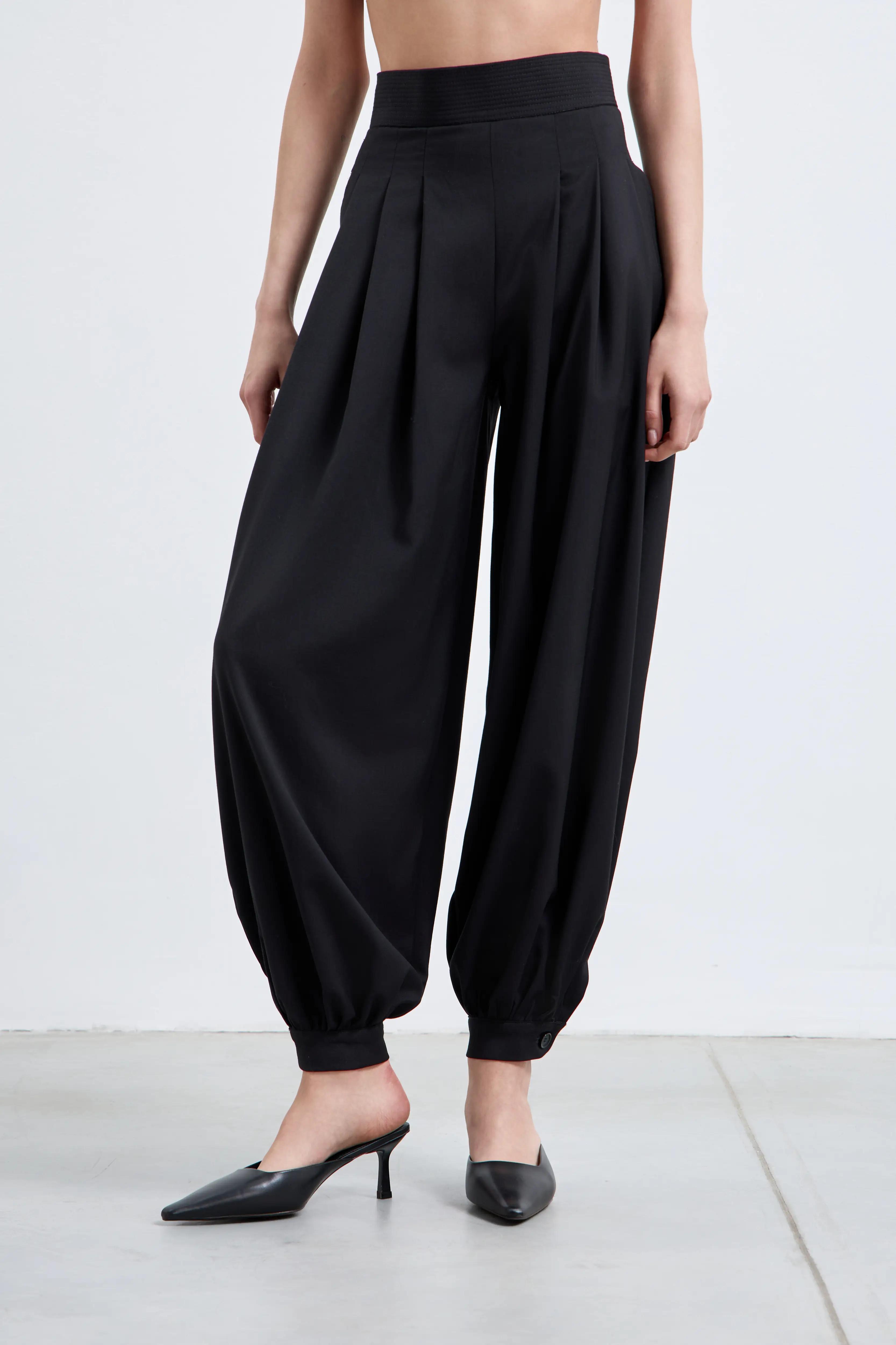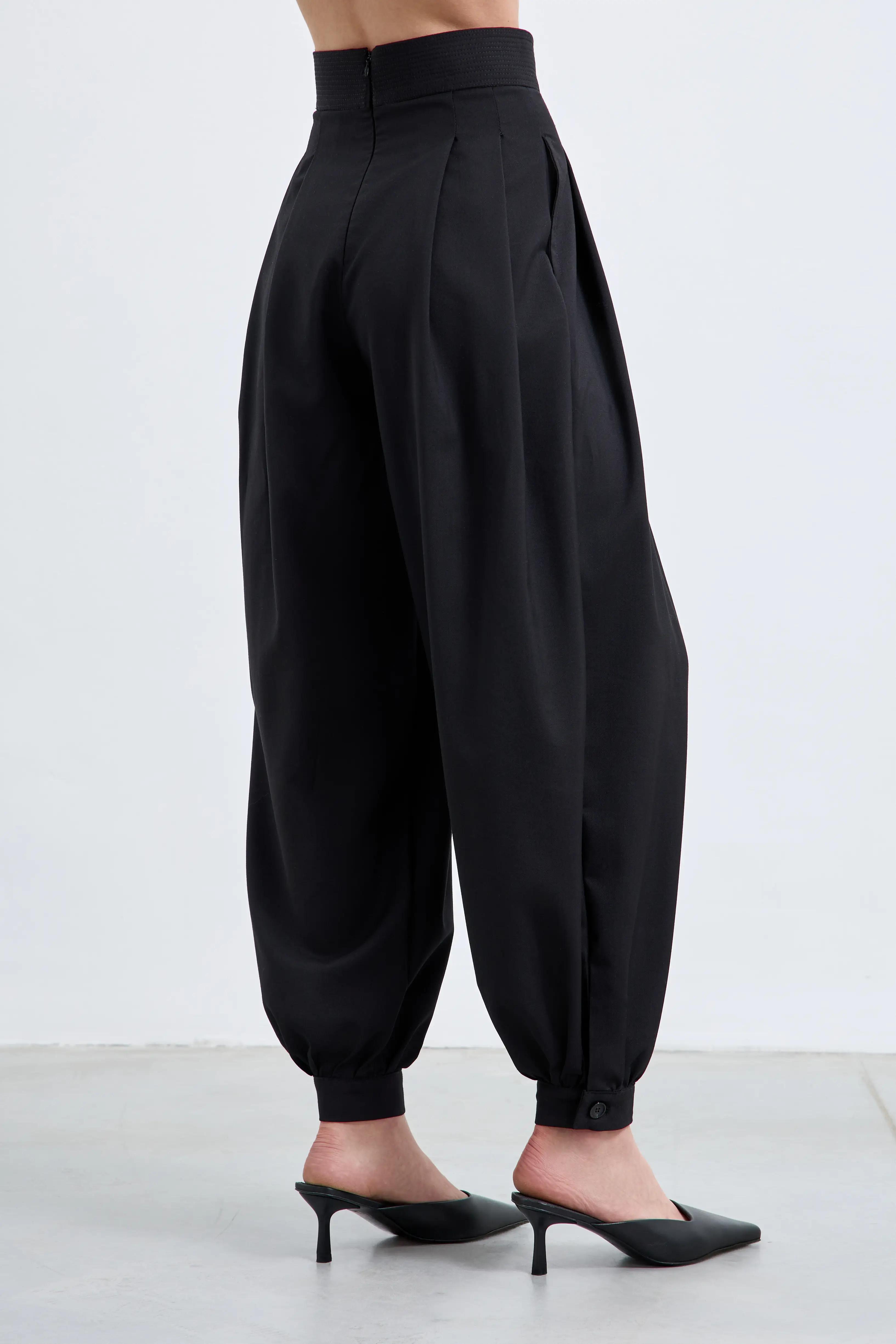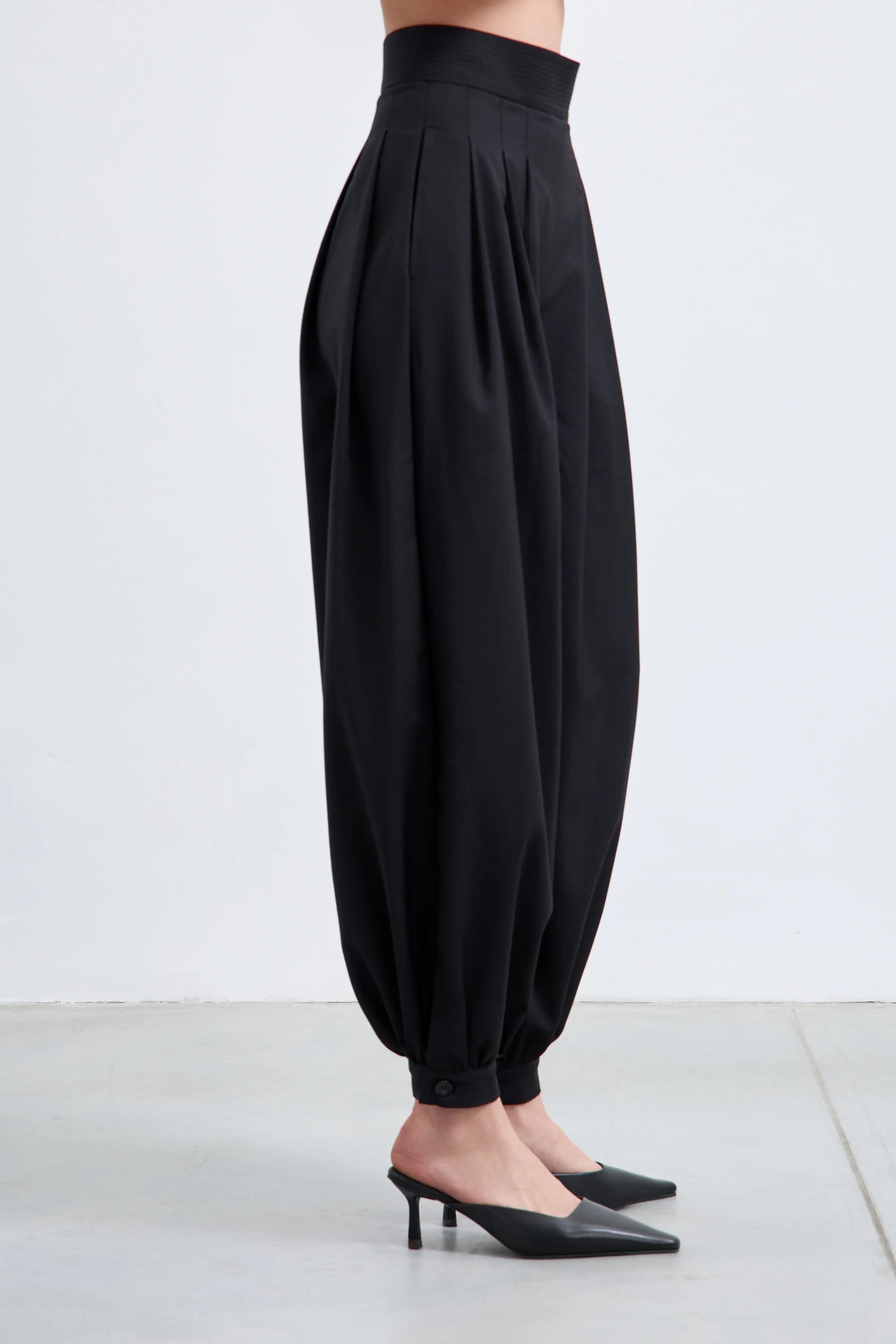 Посадка – высокая талия со слегка утягивающим эластичным поясом-корсажем подчёркивает линию талии. Драпировка – по две глубокие односторонние складки с каждой стороны запускают дополнительный объём от пояса. Силуэт – расслабленный по бедру и сужающийся к низу ballon-крой; эластичные манжеты собирают брюки на щиколотке, визуально вытягивая фигуру и открывая обувь.