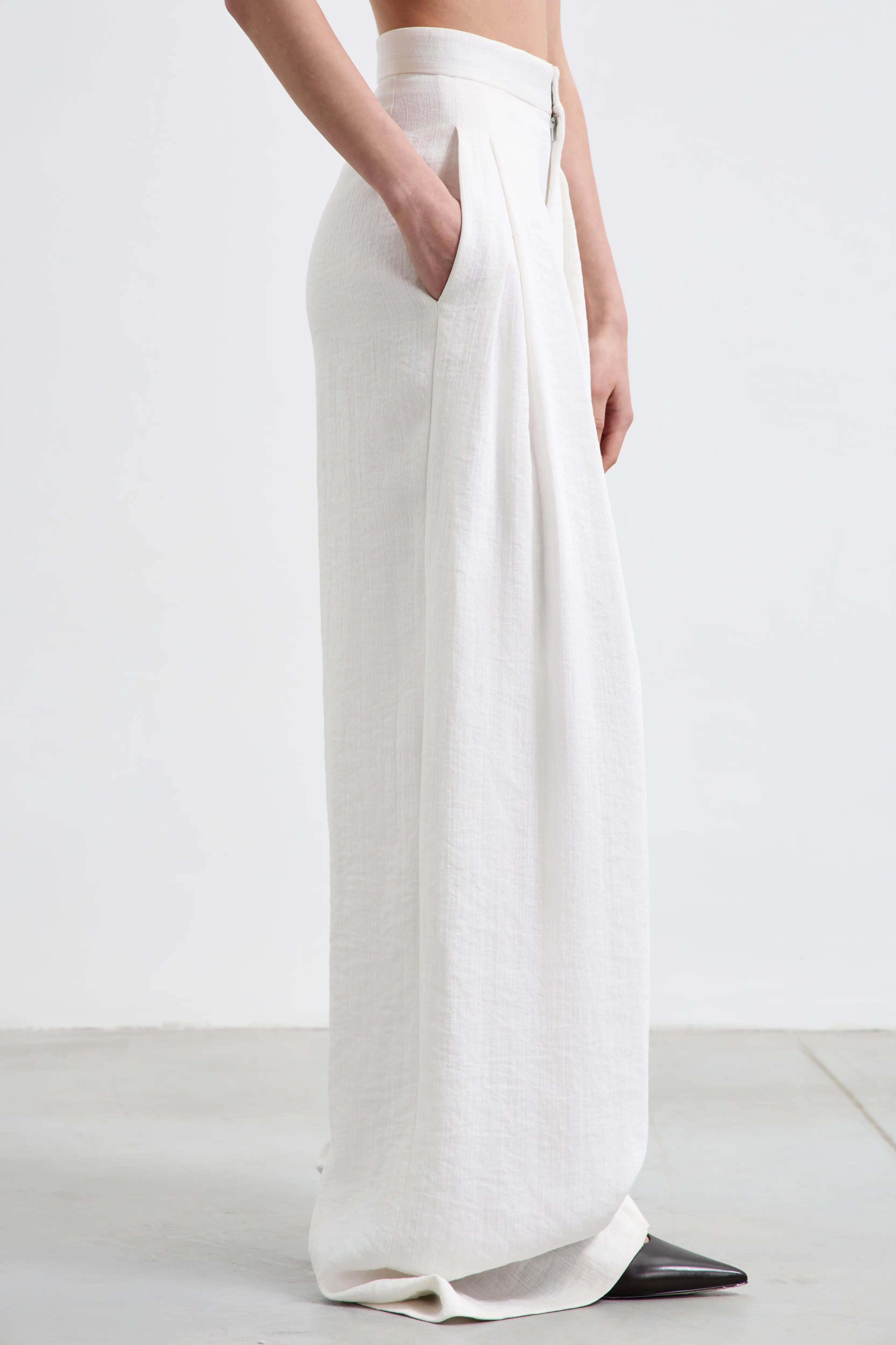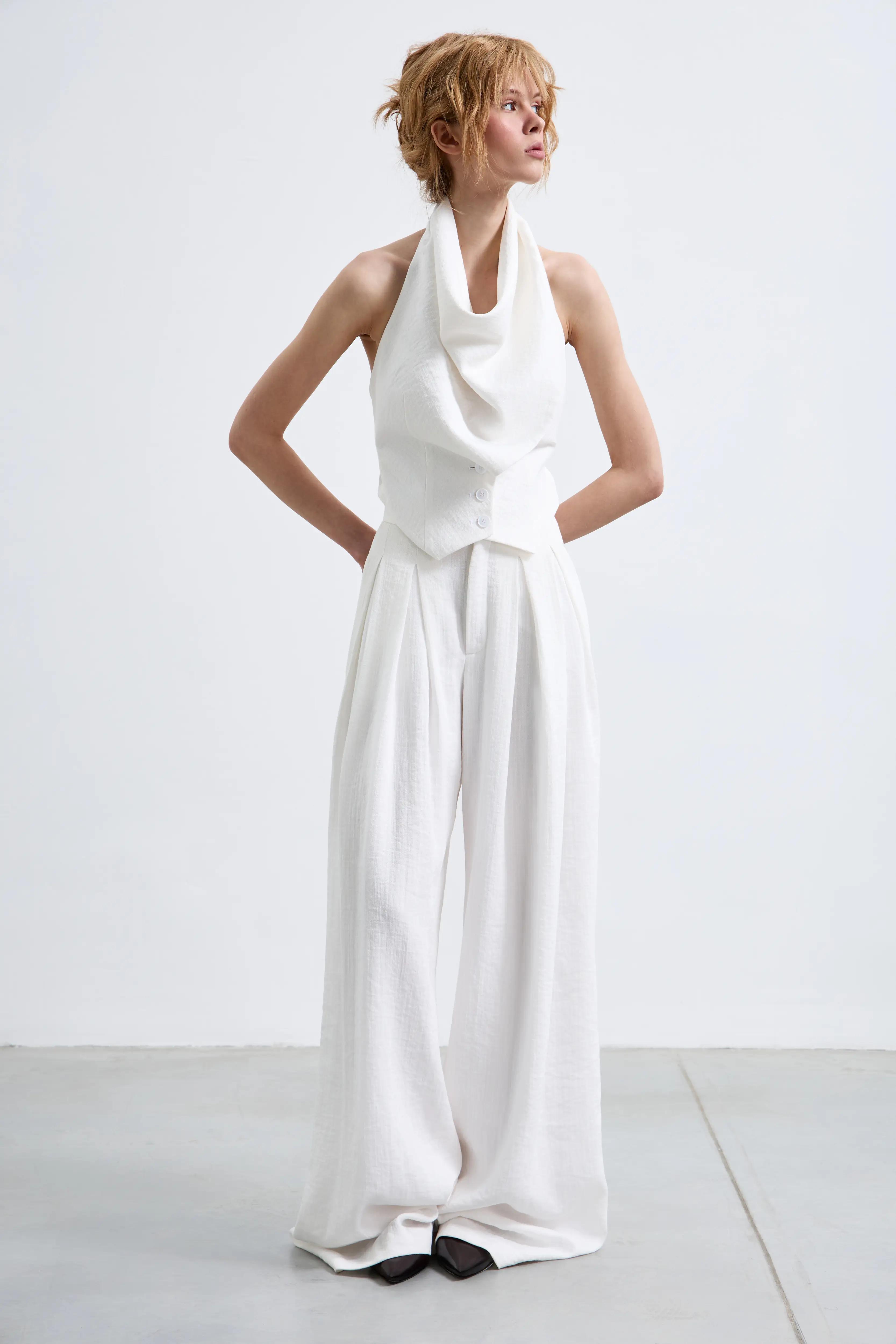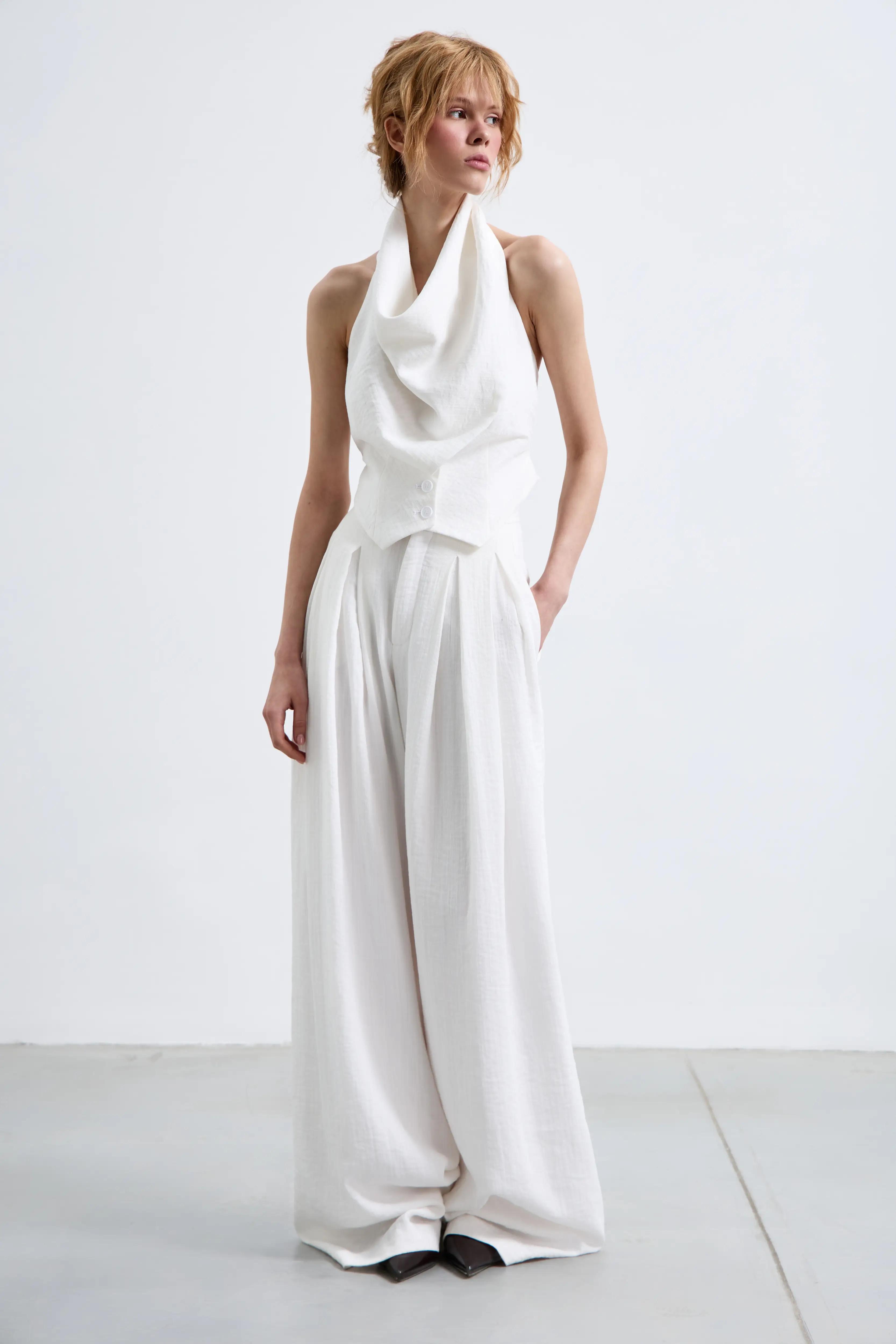 Воздушные брюки-palazzo, которые читаются как кутюрная база. Высокая посадка и мягкие защипы собирают талию и дают идеальную вертикаль. Ткань держит форму деликатно — без жёсткости — поэтому силуэт выглядит чисто и дорого в движении.