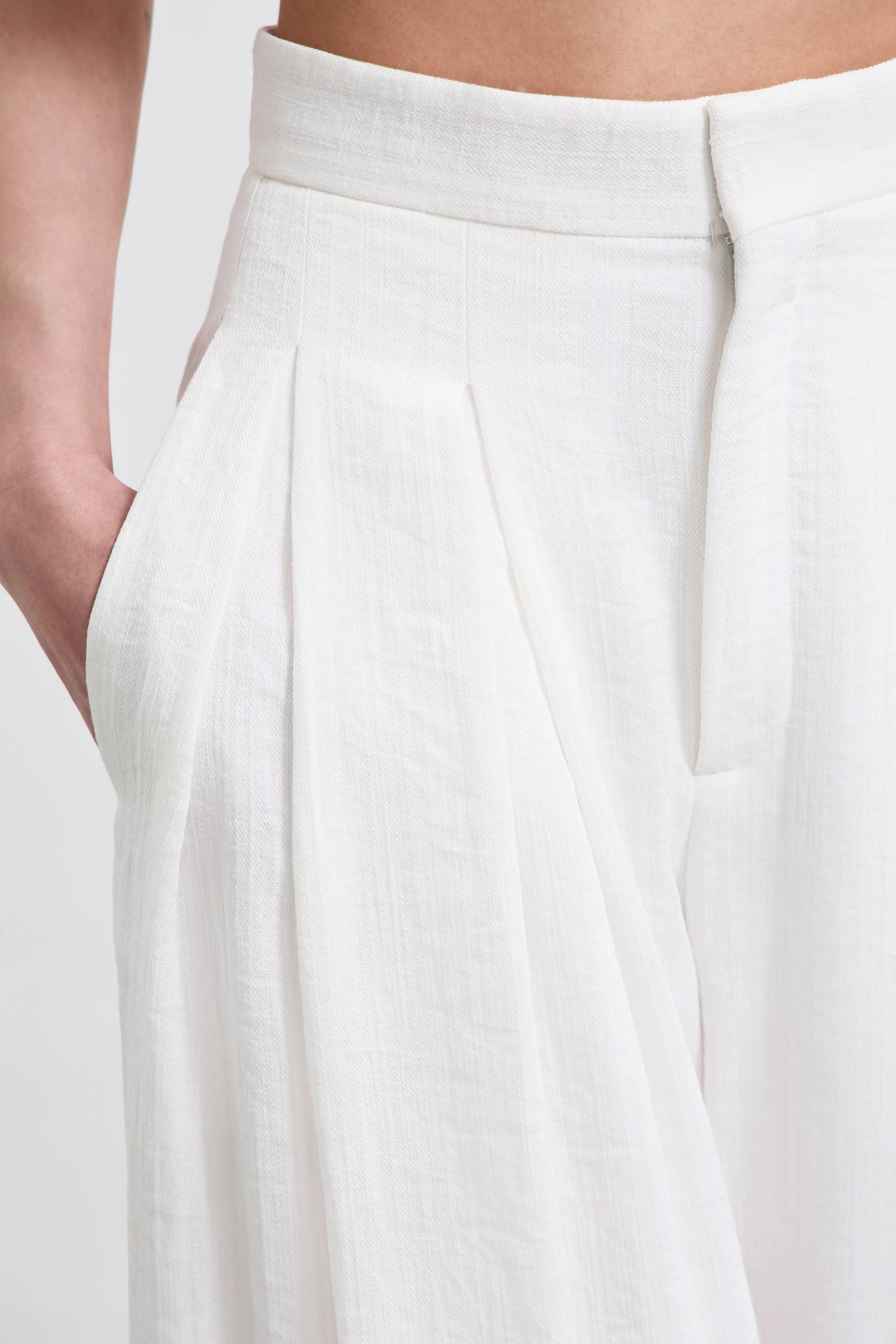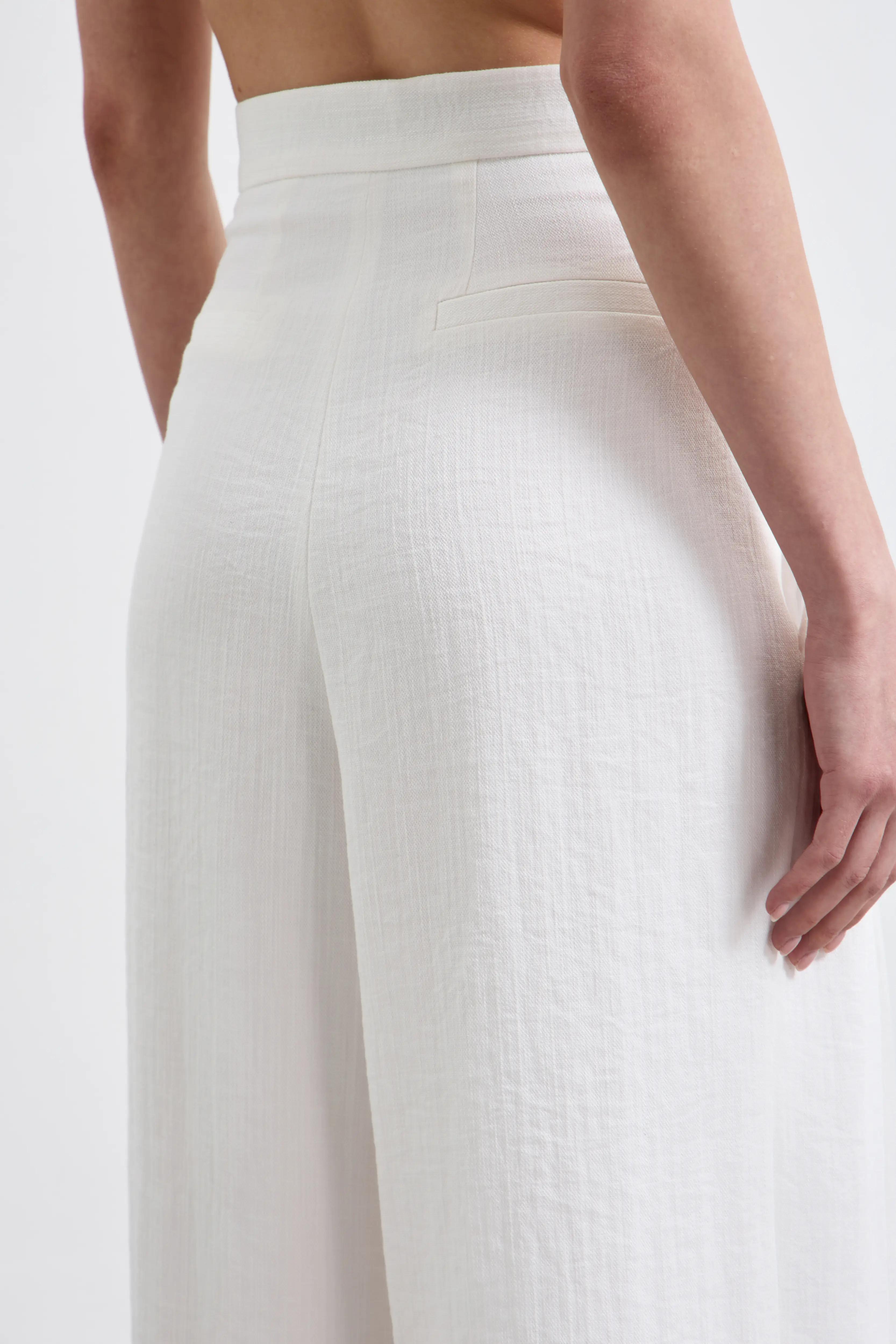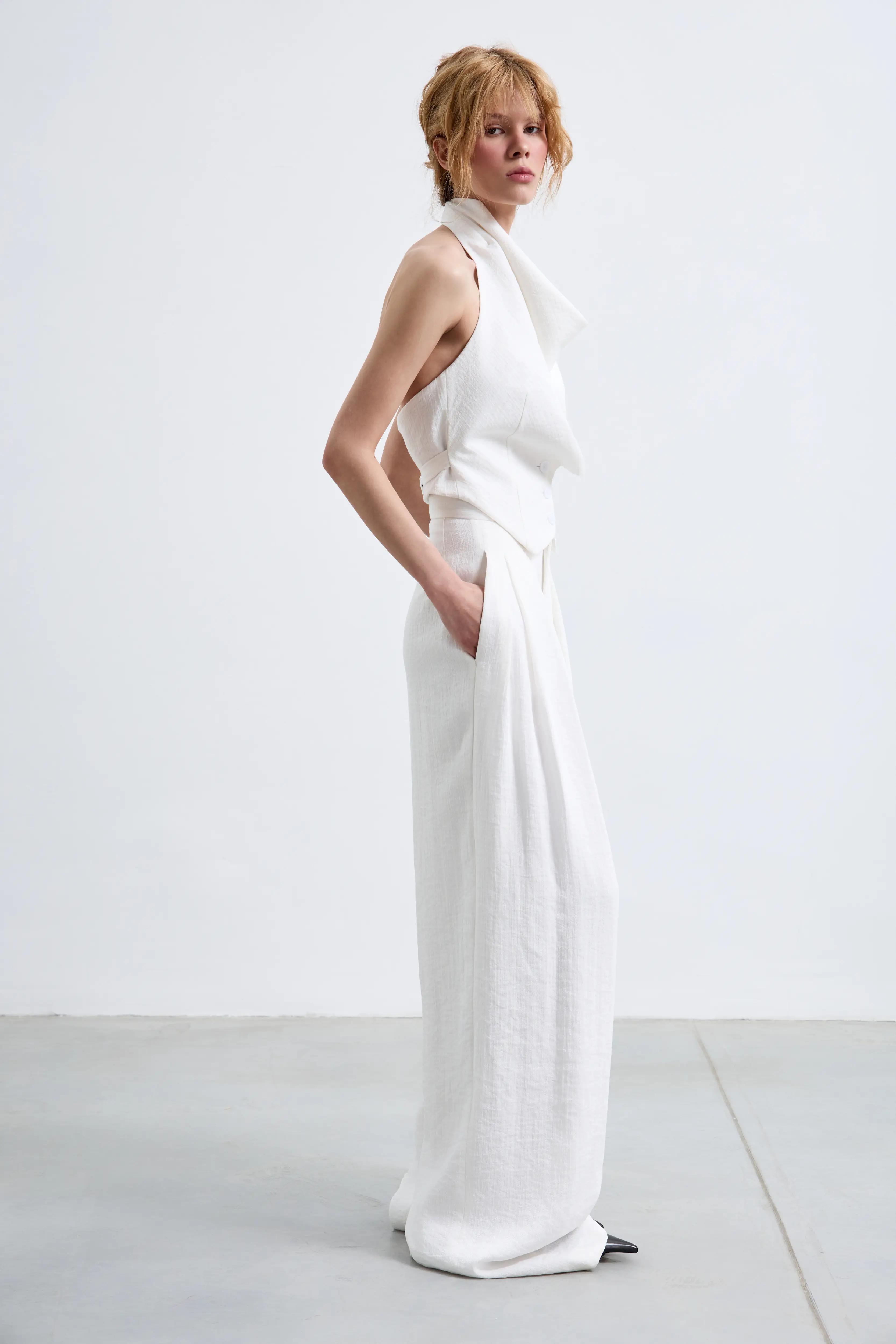 Воздушные брюки-palazzo, которые читаются как кутюрная база. Высокая посадка и мягкие защипы собирают талию и дают идеальную вертикаль. Ткань держит форму деликатно — без жёсткости — поэтому силуэт выглядит чисто и дорого в движении.