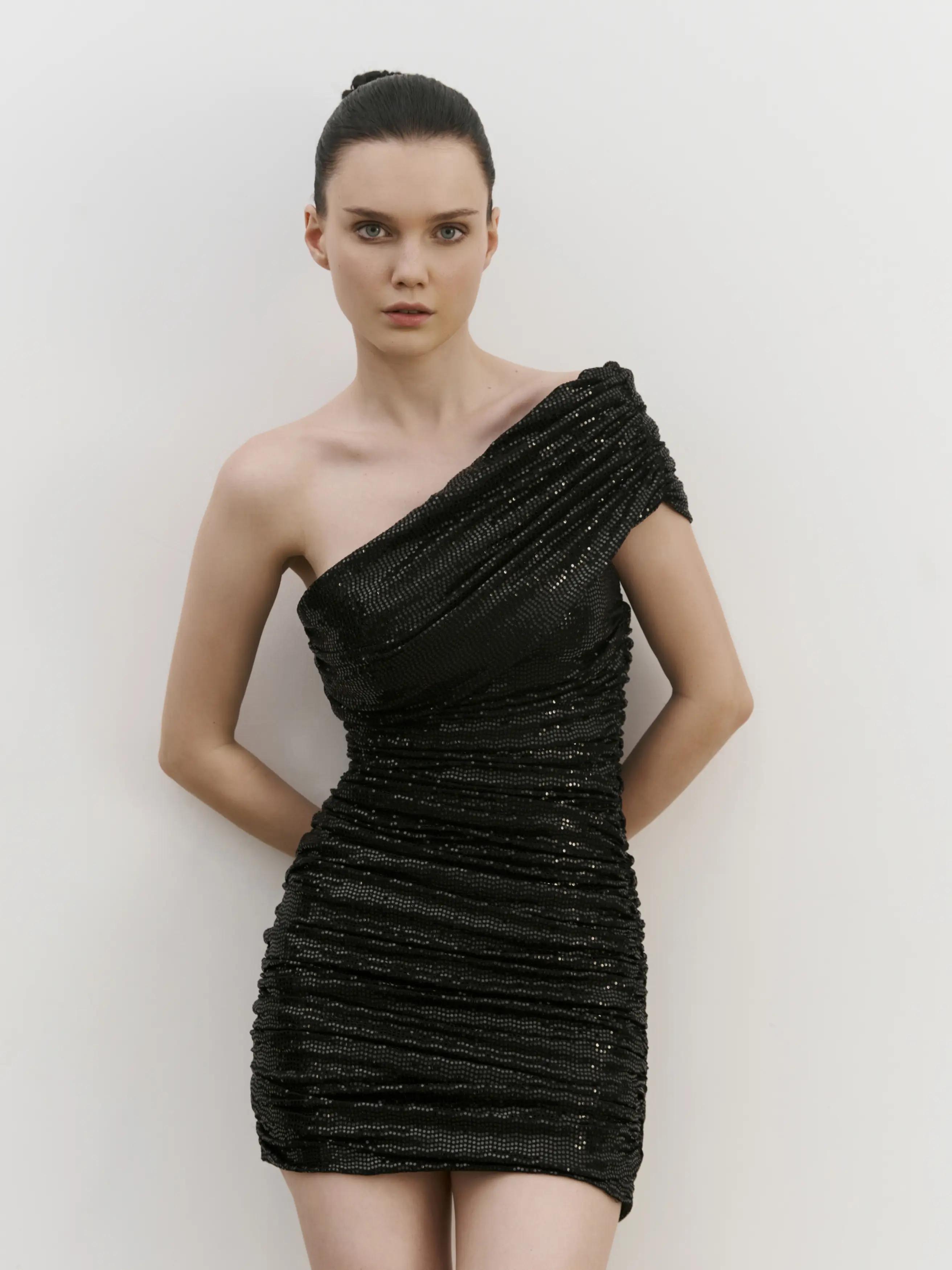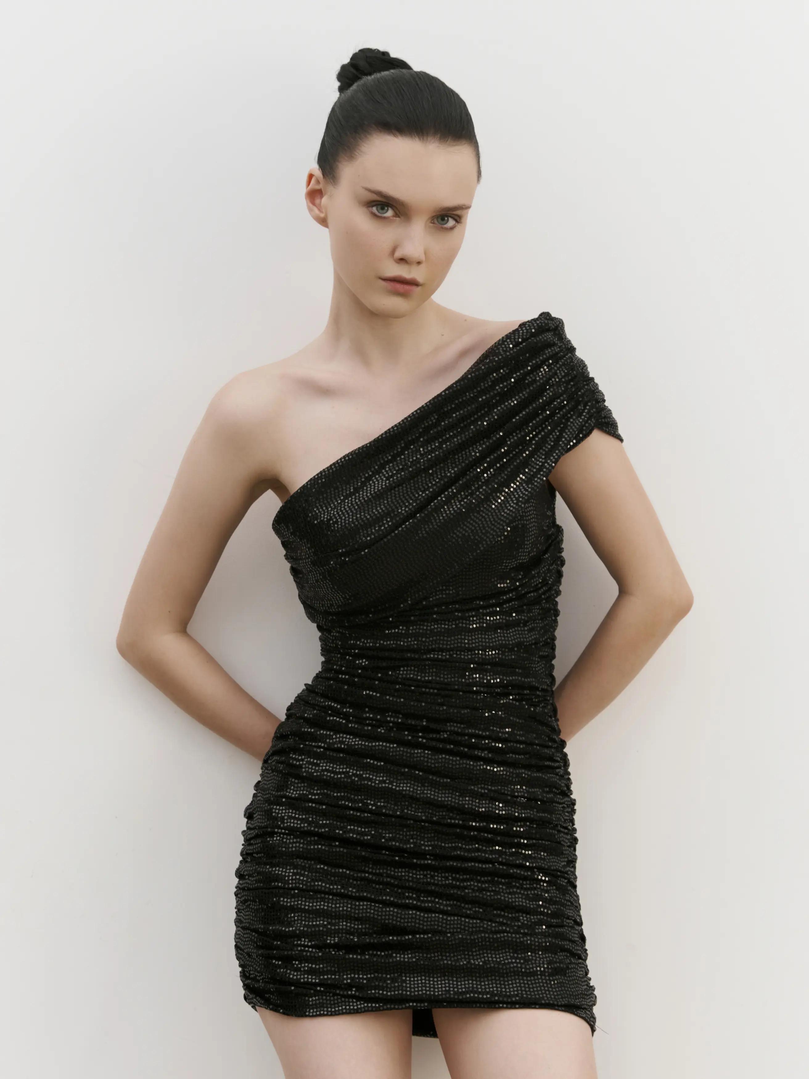 Платье на одно плечо с драпировкой: красиво сидит точно по фигуре подчеркивая формы и изгибы.
