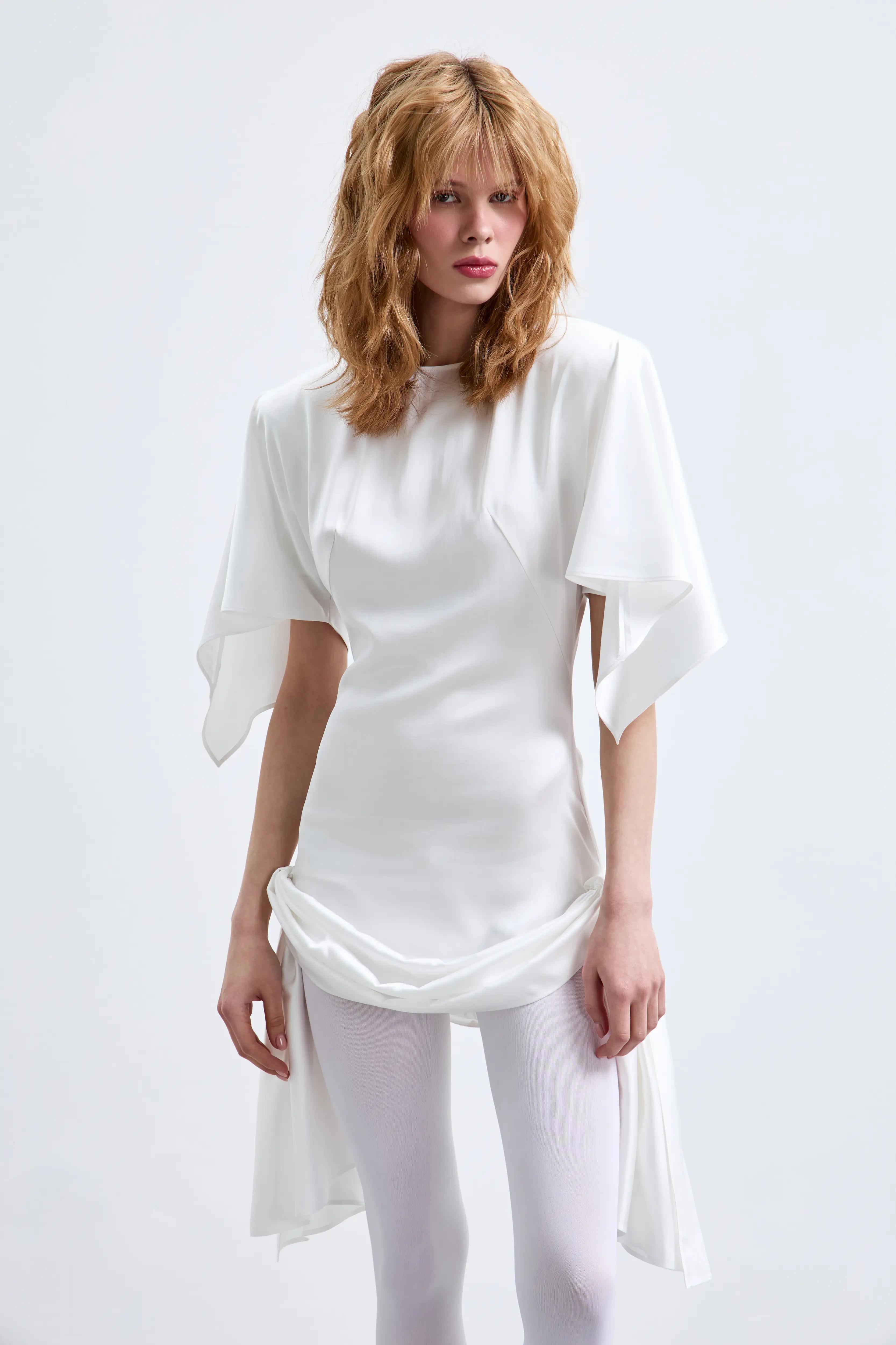 Флагманское платье от Phatemm, отображает стиль бренда. Модель с выразительными плечами, подчеркивает талию, необычный крой придает изделию уникальность.
