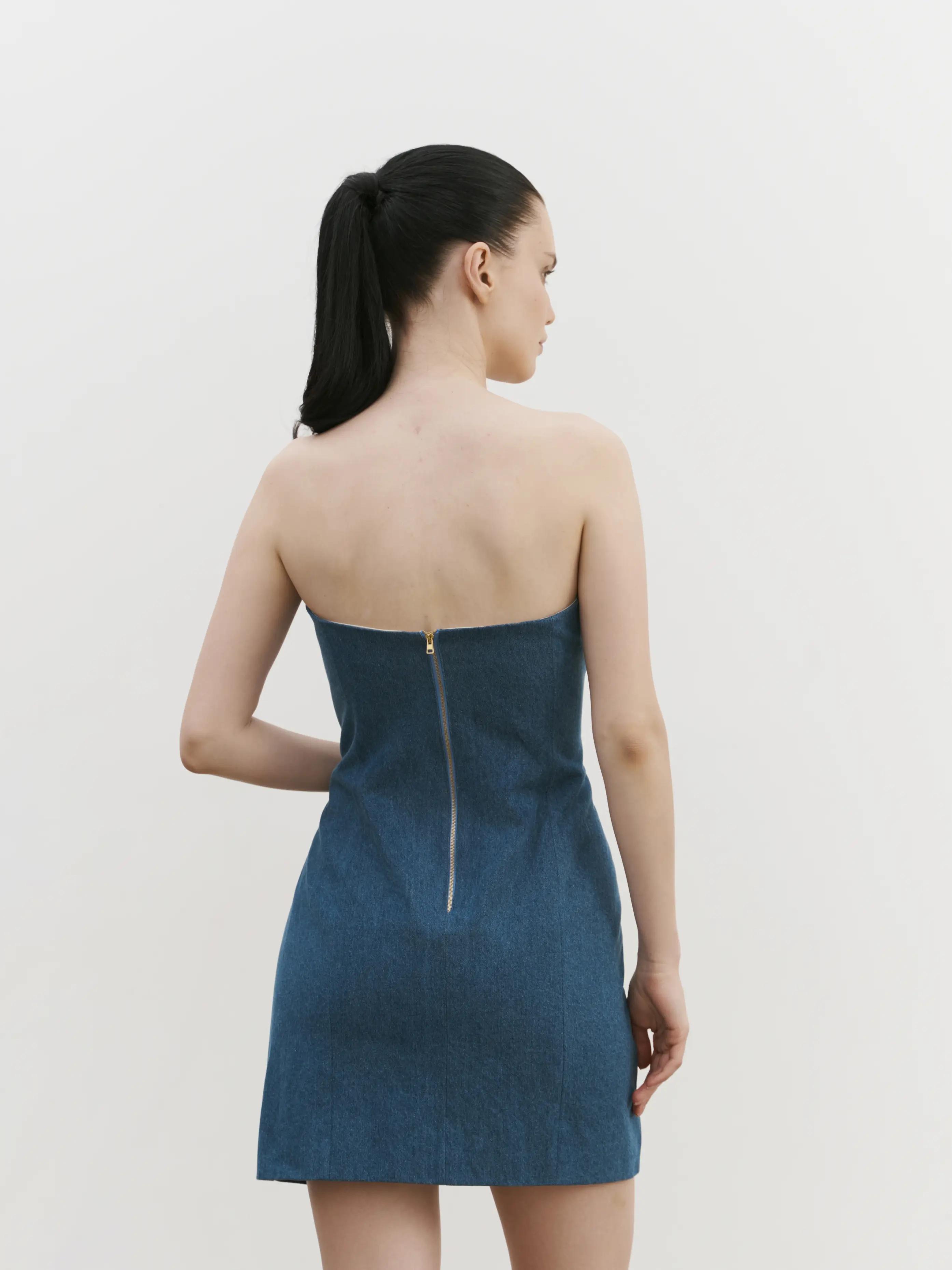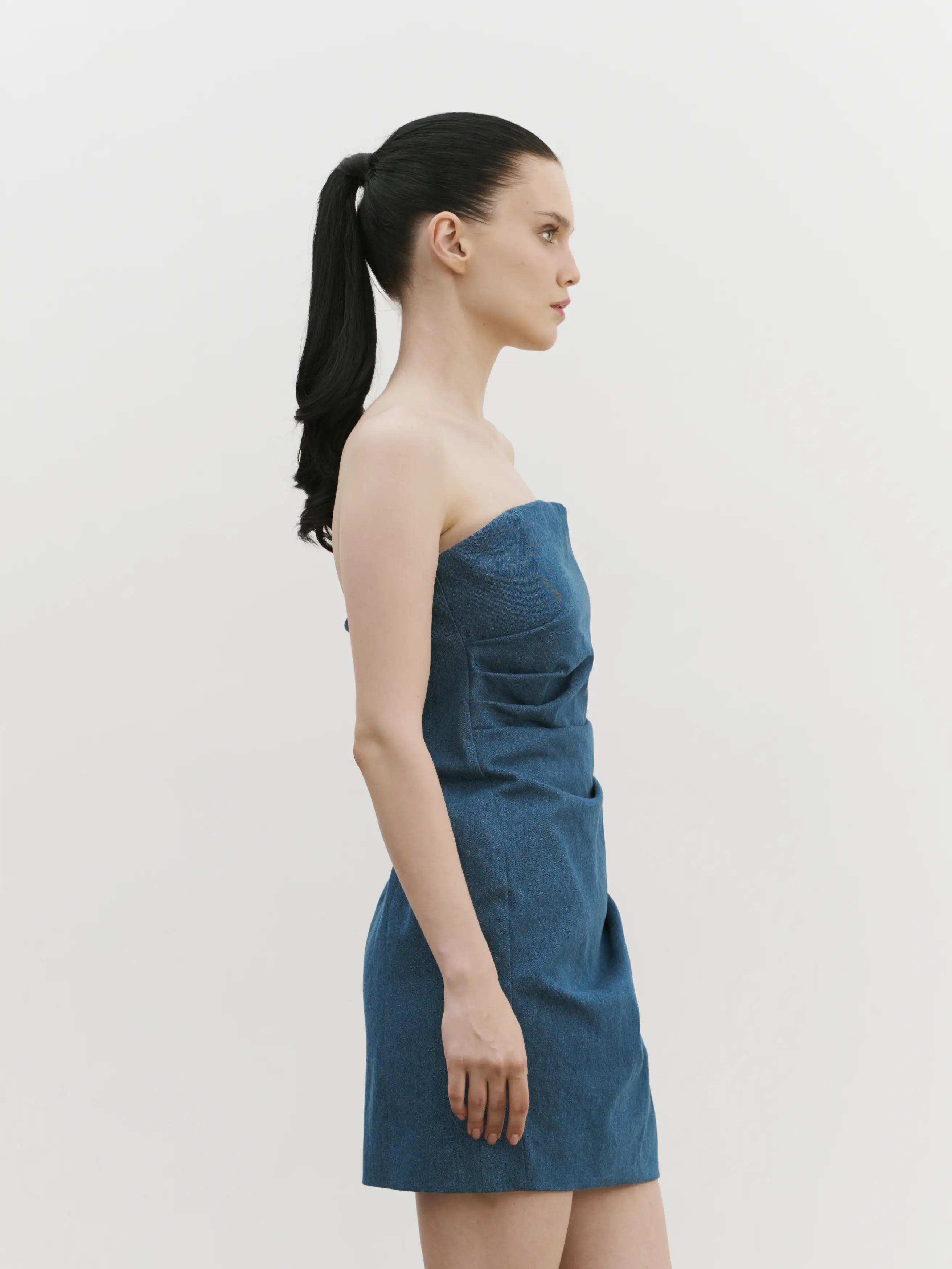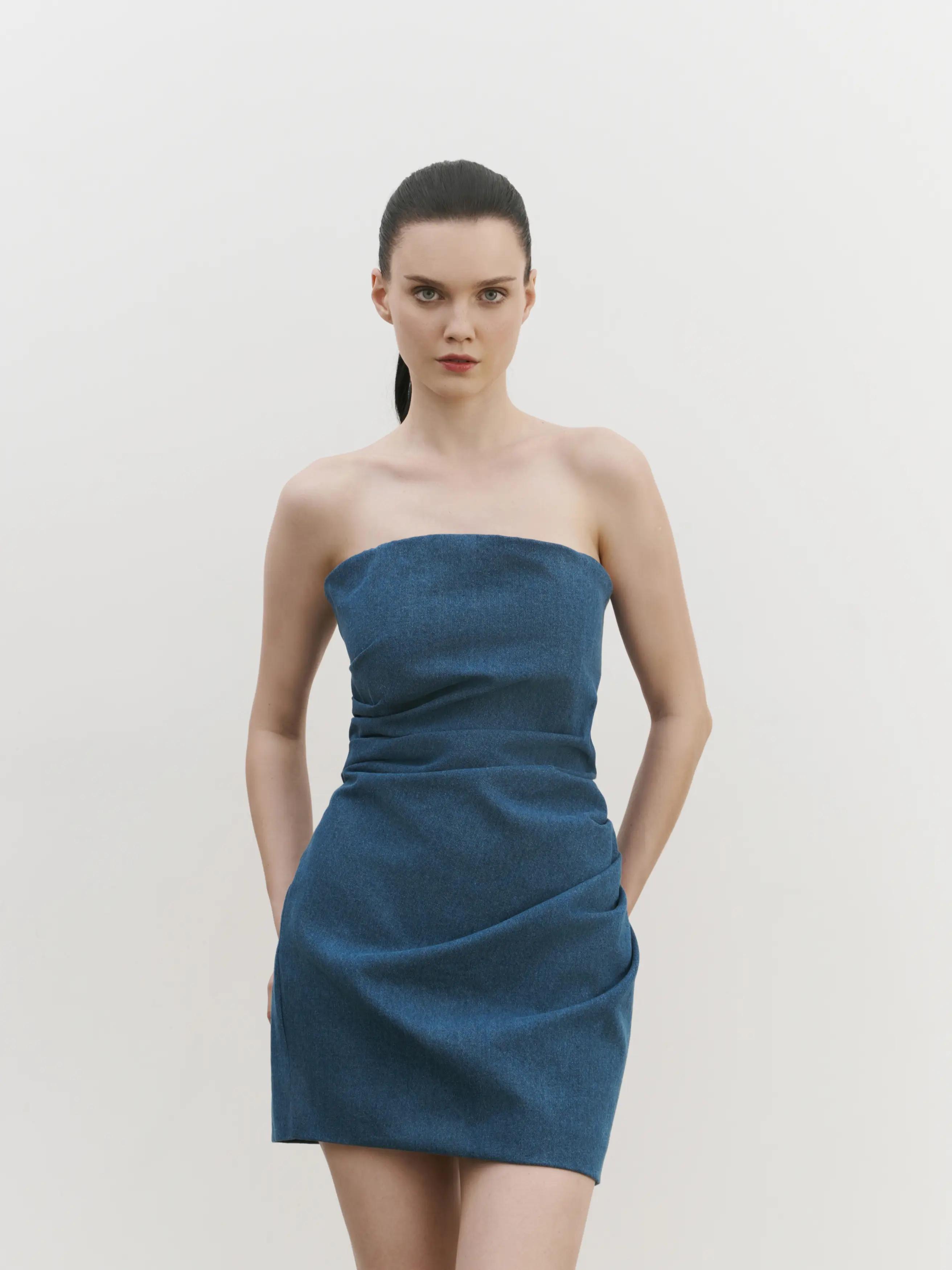 Коктейльное платье из денима: прилегающий силуэт, открытая линия плеча, драпировка. По линии выреза проложена силиконовая тесьма, которая обеспечивает лучшее прилегание.
