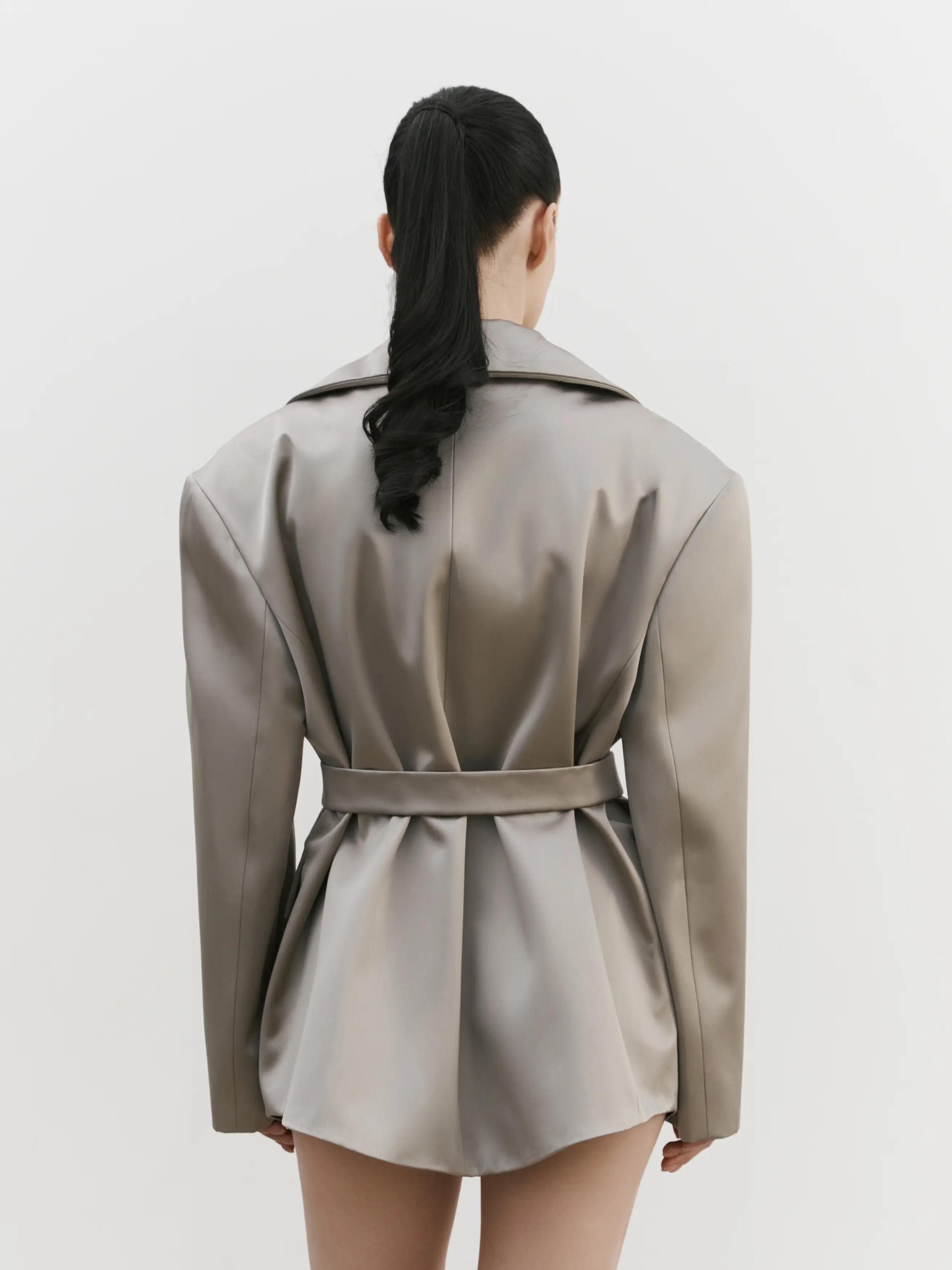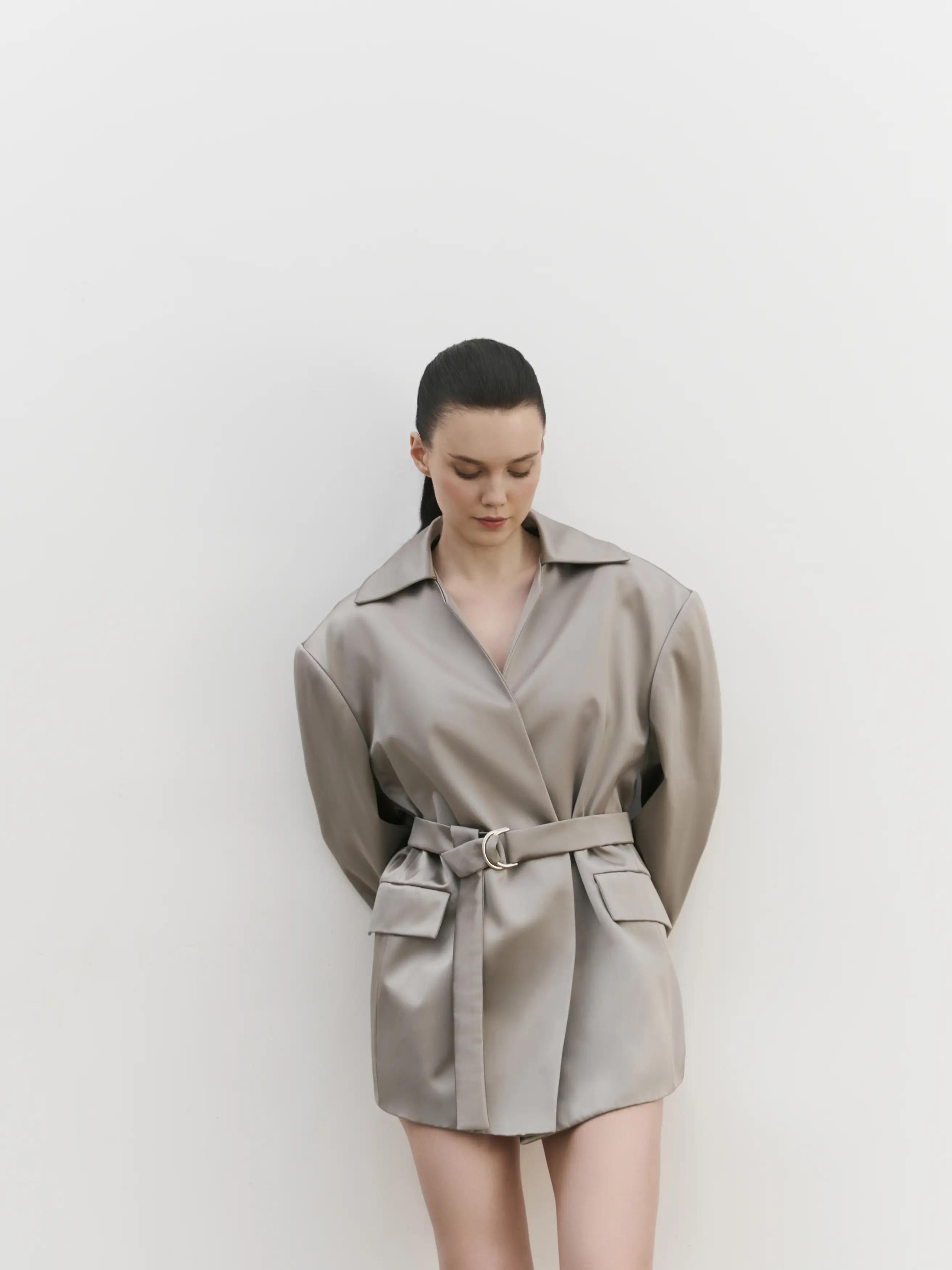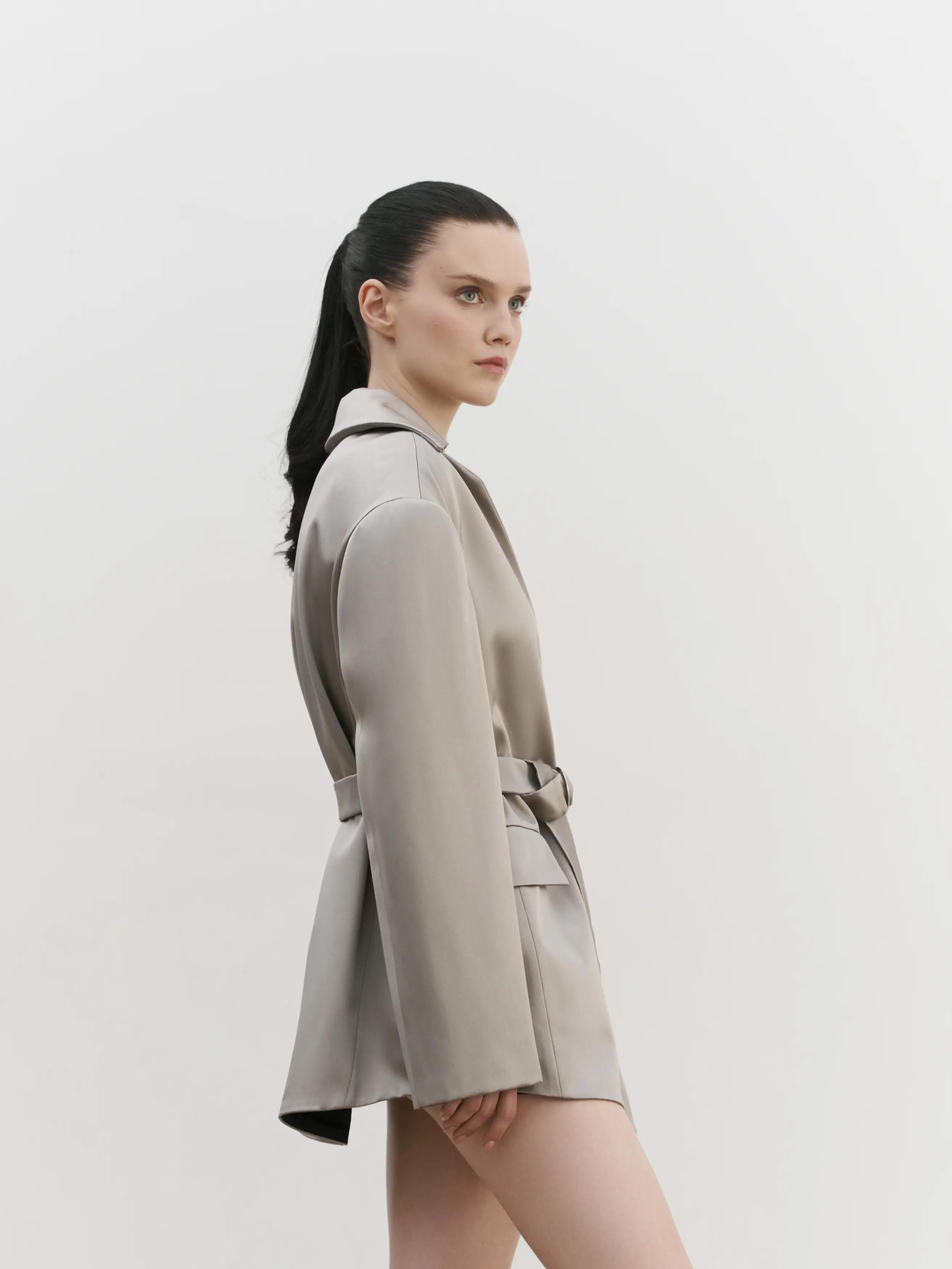 Объемный пиджак мужского кроя: спущенная линия плеча, застежка в виде пояса, пиджак выполнен из мягкого вискозного материала с шелком, изделие полностью на подкладе,