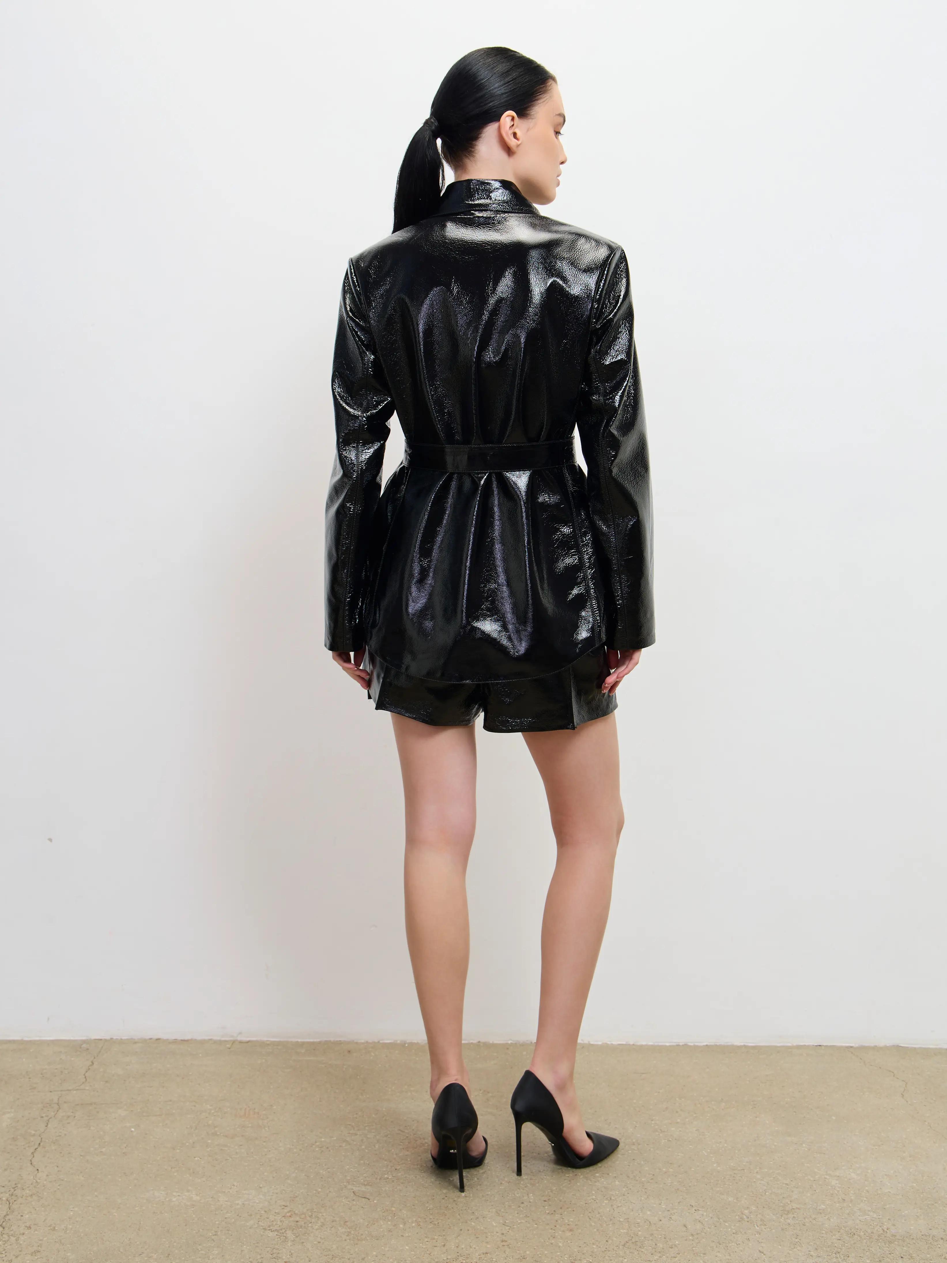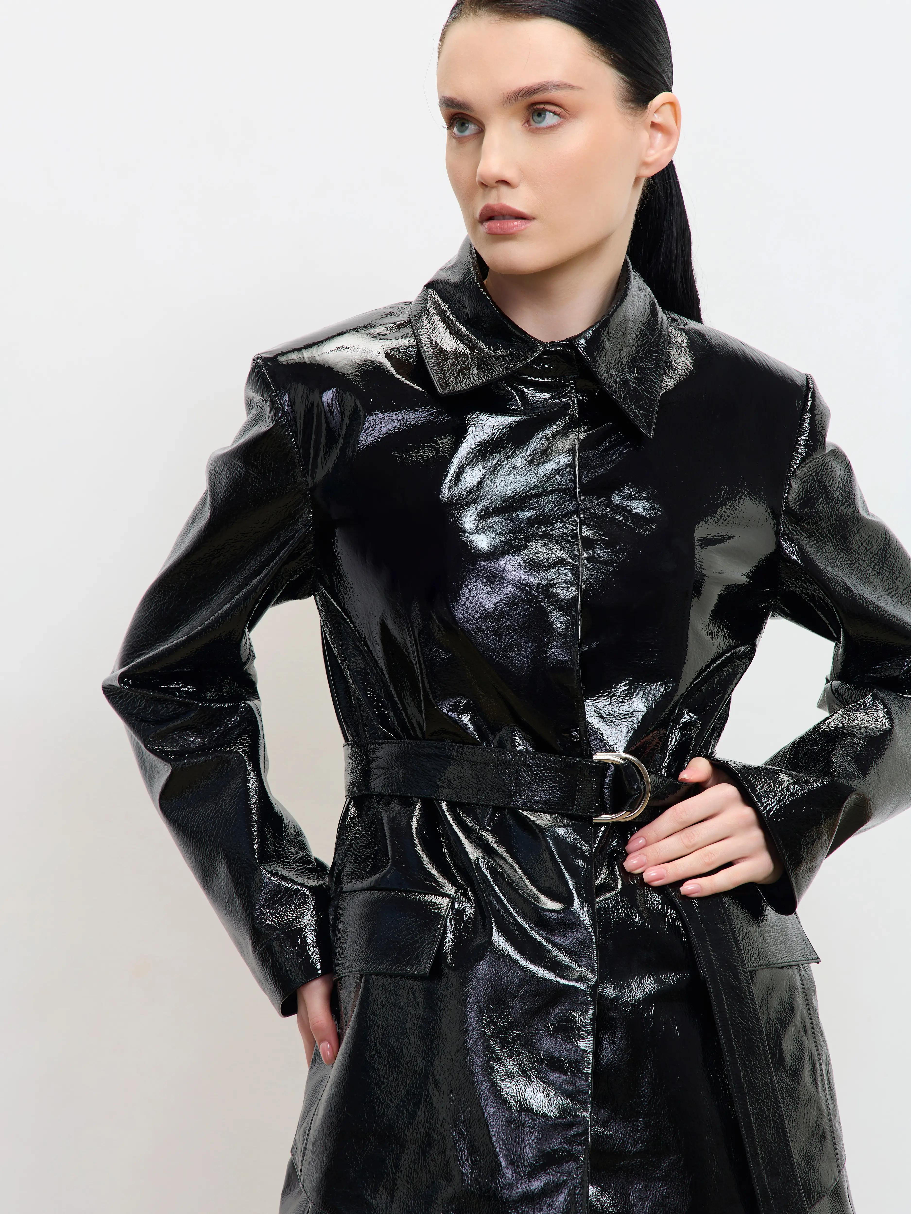 Лаковый пиджак из плотной натуральной итальянской кожи, низ изделия и ворот сшит по подобию рубашки. В комплекте также идет пояс.
