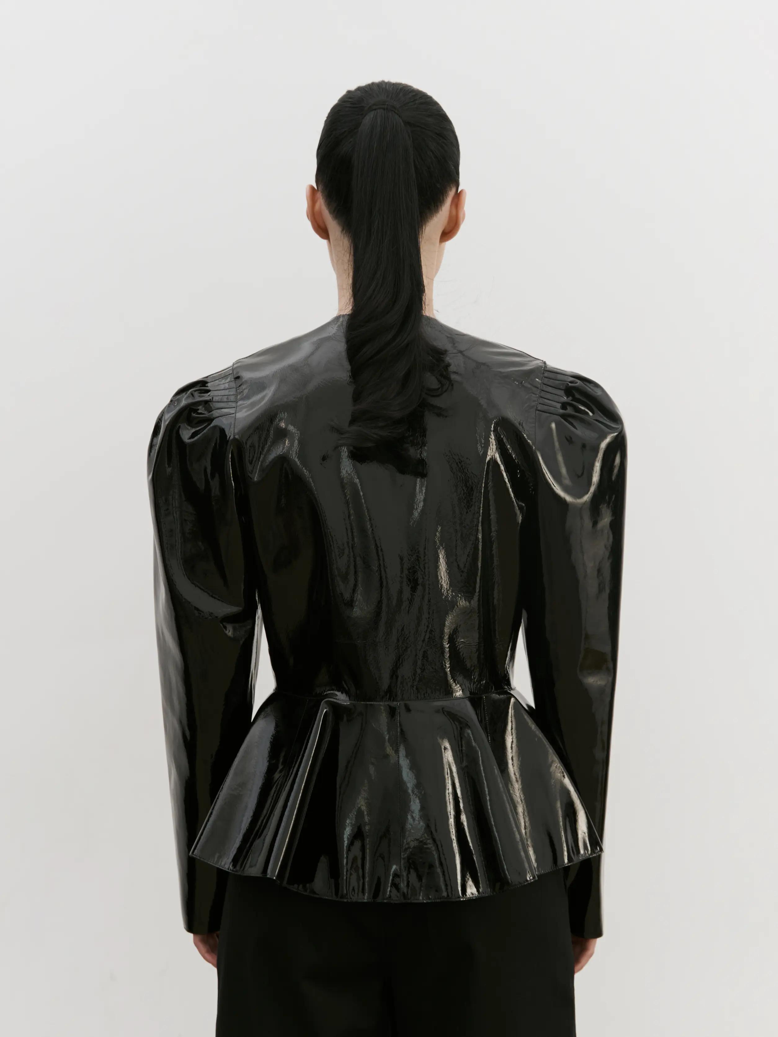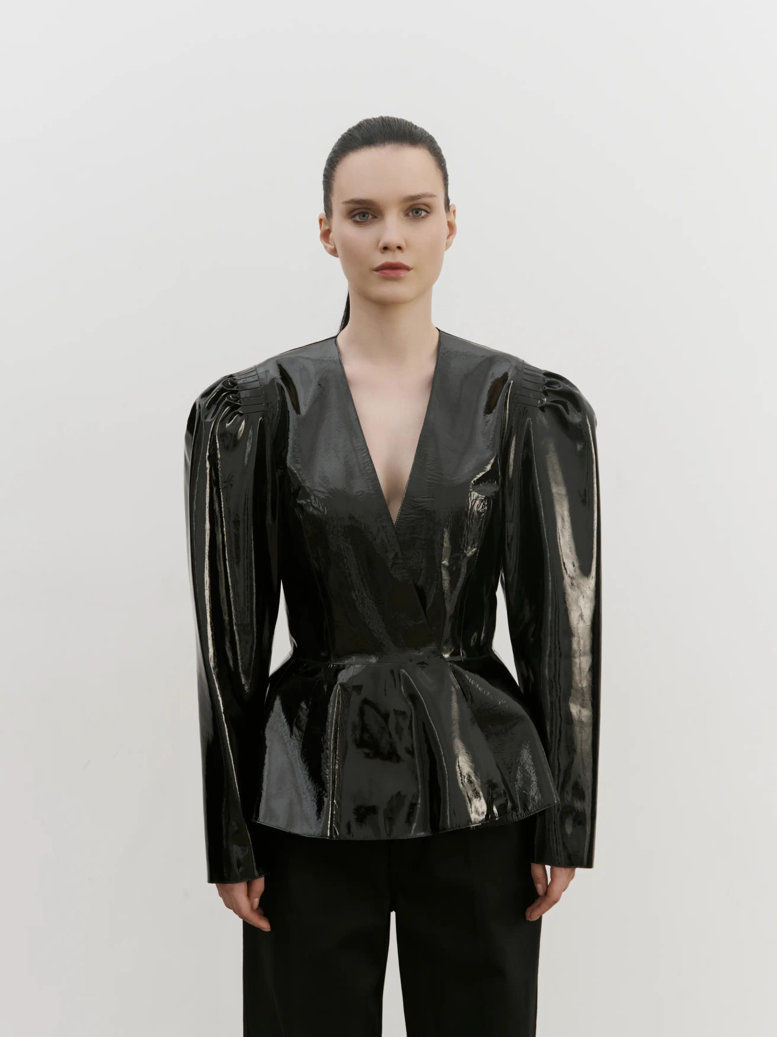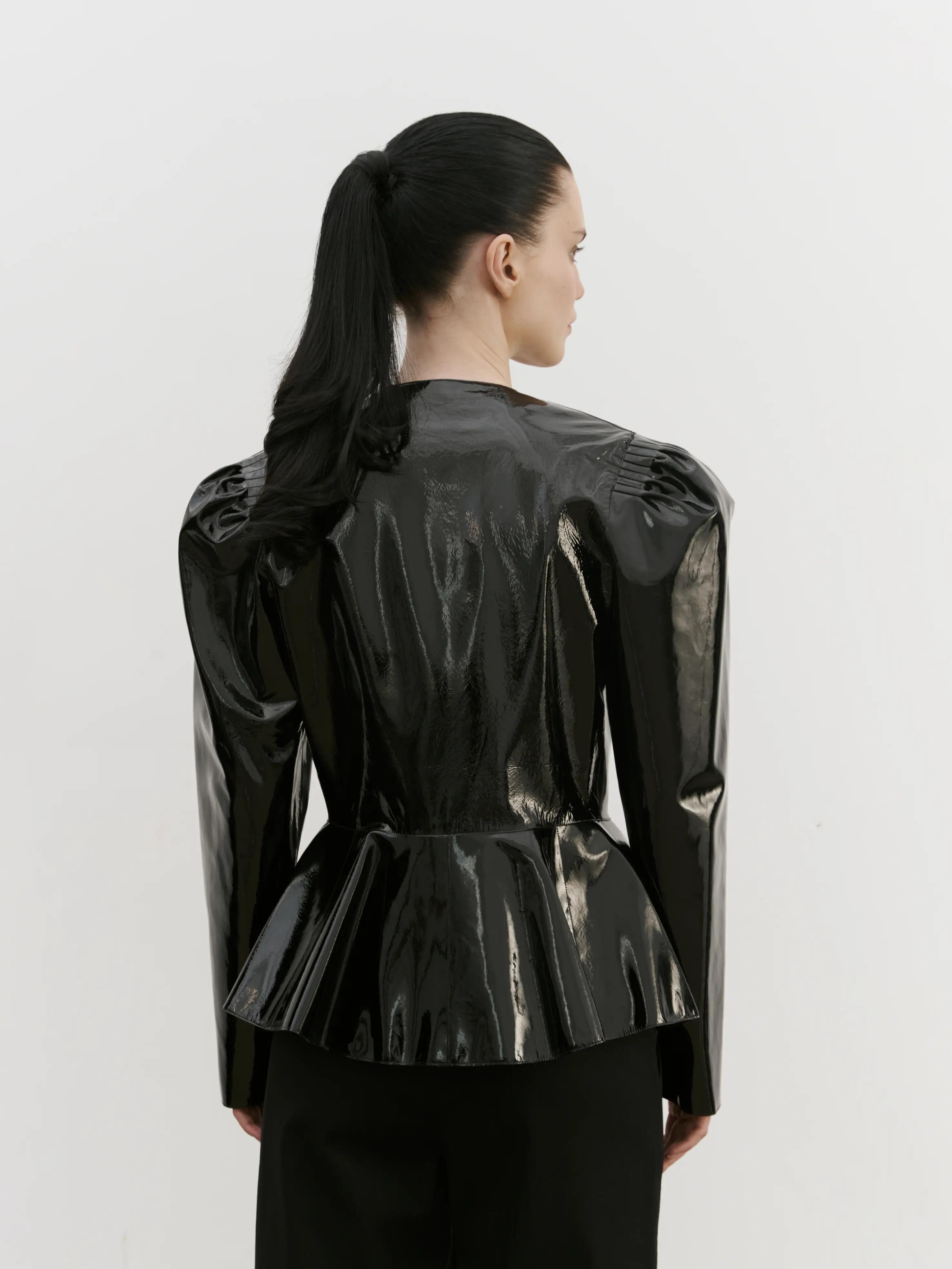 Лаковый пиджак с баской на застежке, модель с объемными плечами. Выполнен из плотной, лаковой итальянской кожи.