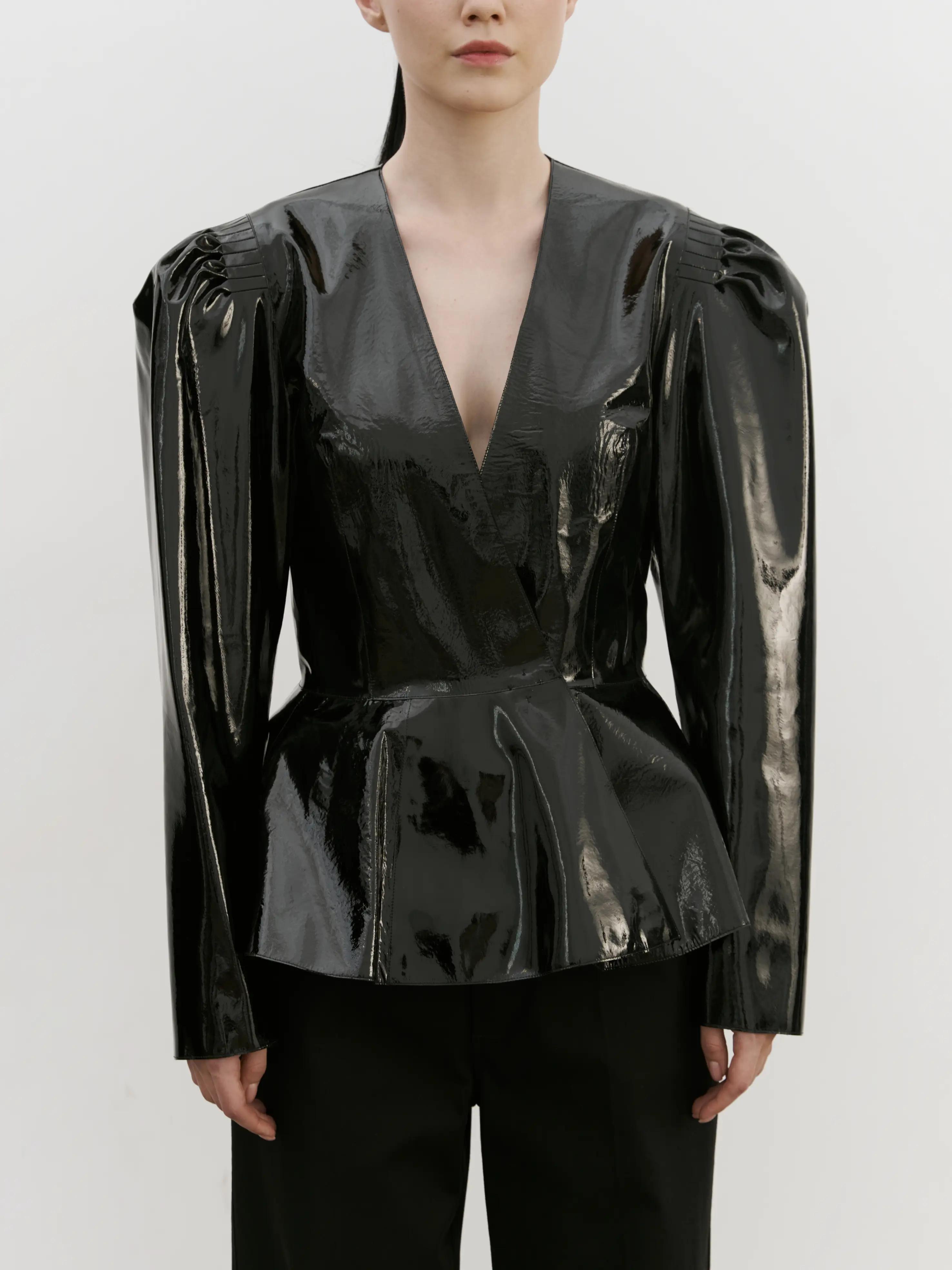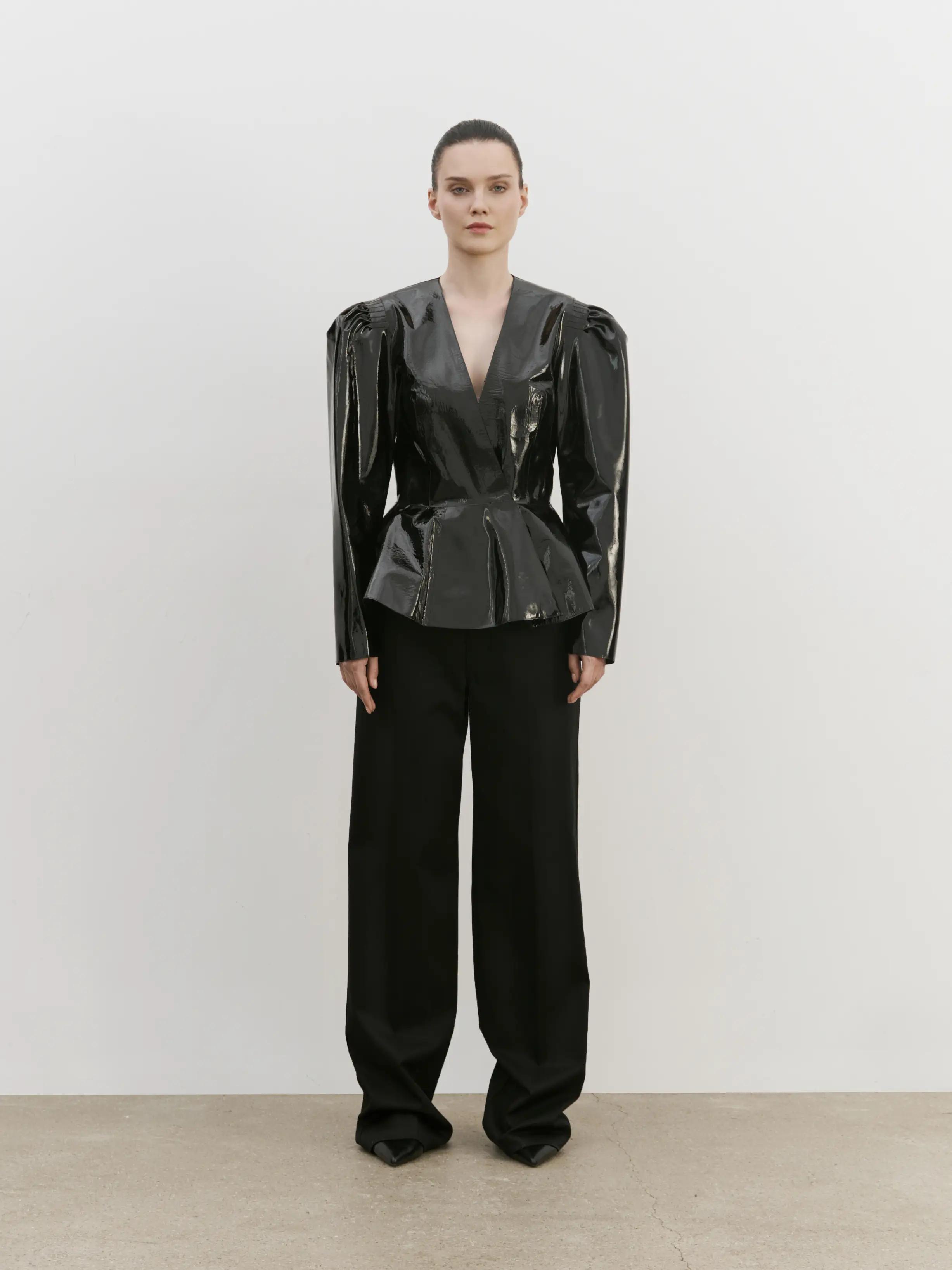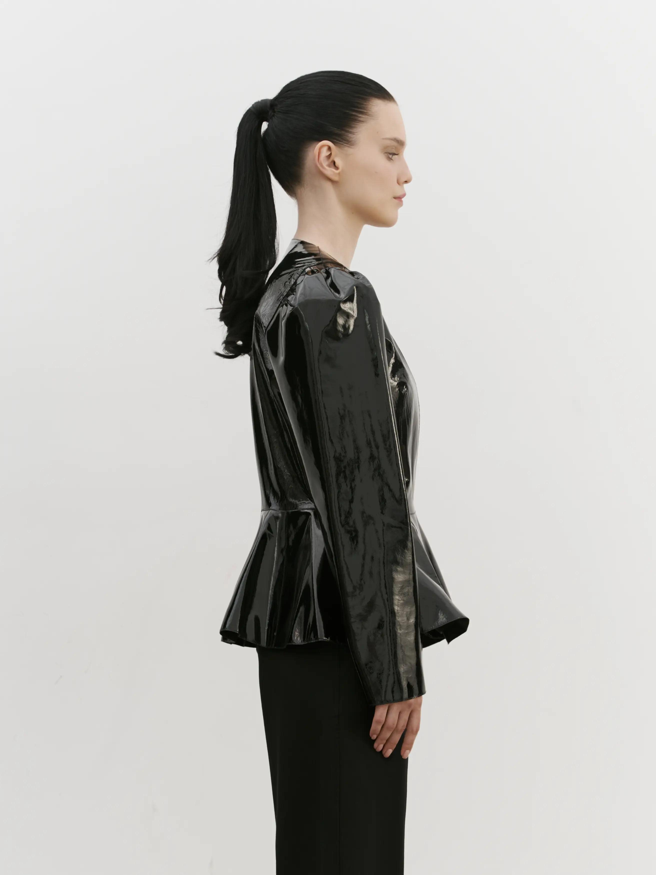 Лаковый пиджак с баской на застежке, модель с объемными плечами. Выполнен из плотной, лаковой итальянской кожи.