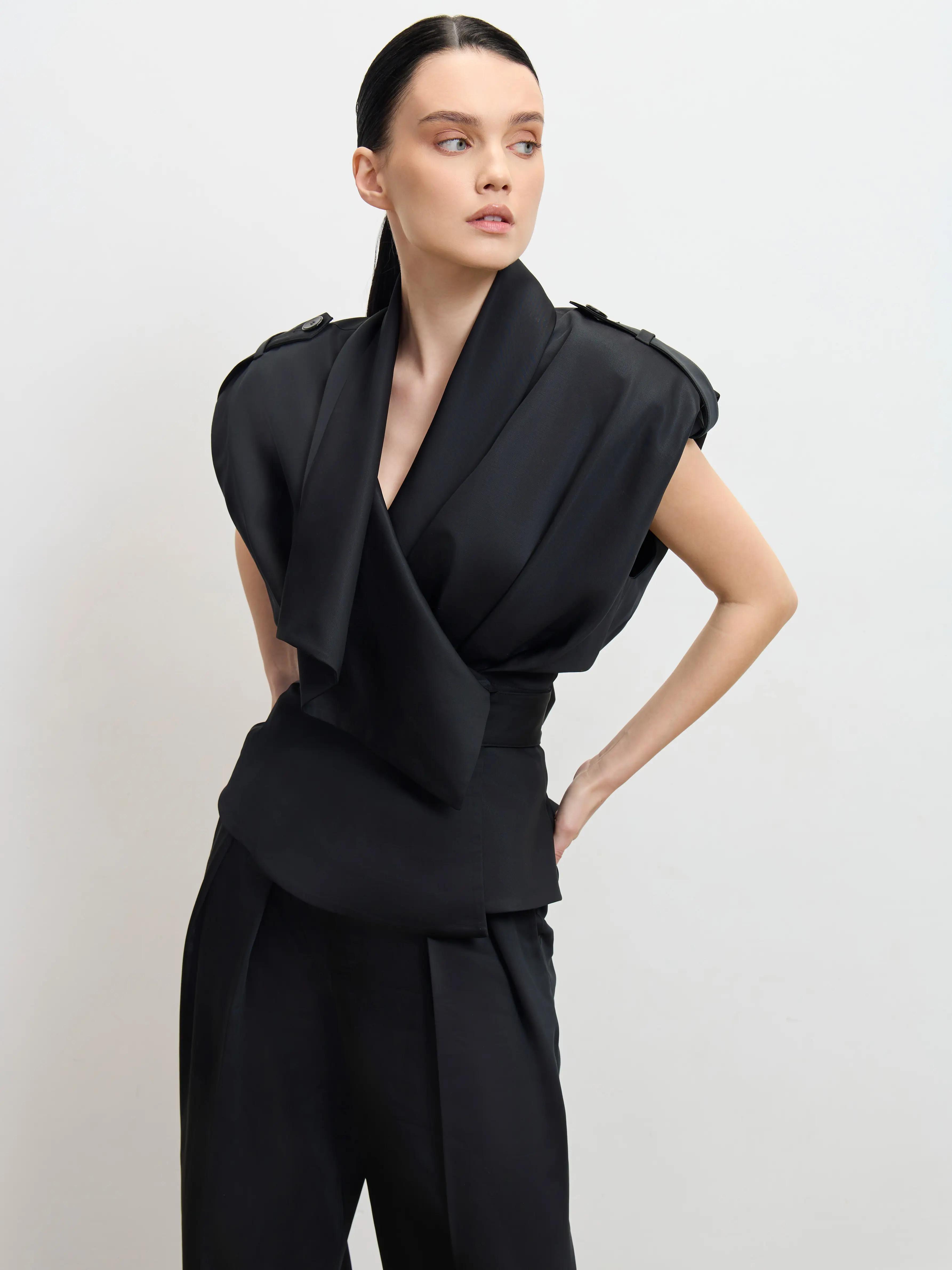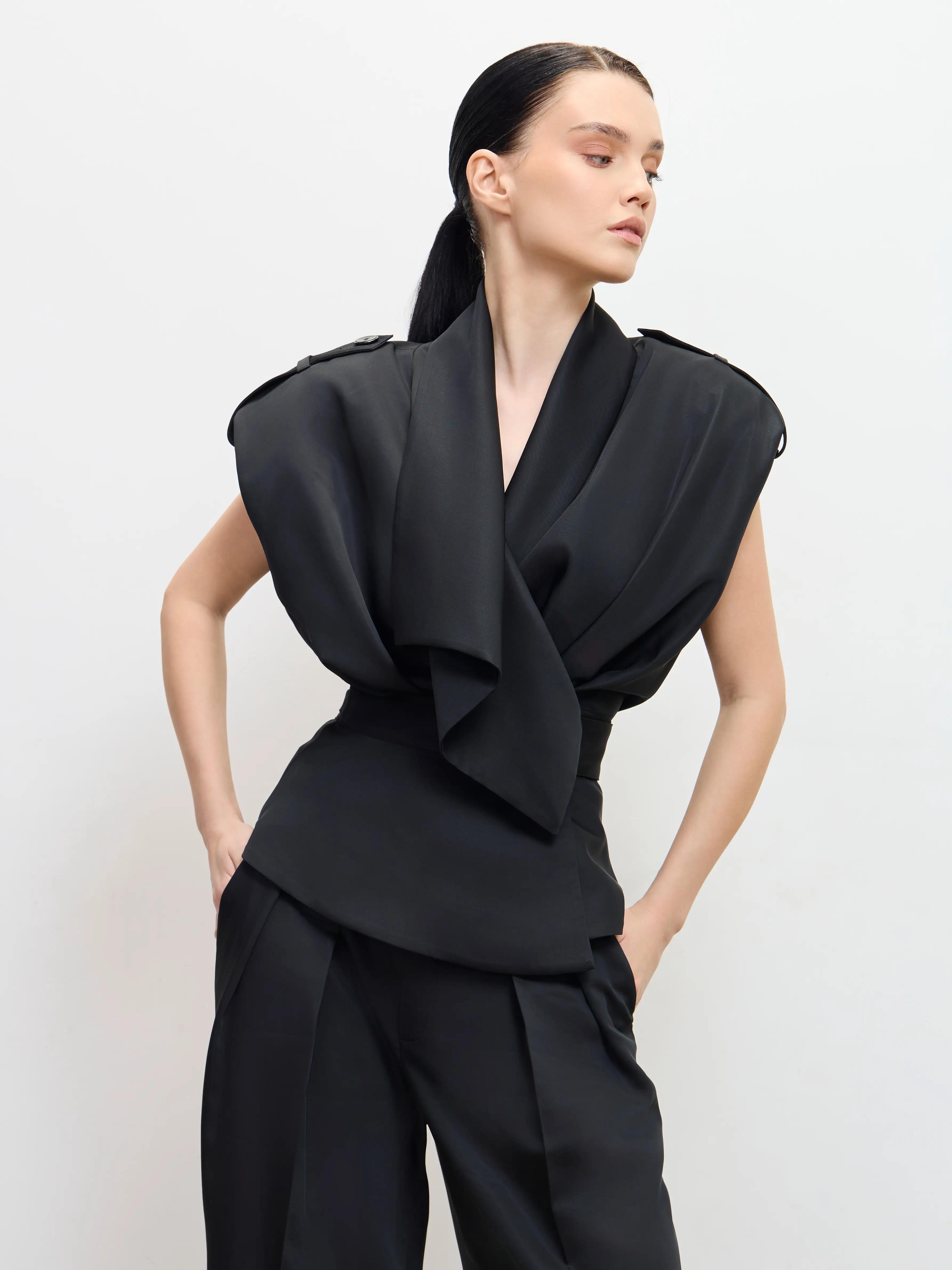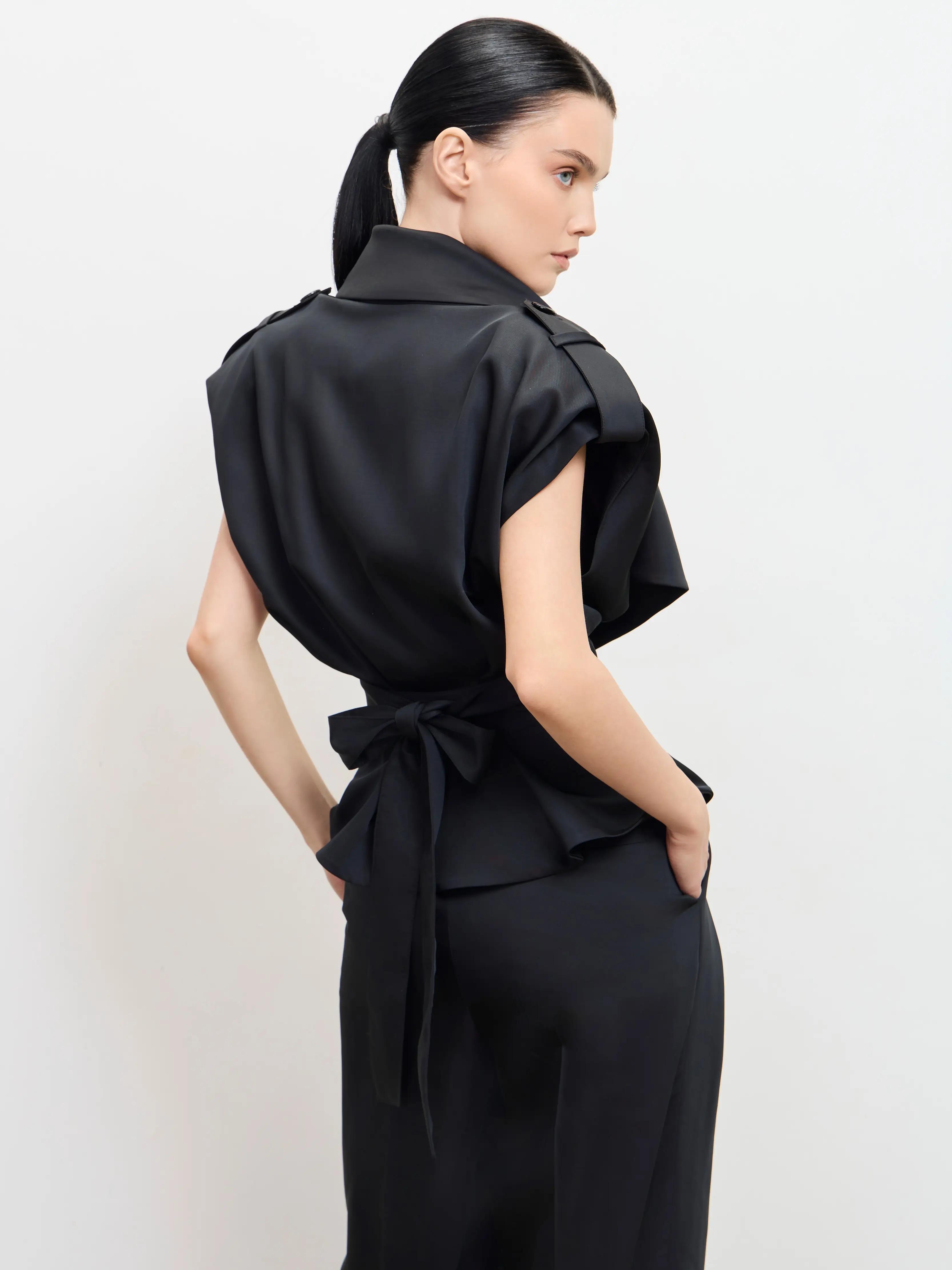 Жилет с объемными плечами: модель футуристичного дизайна, баска, пояс завязывается на талии.
