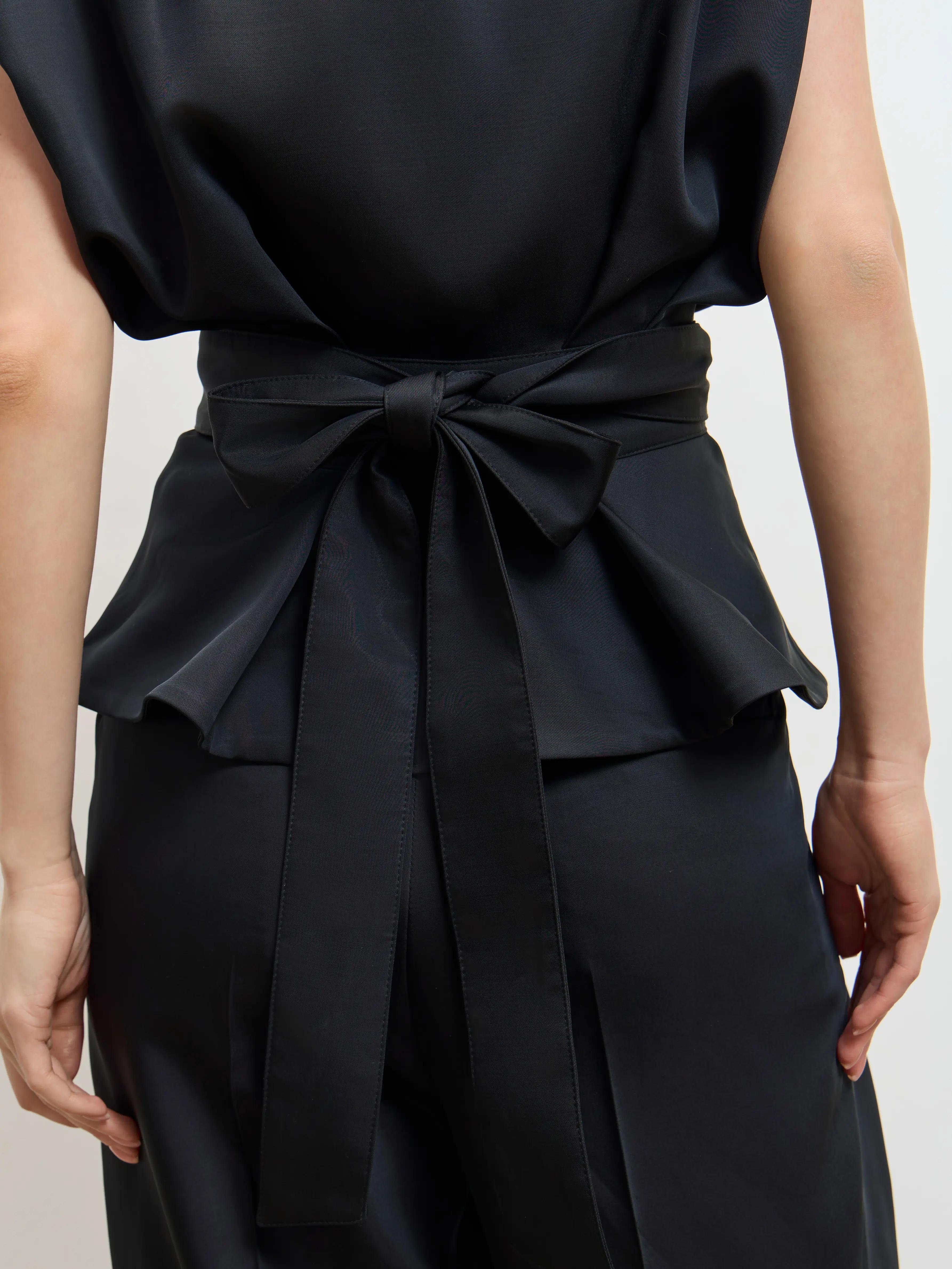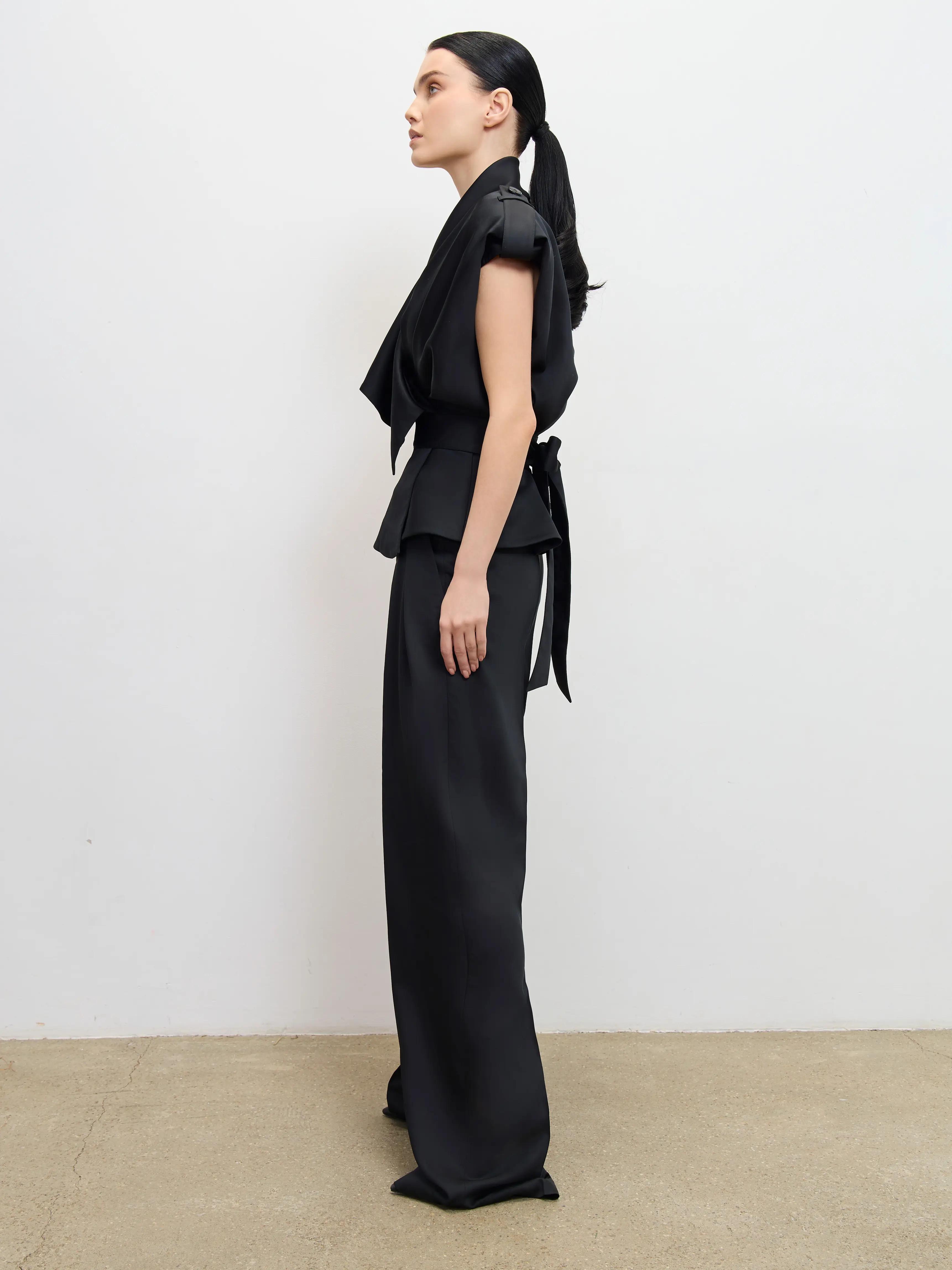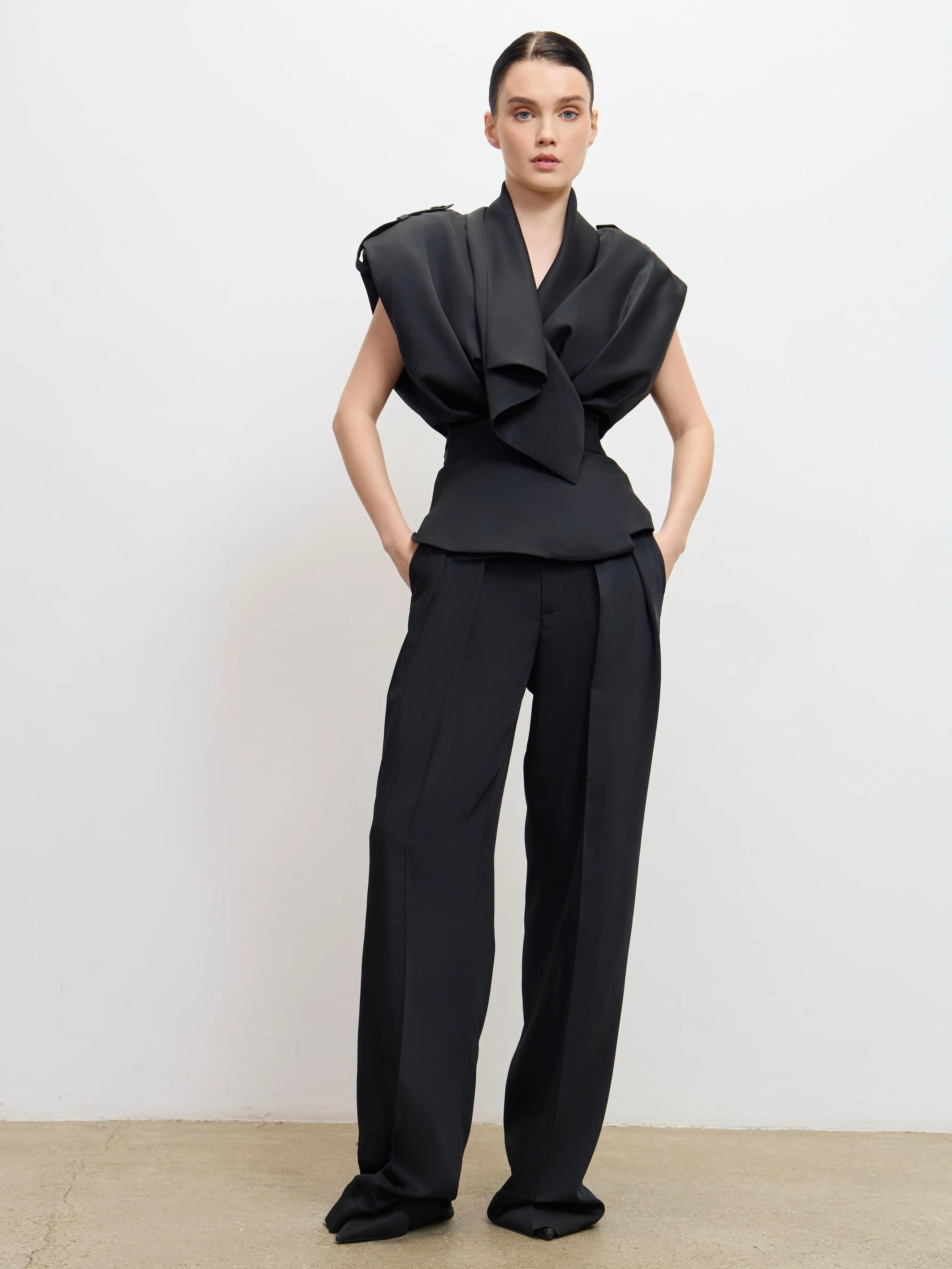 Жилет с объемными плечами: модель футуристичного дизайна, баска, пояс завязывается на талии.