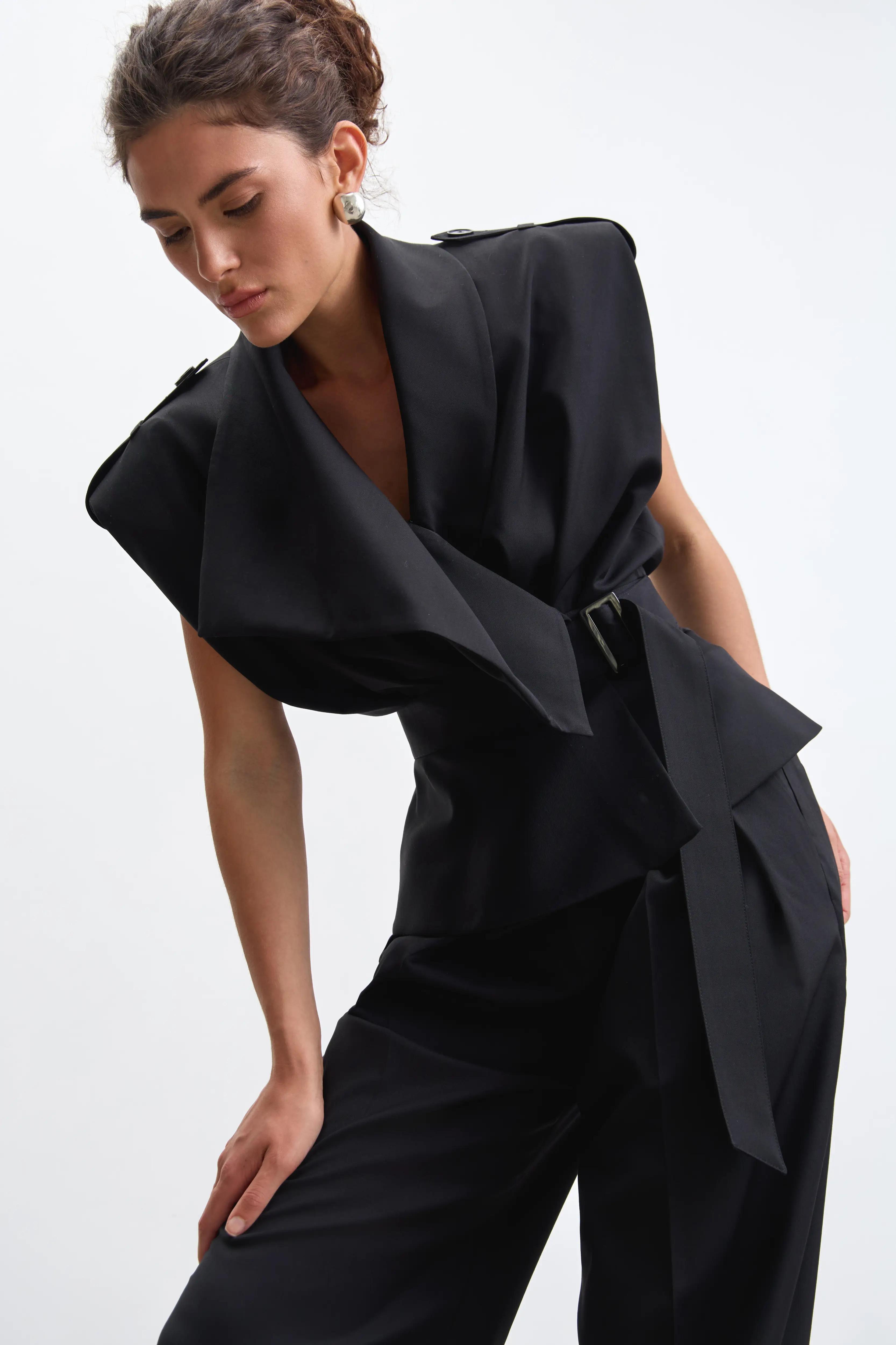 Архитектурный крой и отточенные линии делают модель мгновенно узнаваемой: жилет подчёркивает силуэт «песочные часы», а глубокий насыщенный чёрный оттенок добавляет лаконичности и строгого шика.