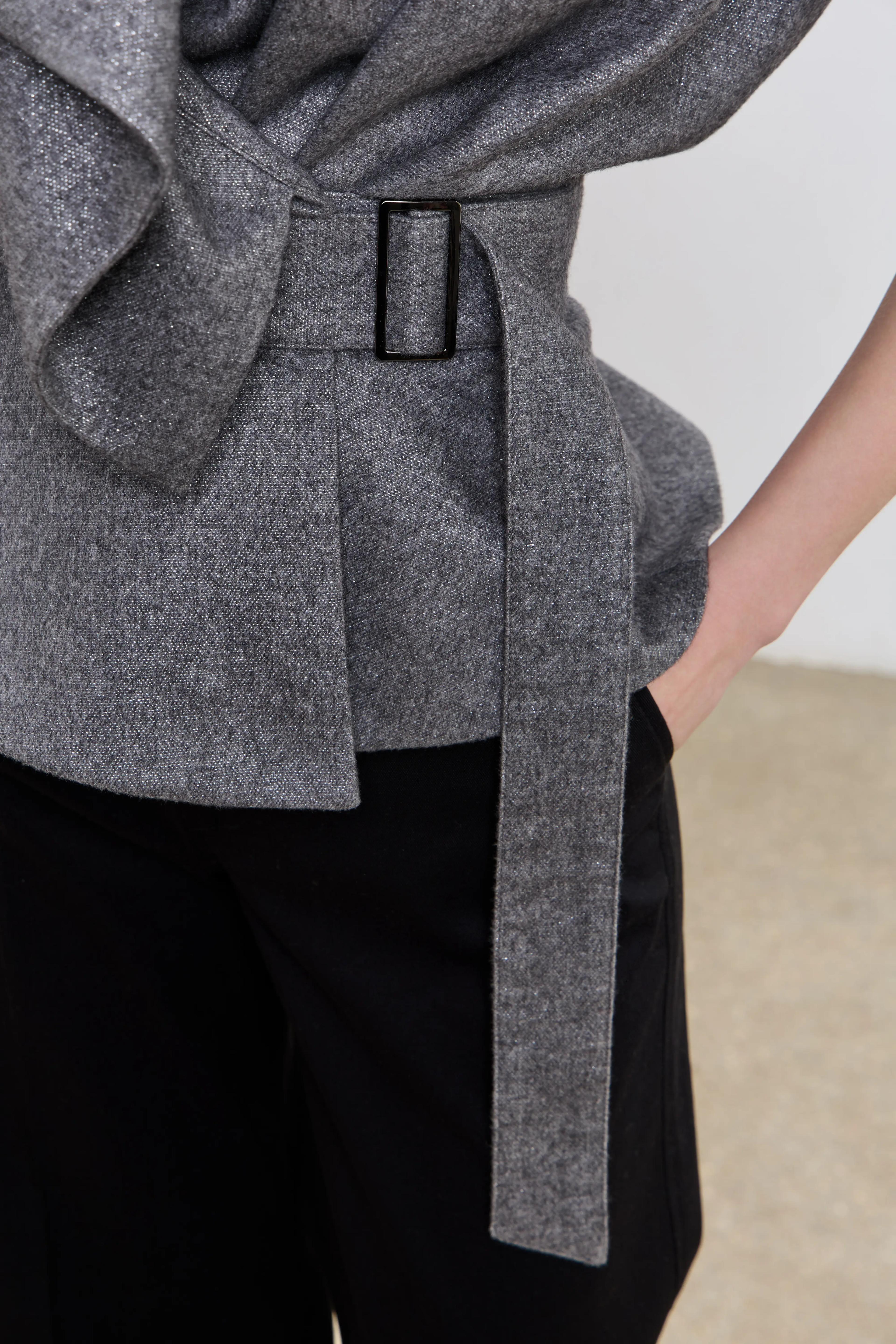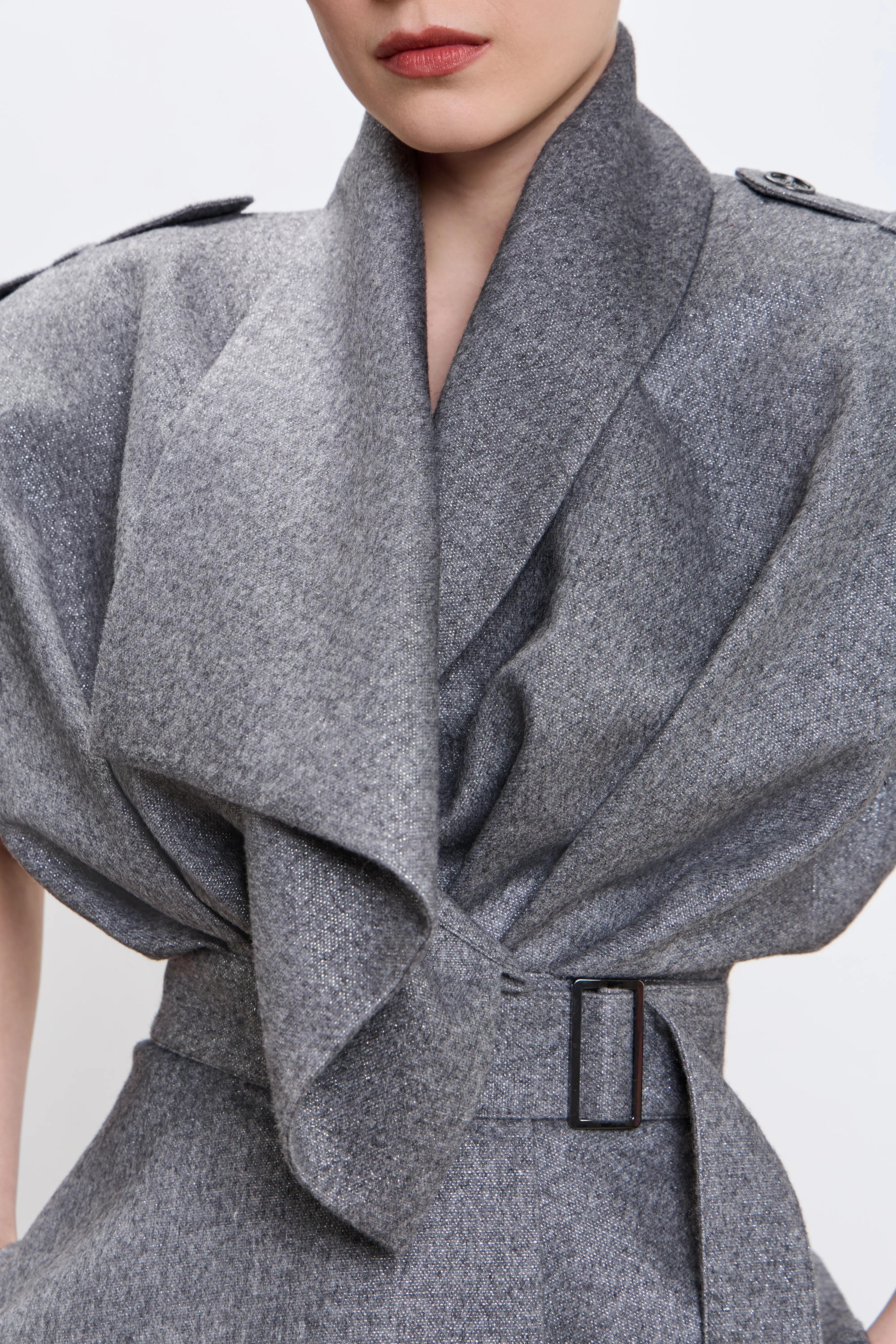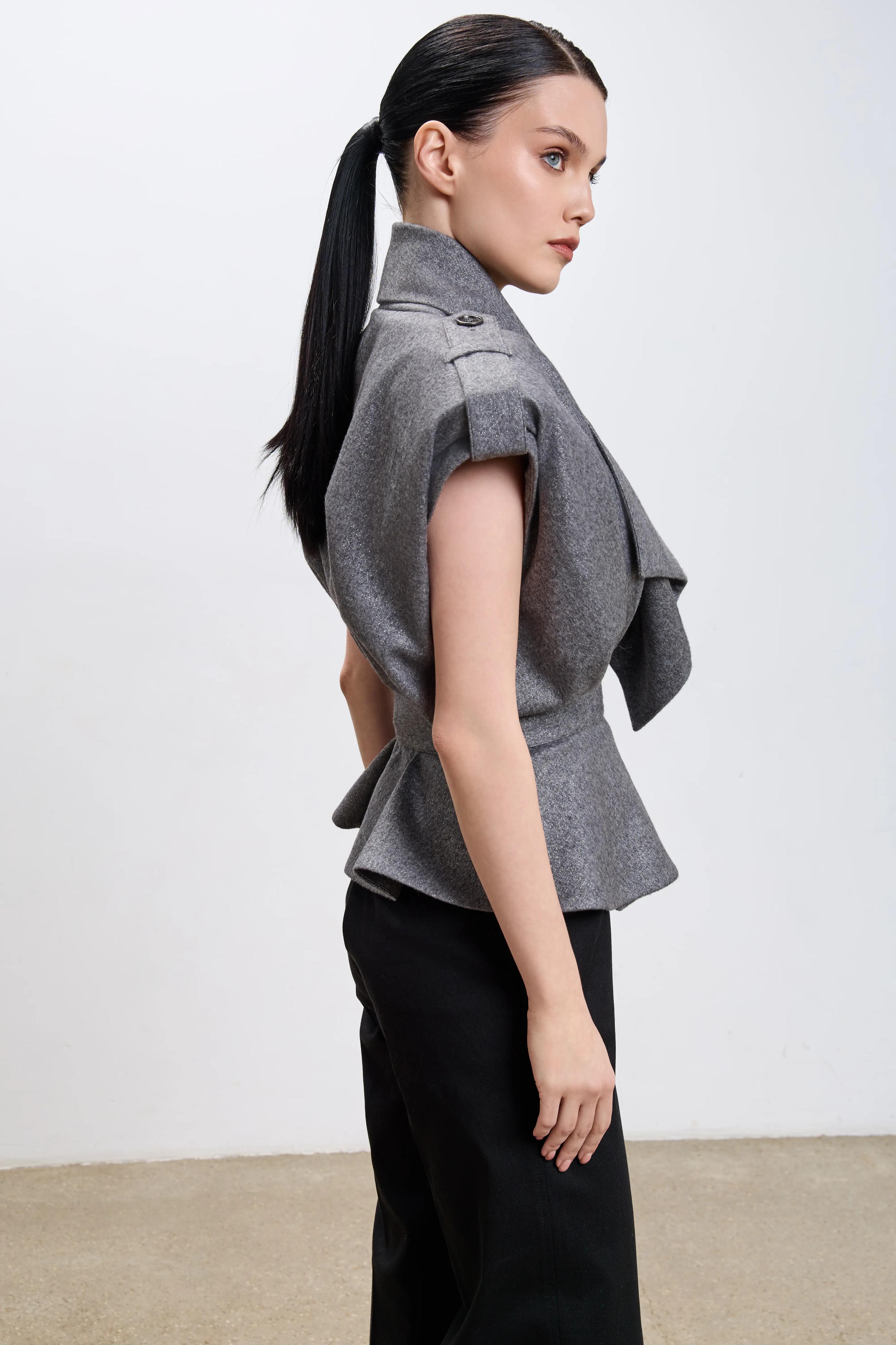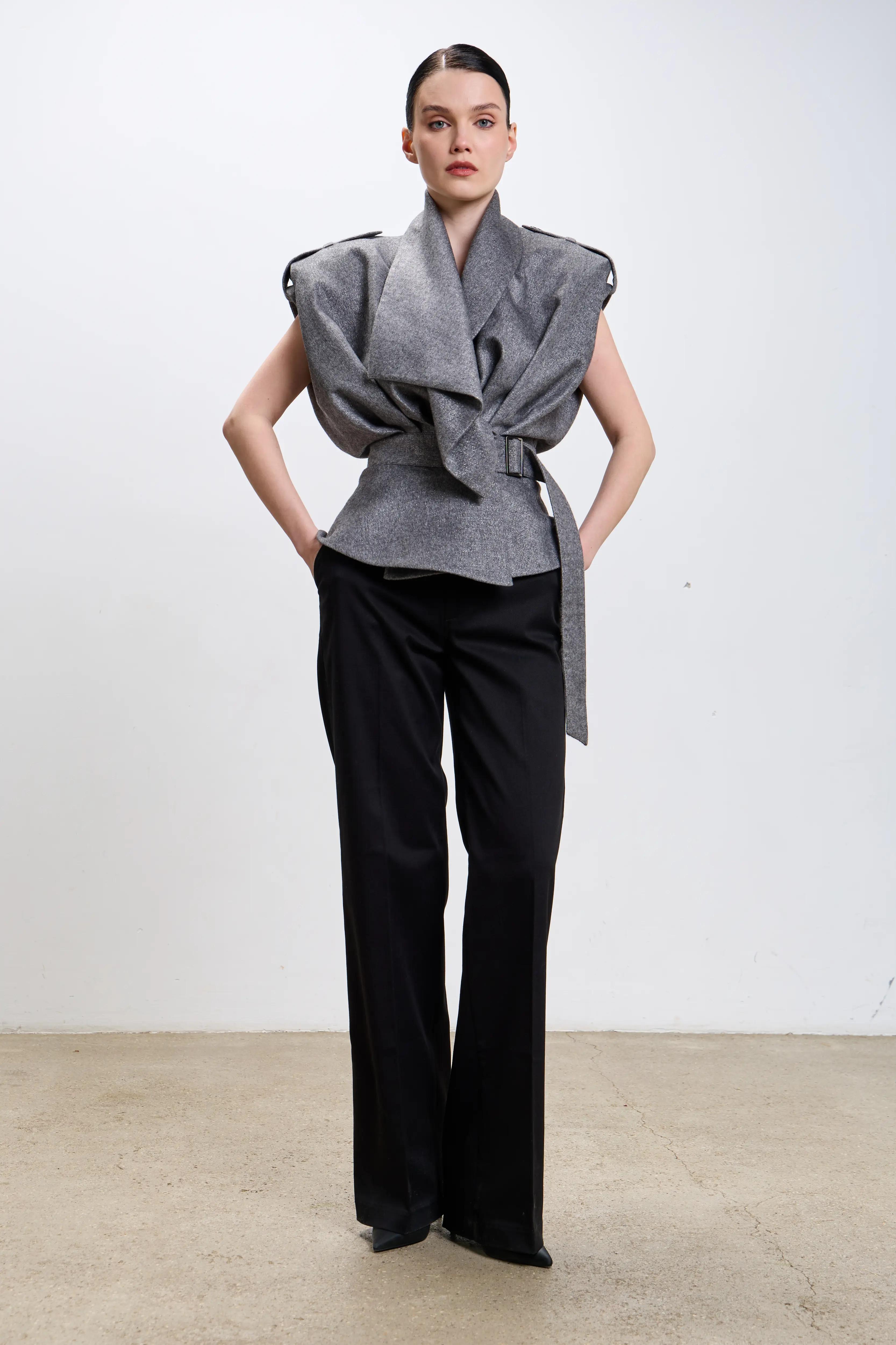 Визитная карточка бренда- жилет с объёмными плечами, выполнен из мягкого материала с кашемиром.