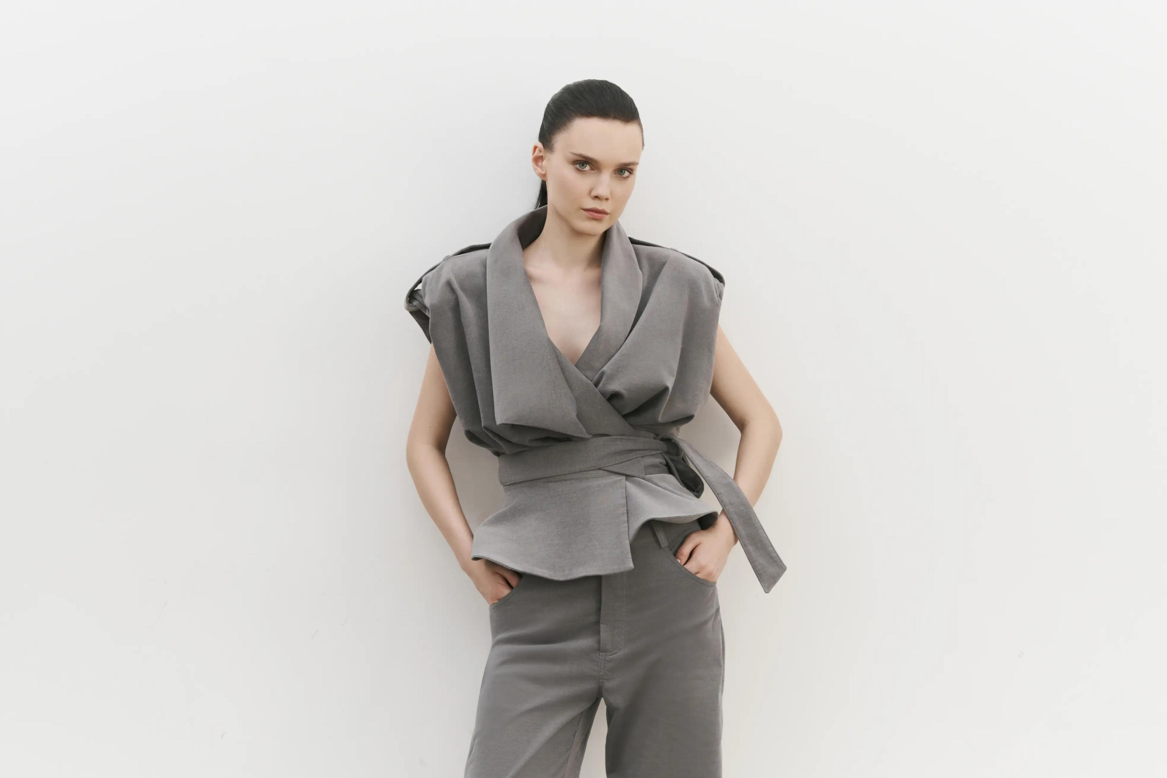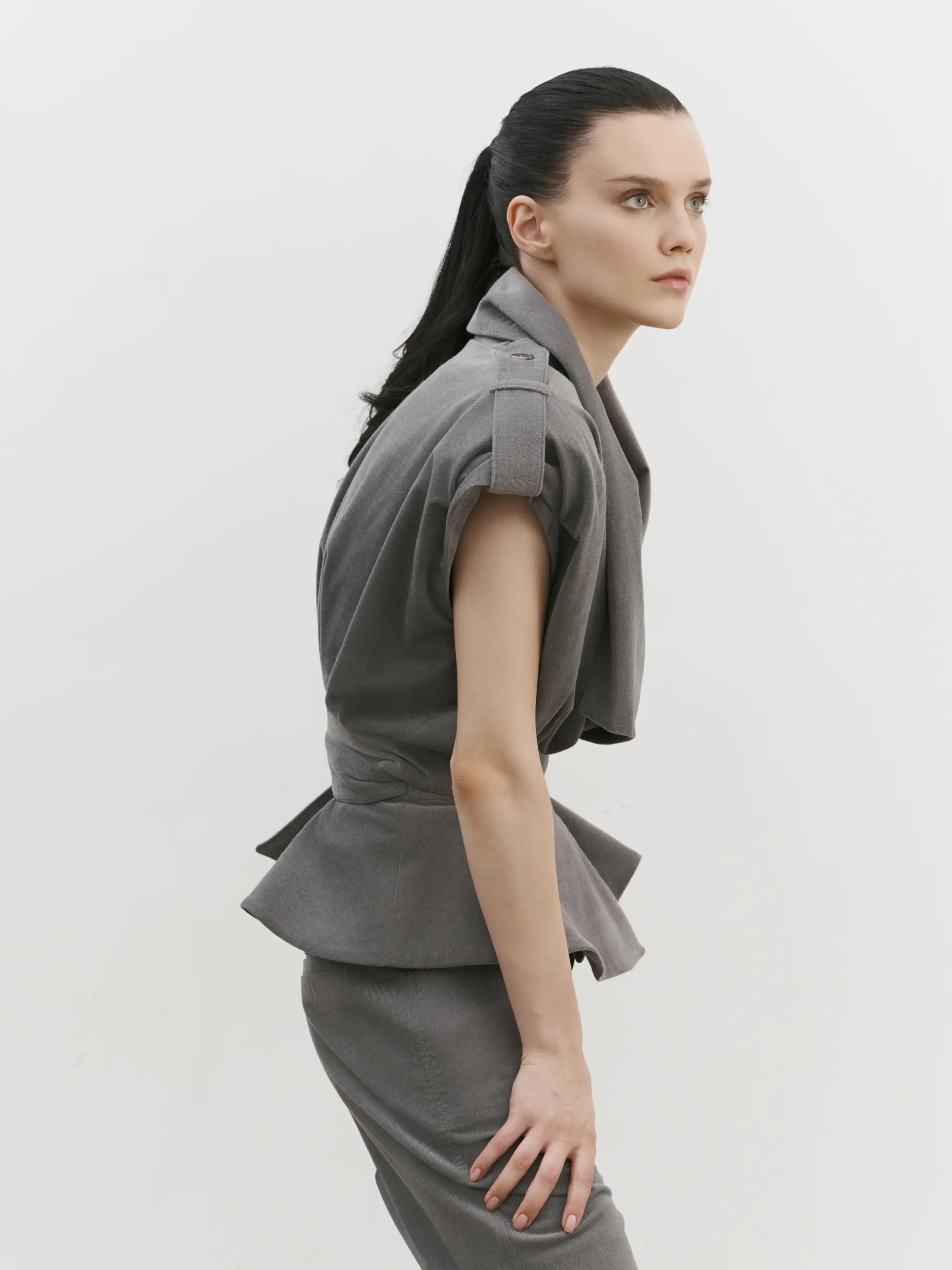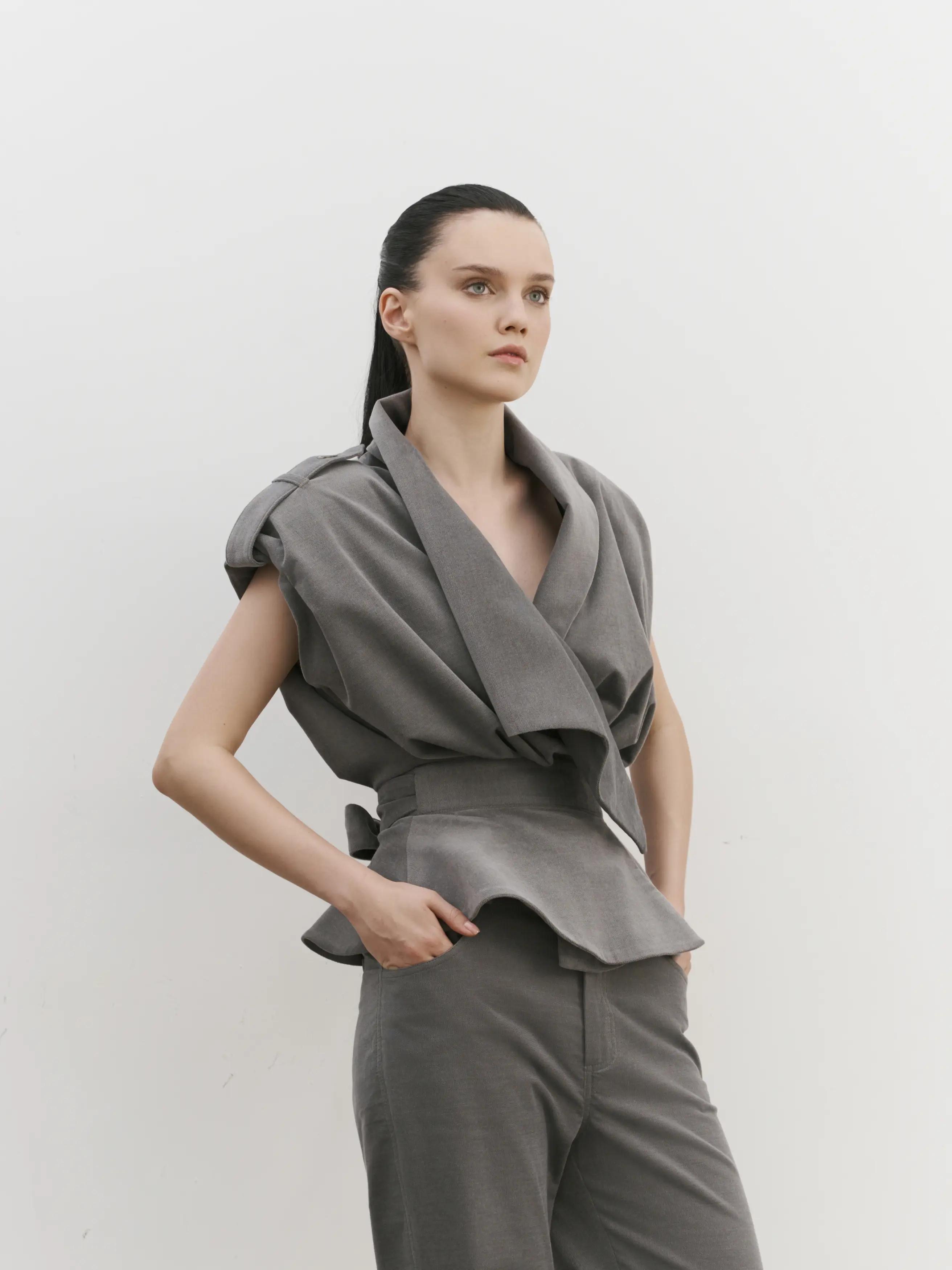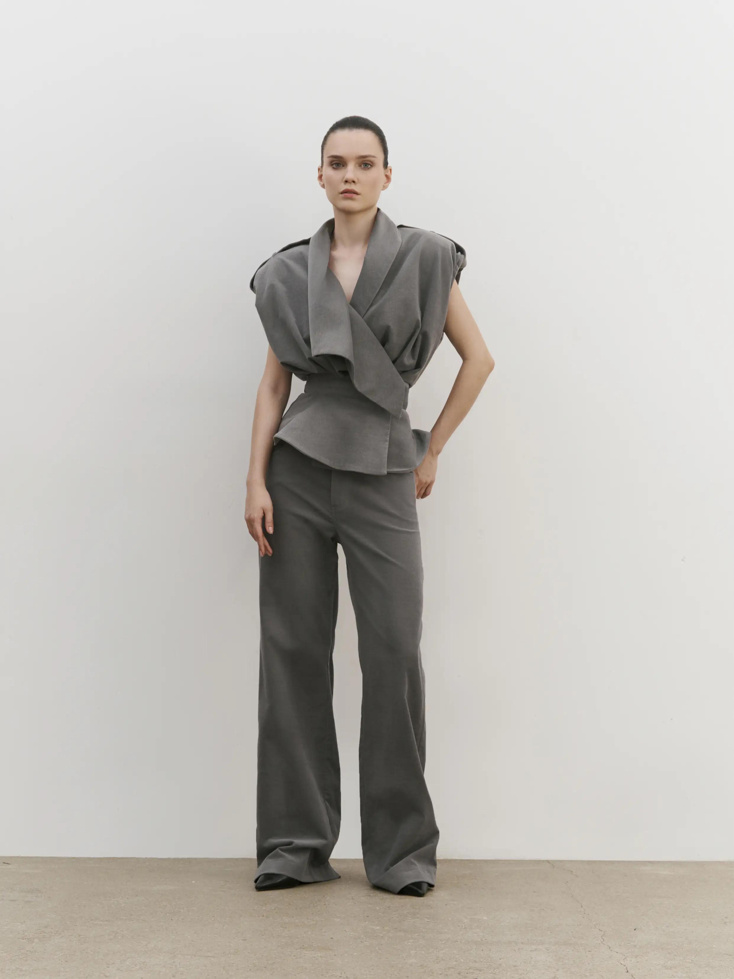 Жилет из вельветовой ткани: выполнен из натуральных материалов. Модель футуристичного дизайна- объемные плечи, баска, завязывается на талии- все эти элементы создают красивый силуэт, подчеркивают талию.