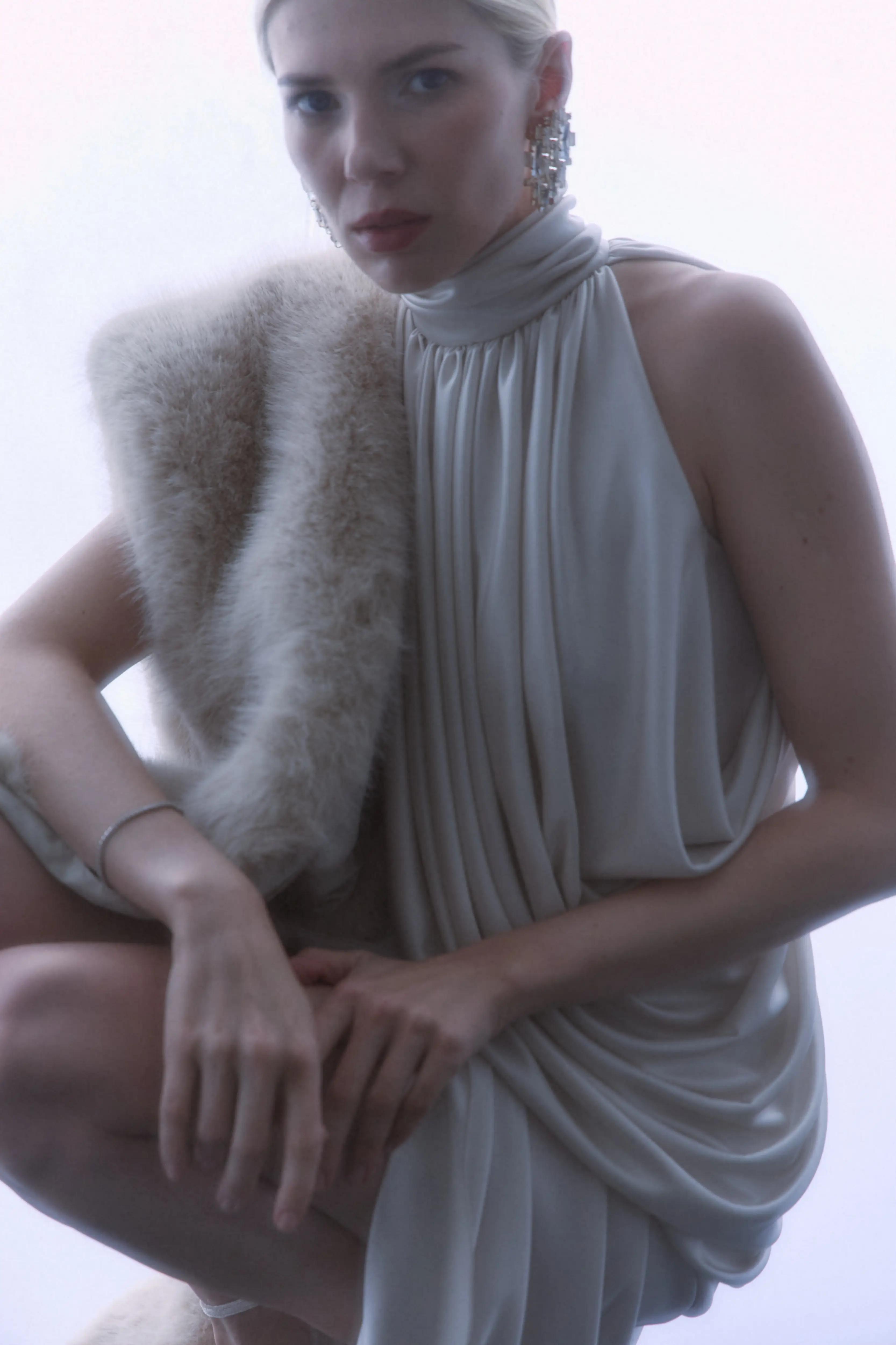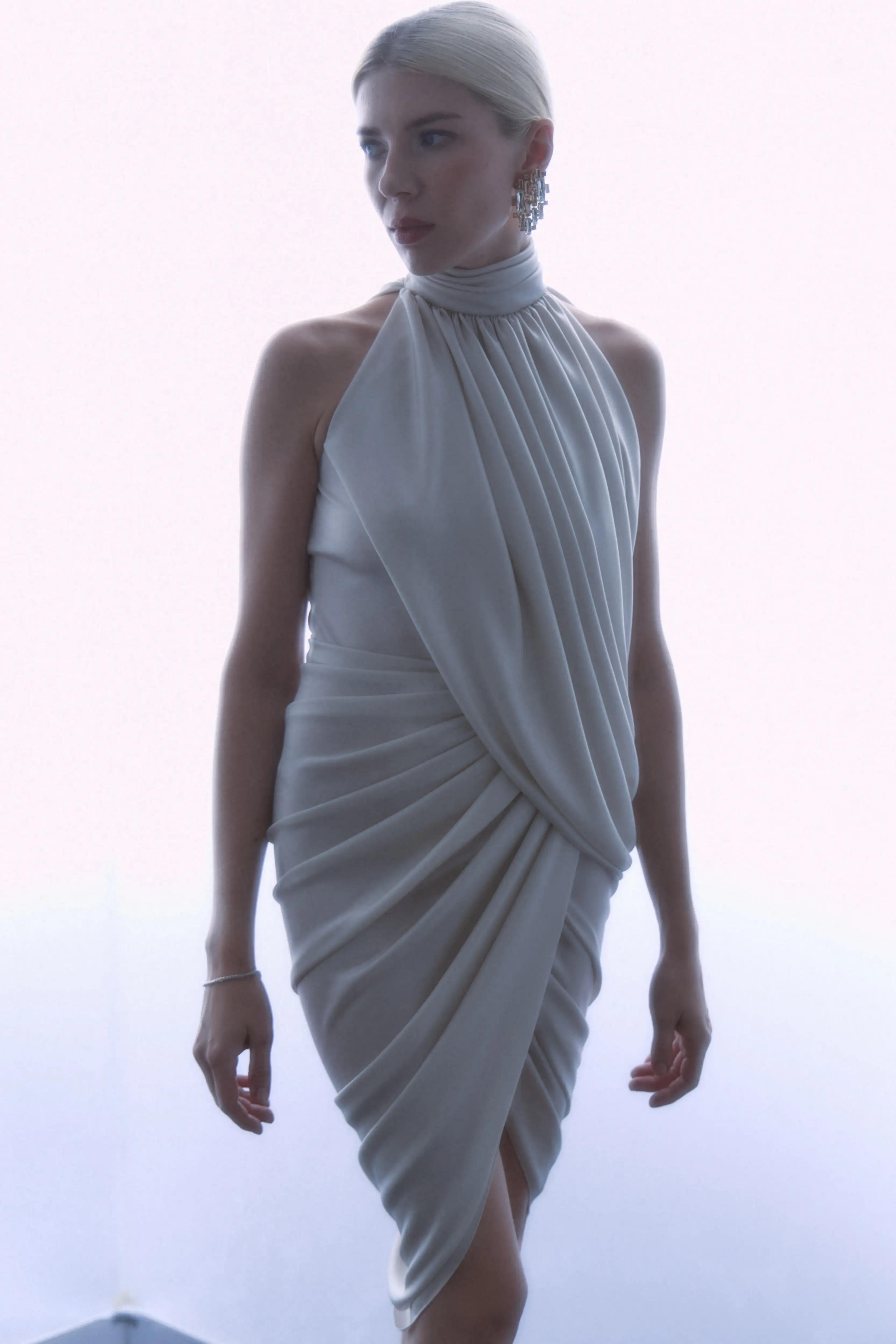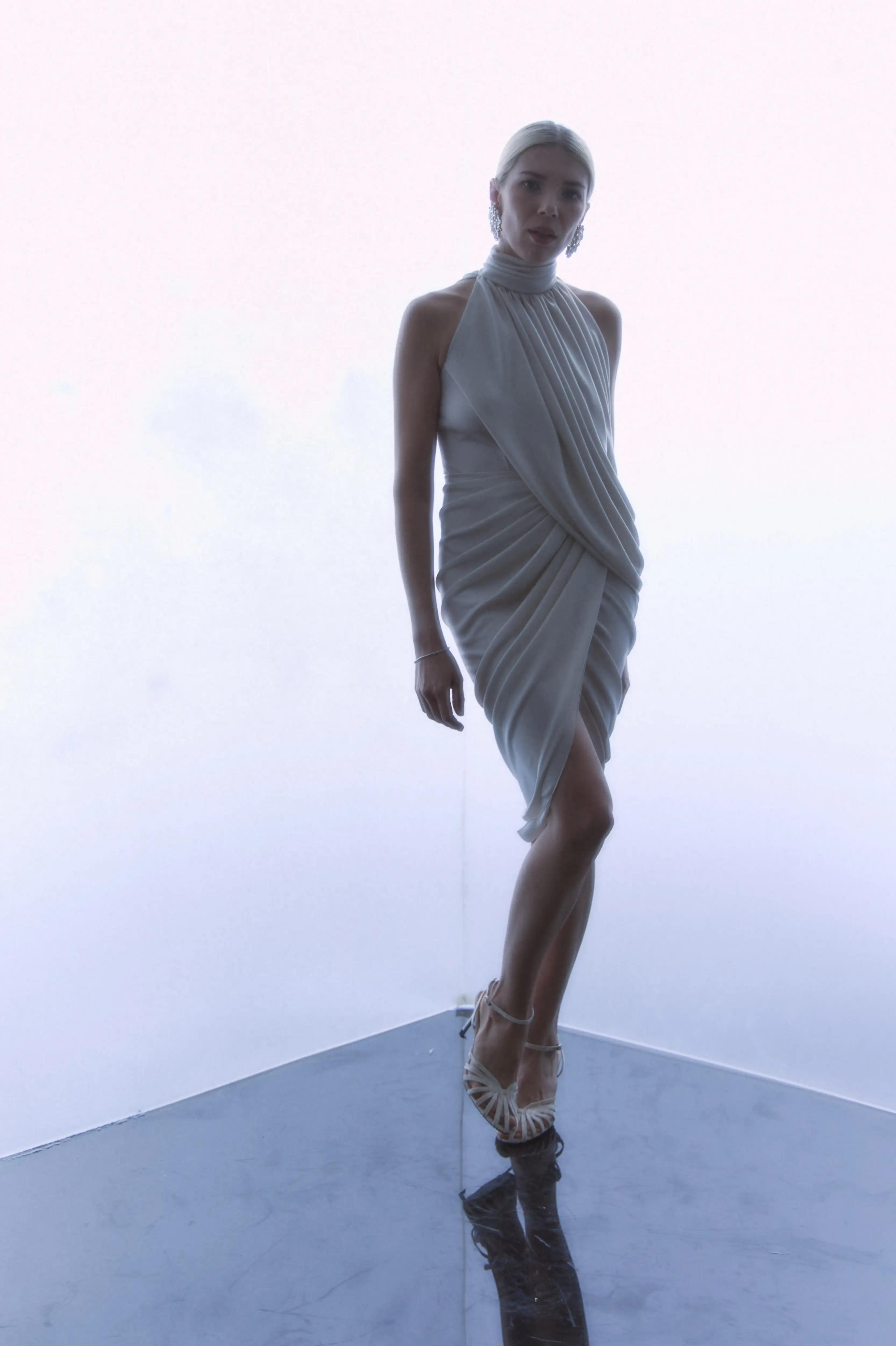 Трикотажное платье с архитектурной драпировкой и высоким воротом. Мягкое полотно подчёркивает линии фигуры, создавая чистый, скульптурный силуэт. Эффектная драпировка спереди формирует элегантное движение ткани.