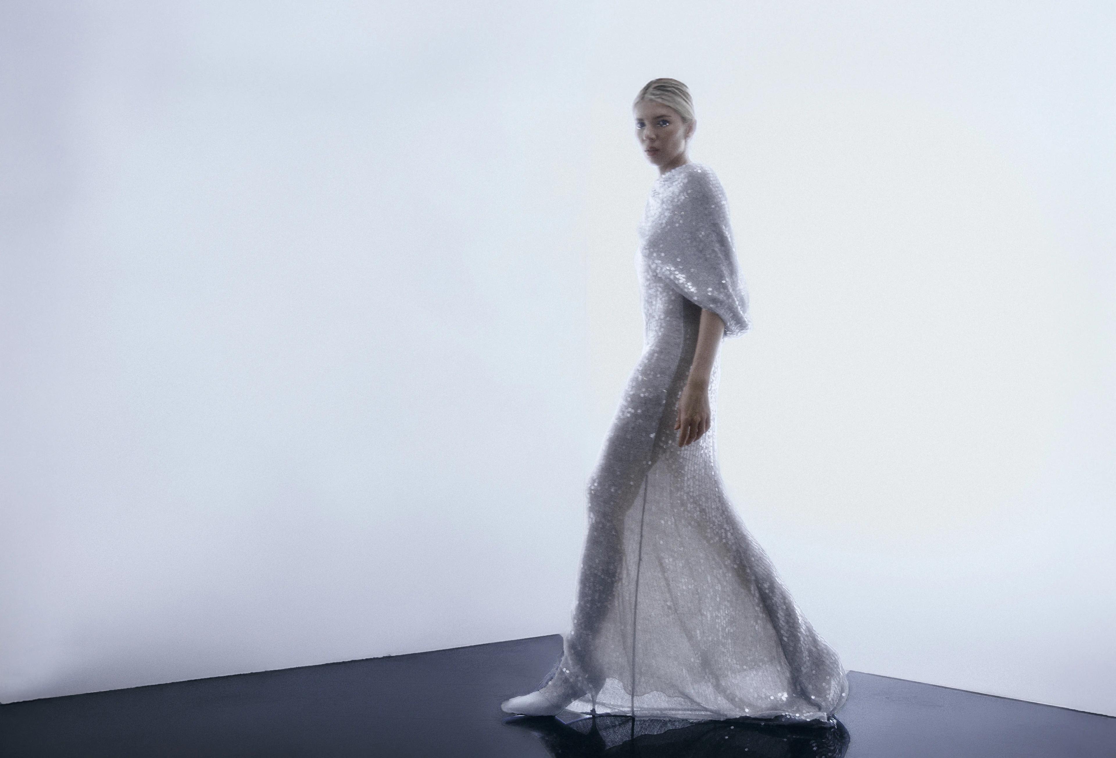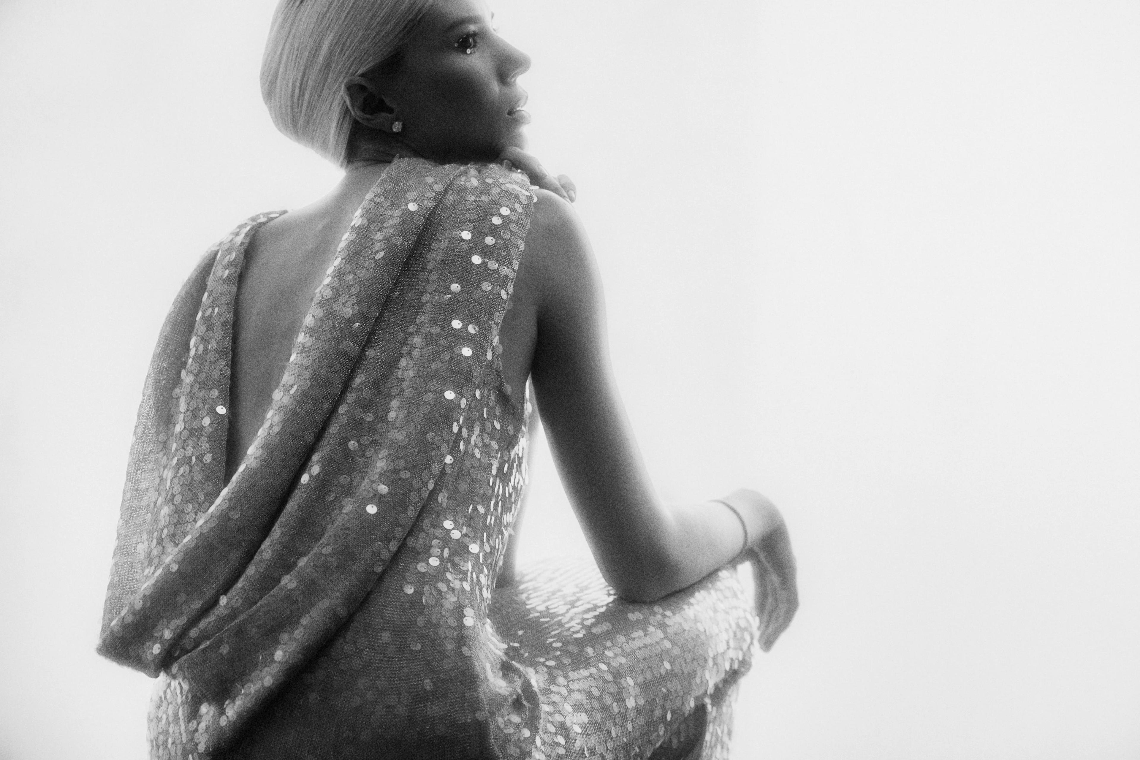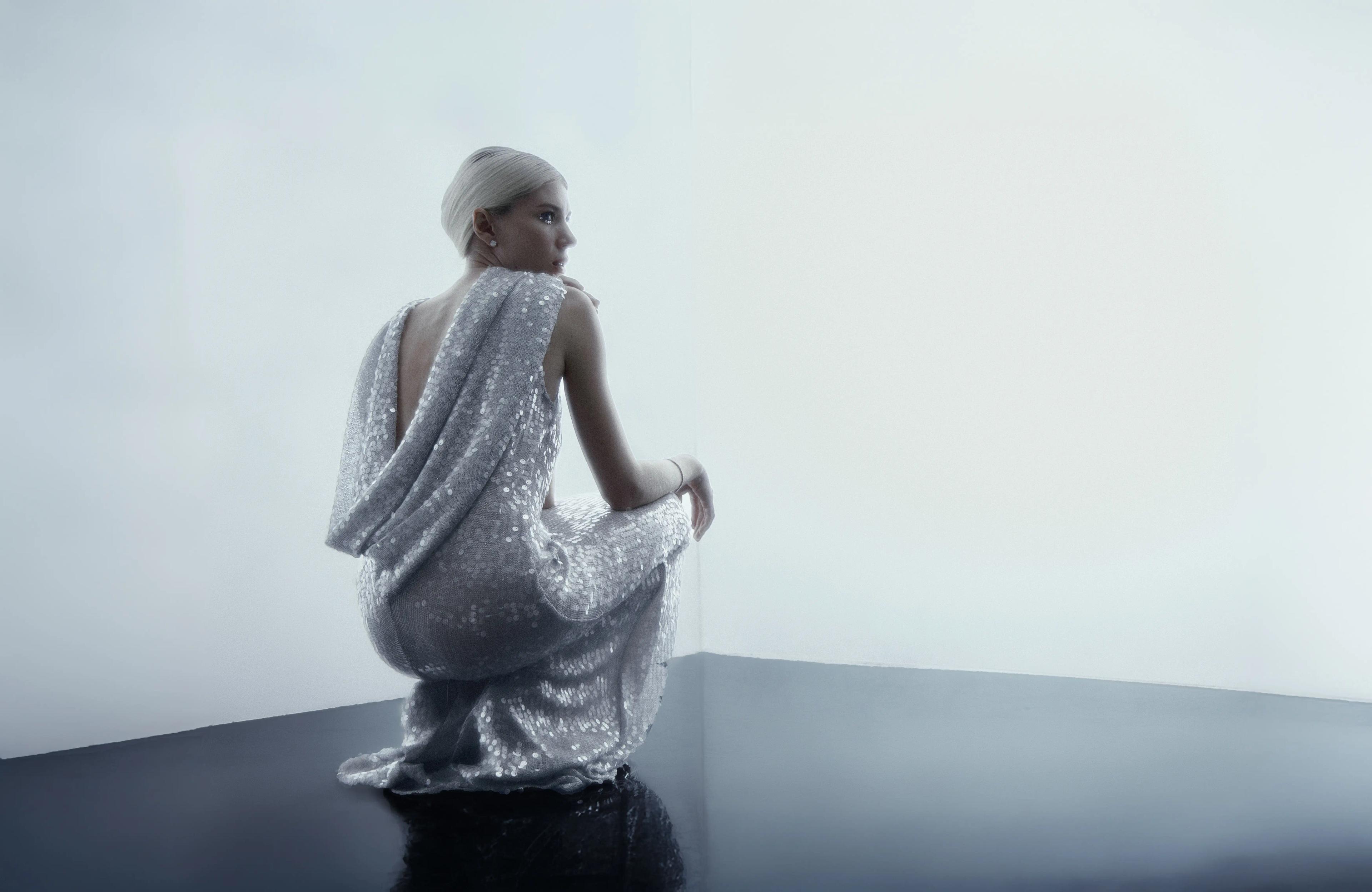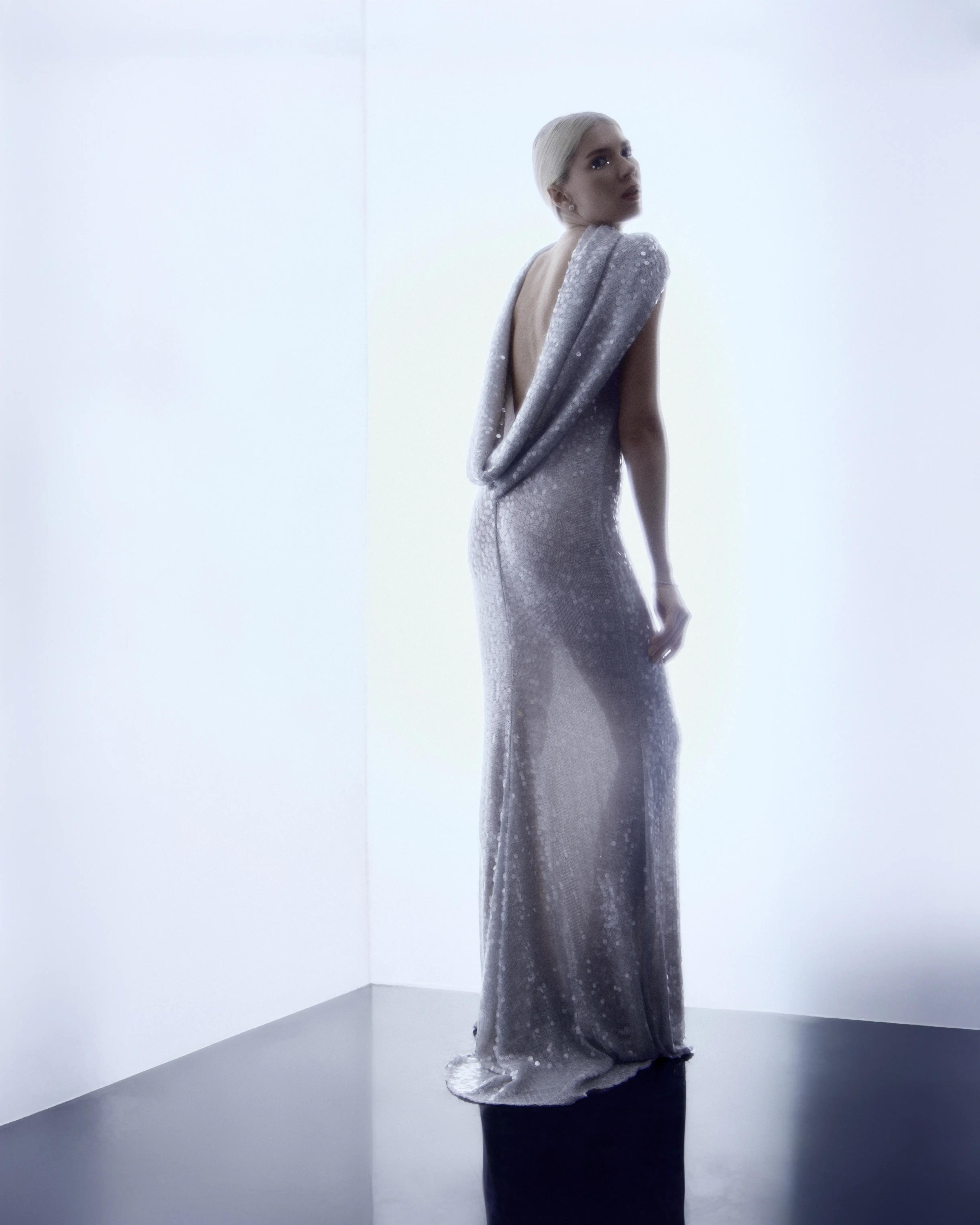 Серебристое платье с пайетками, мягкой драпировкой и эффектной открытой спиной. Лёгкое сияние и удлинённый силуэт создают элегантный вечерний образ