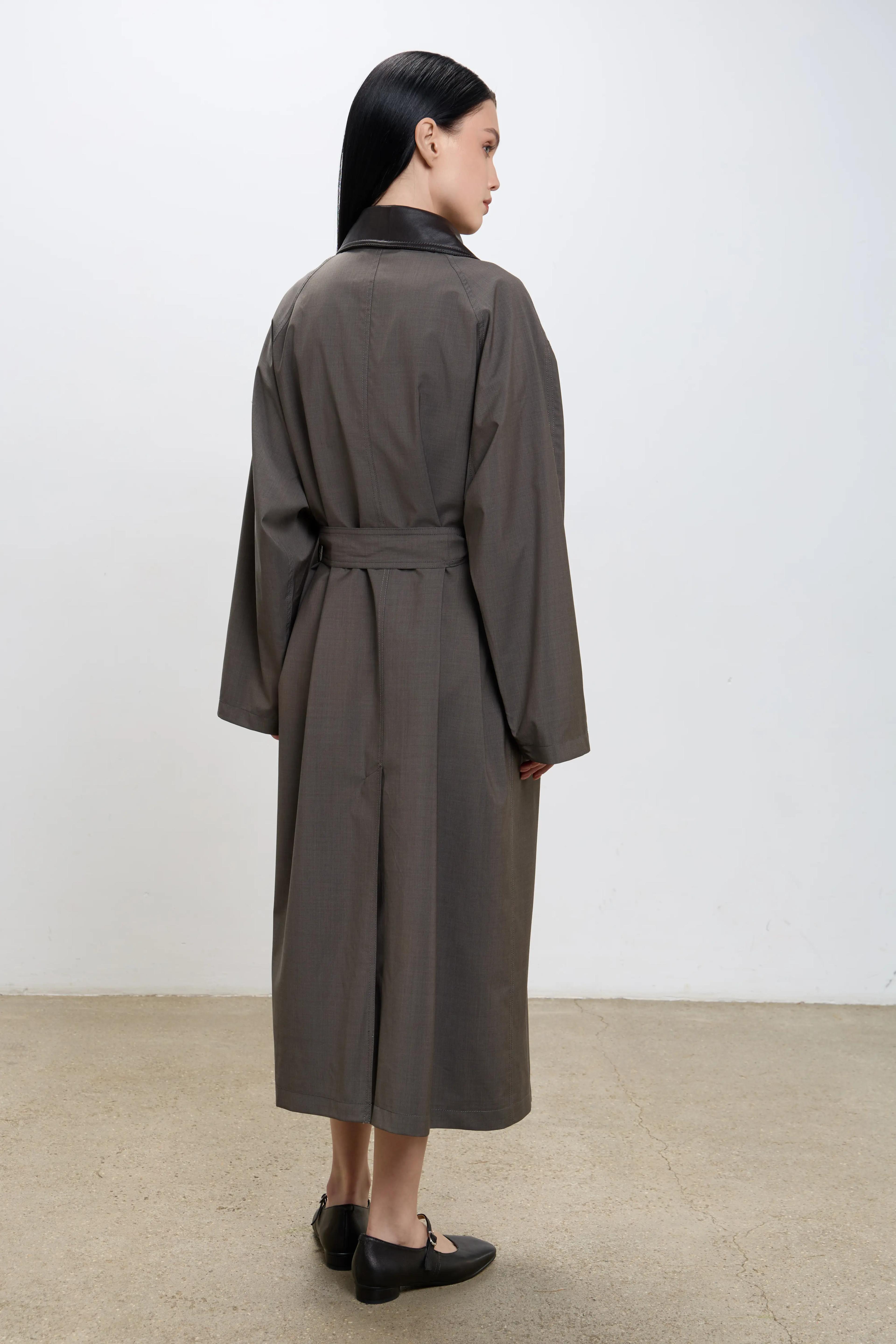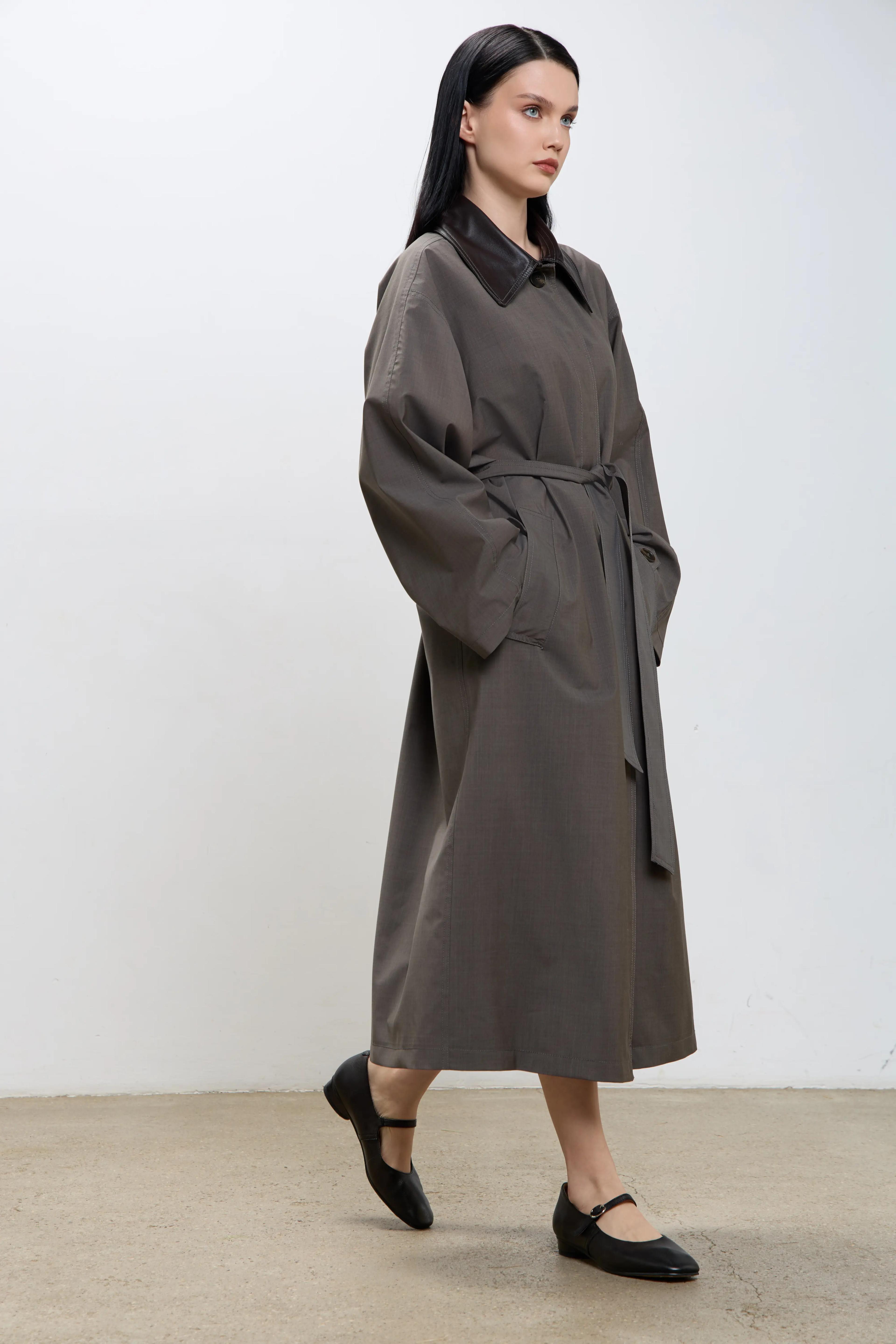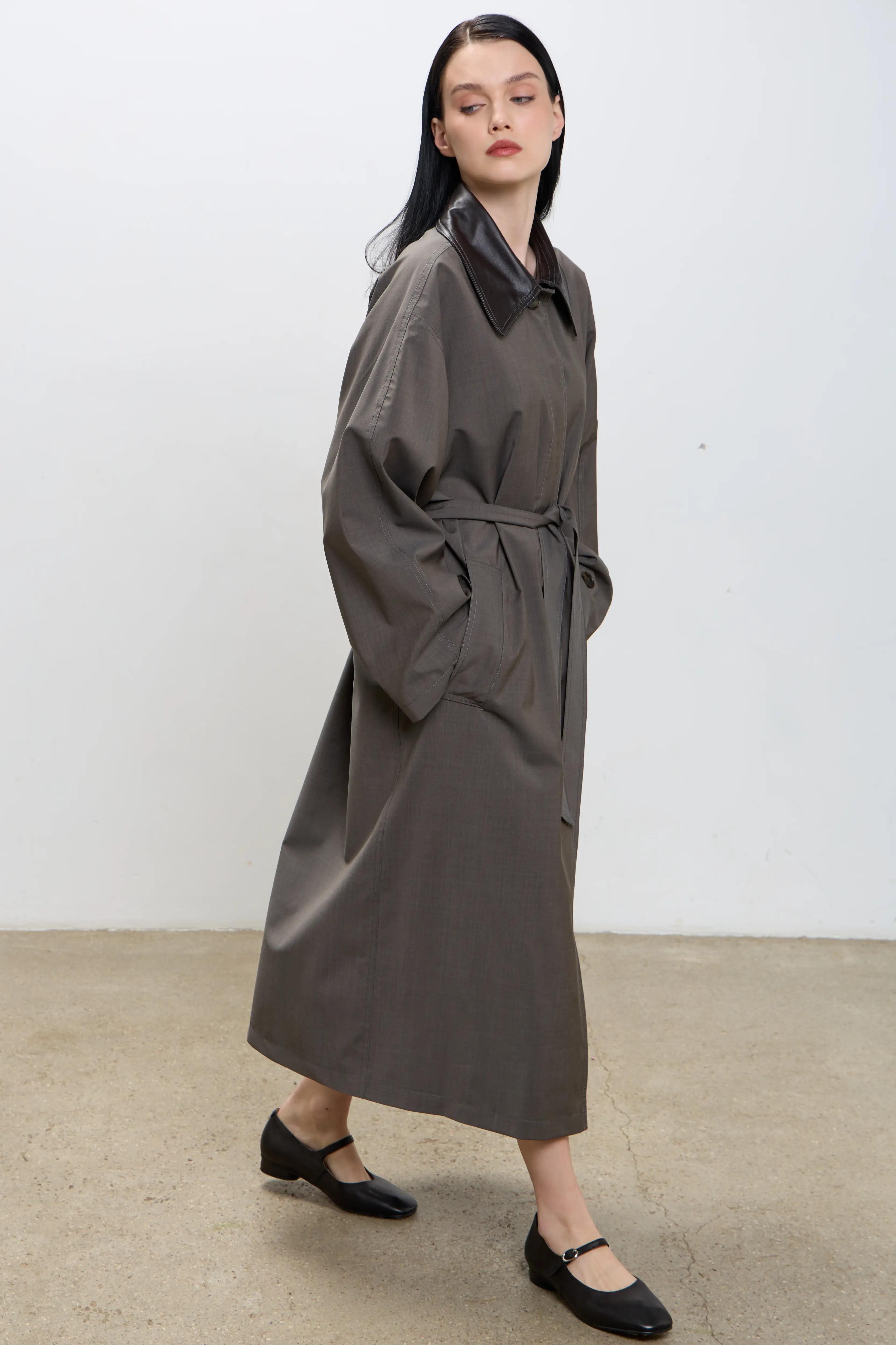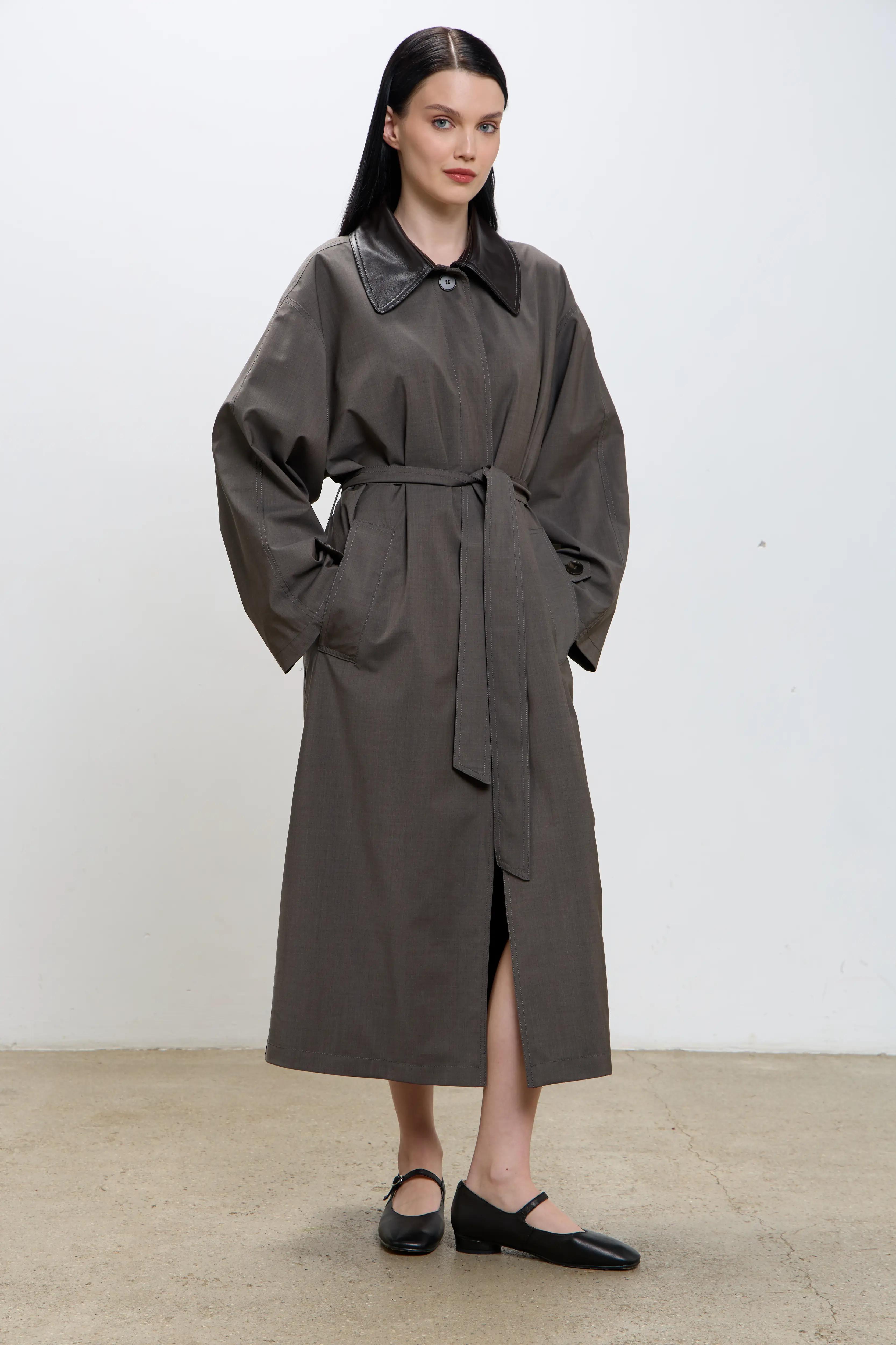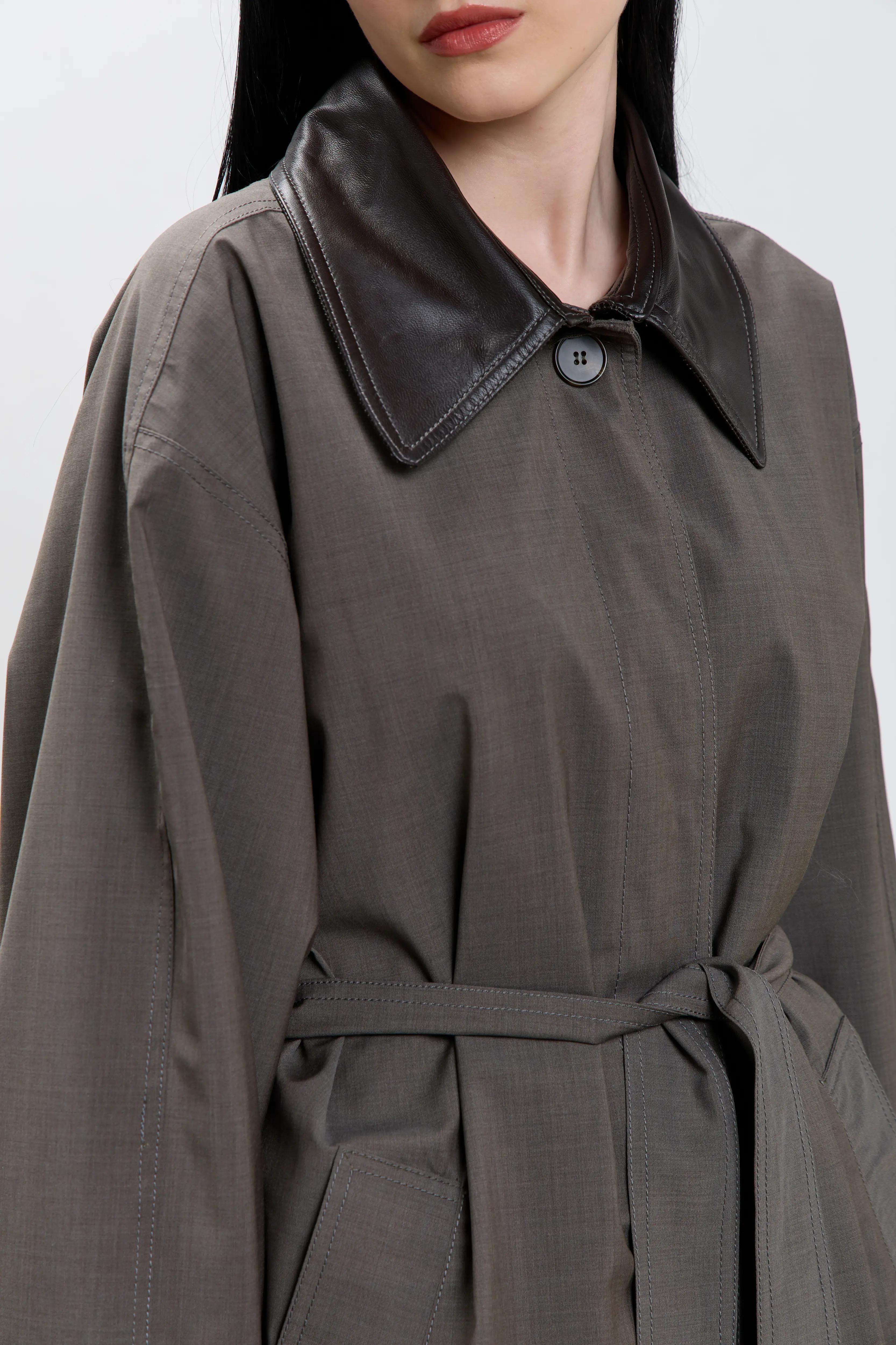 Плащ прямого свободного кроя в размере one size. Стойка, паты и пряжка выполнены из натуральной овчиной кожи в красивом шоколадном оттенке.