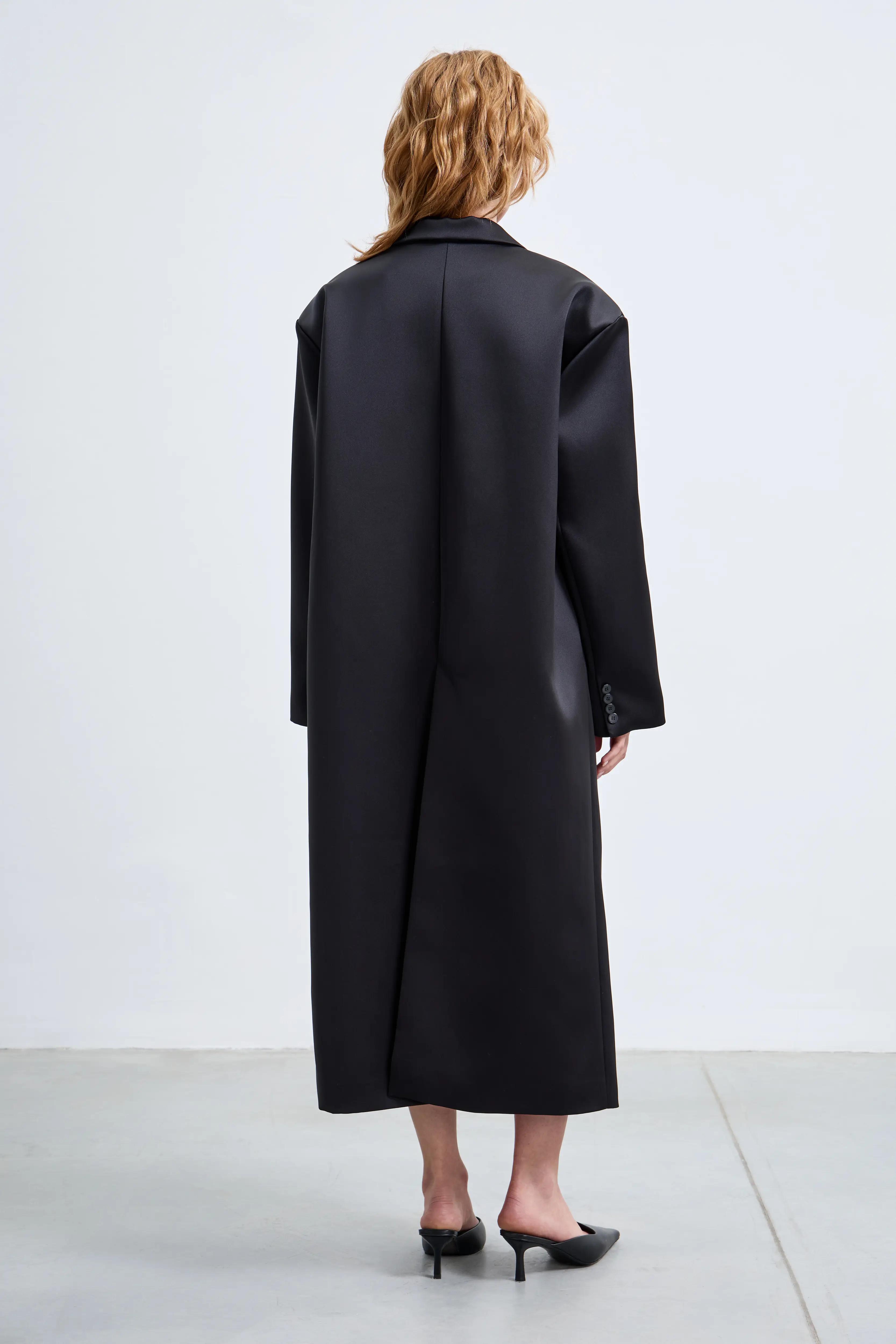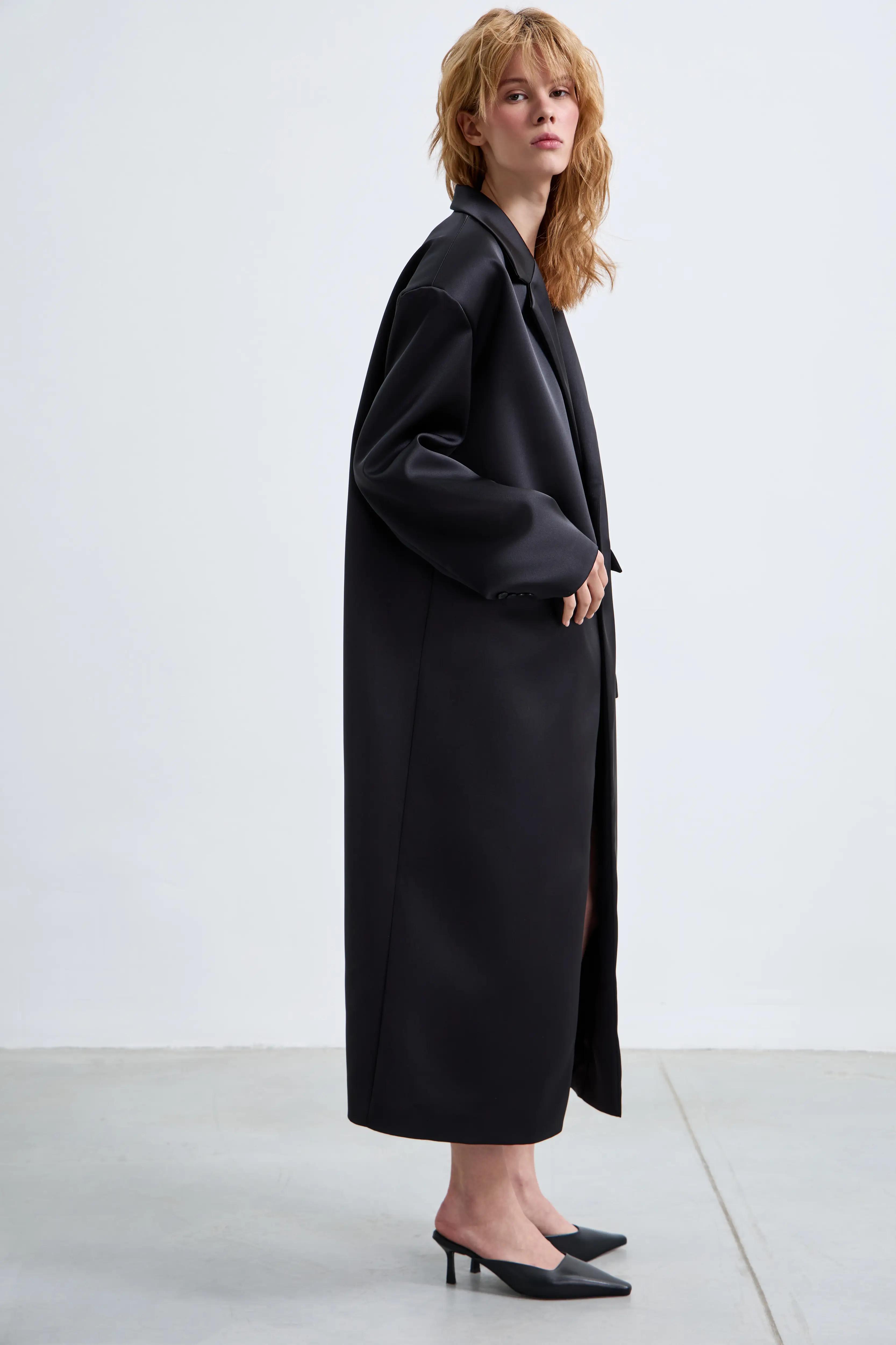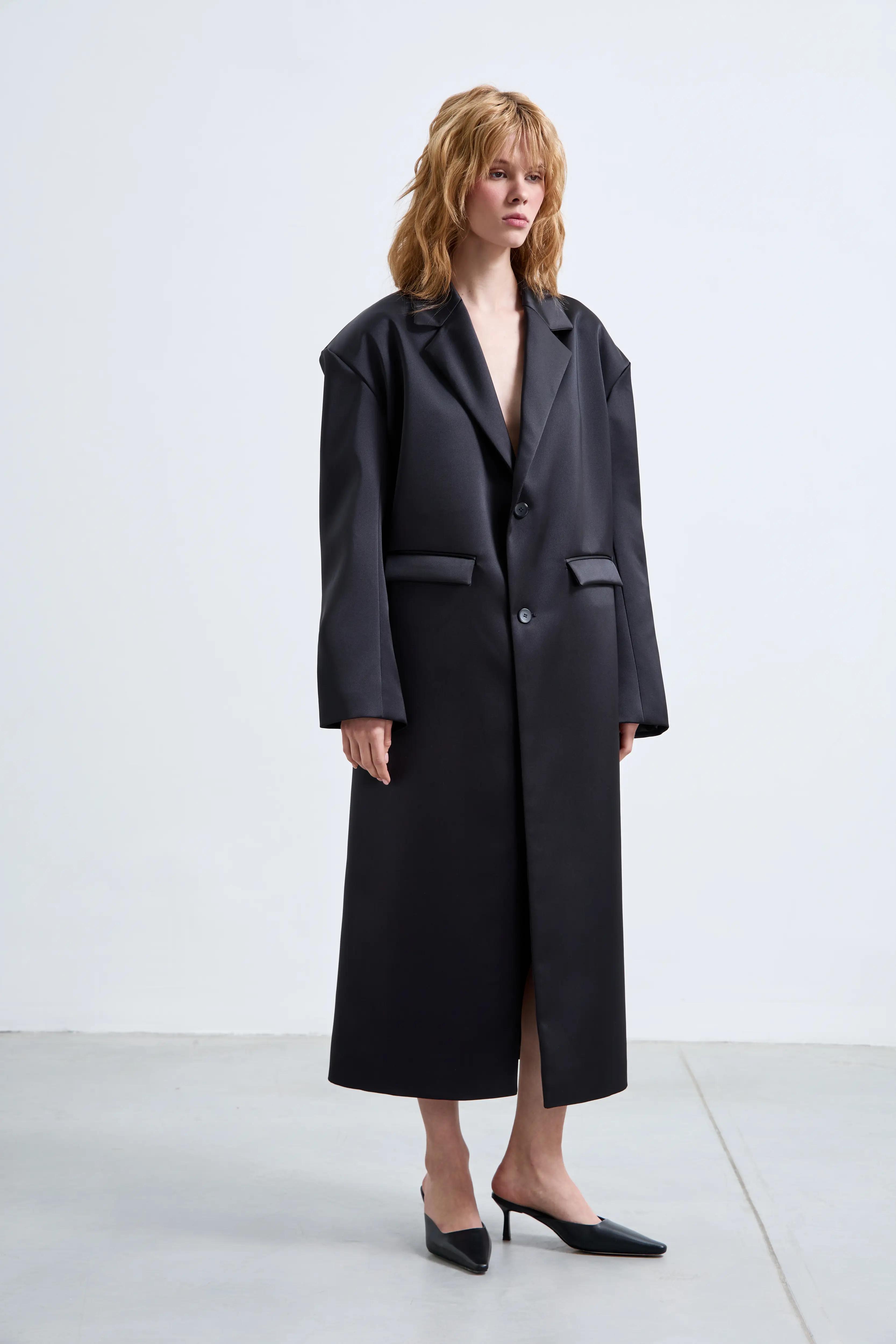 Пальто мужского кроя с мягким оверсайз-силуэтом. Чёткие плечи, лаконичные линии и длина ниже колена создают современный и уверенный образ. Минималистичный дизайн делает модель универсальной основой гардероба.