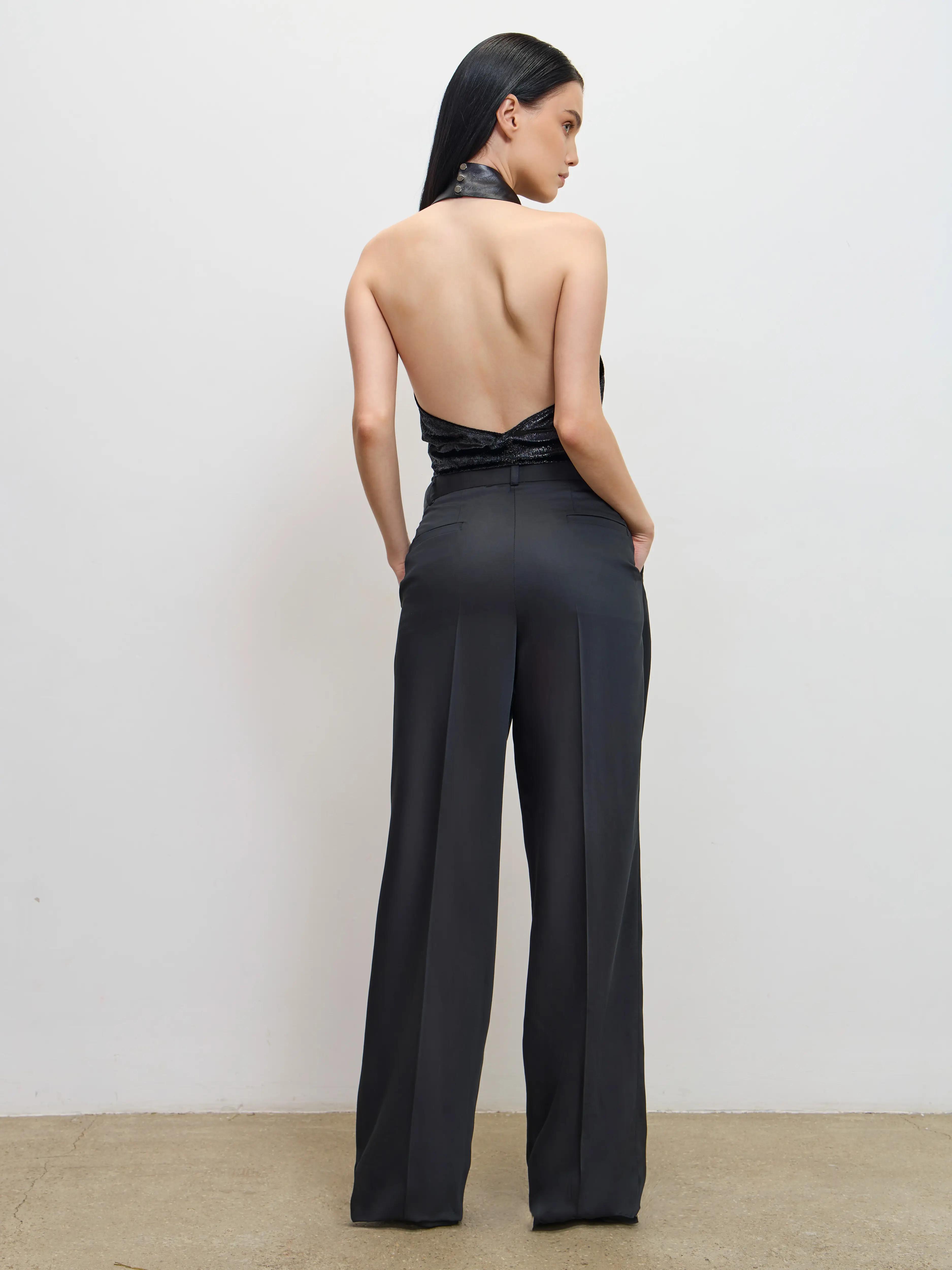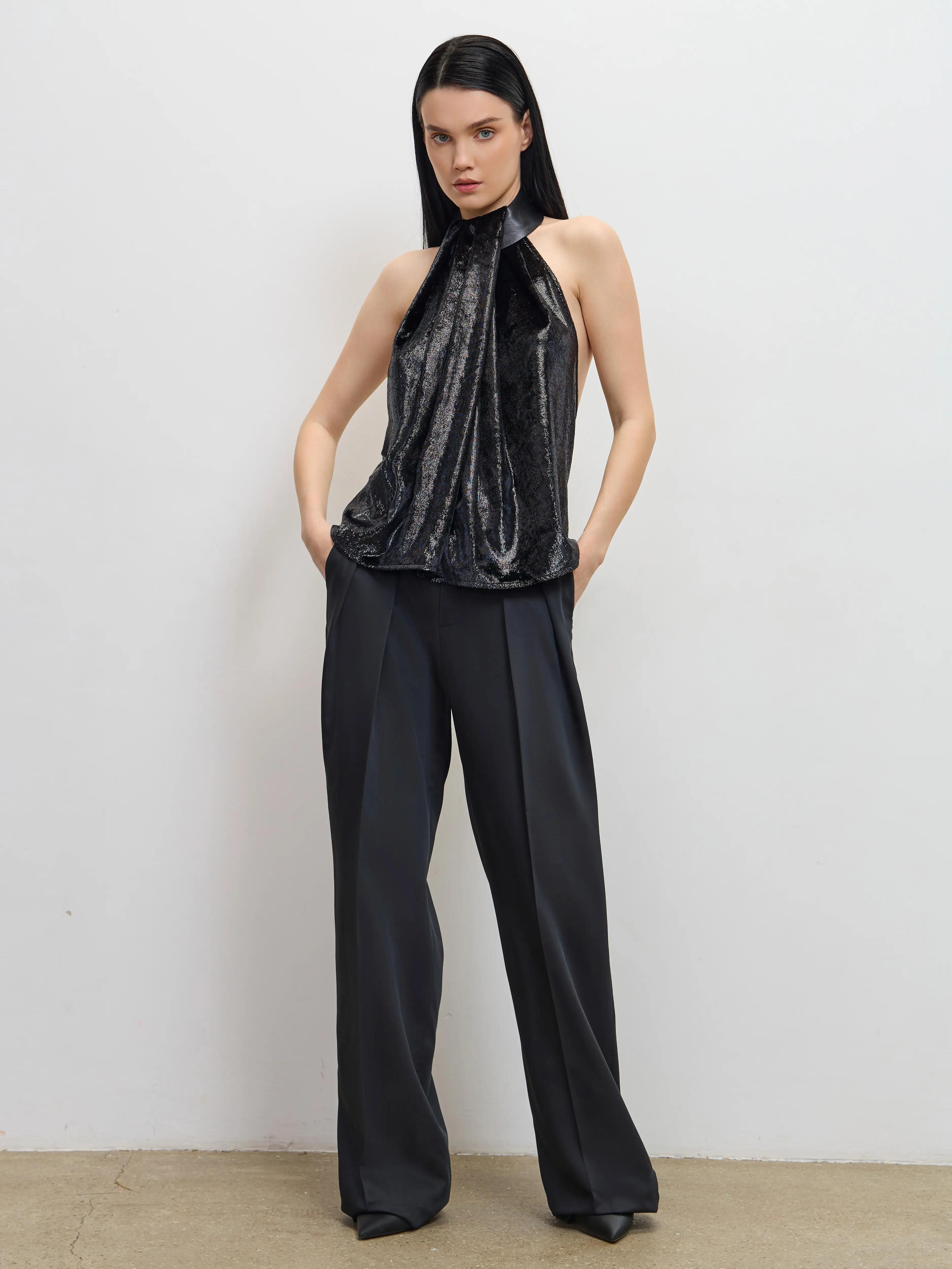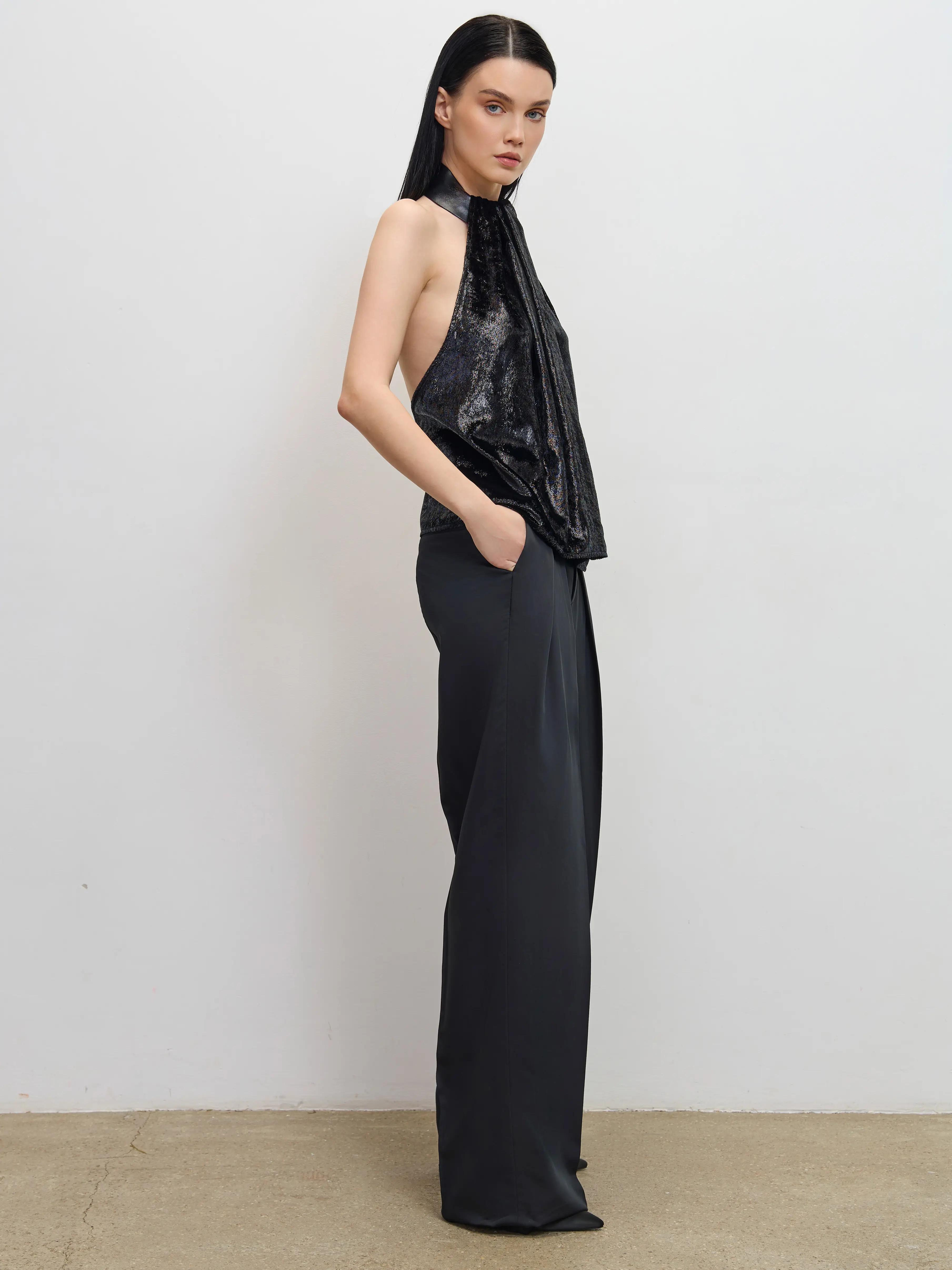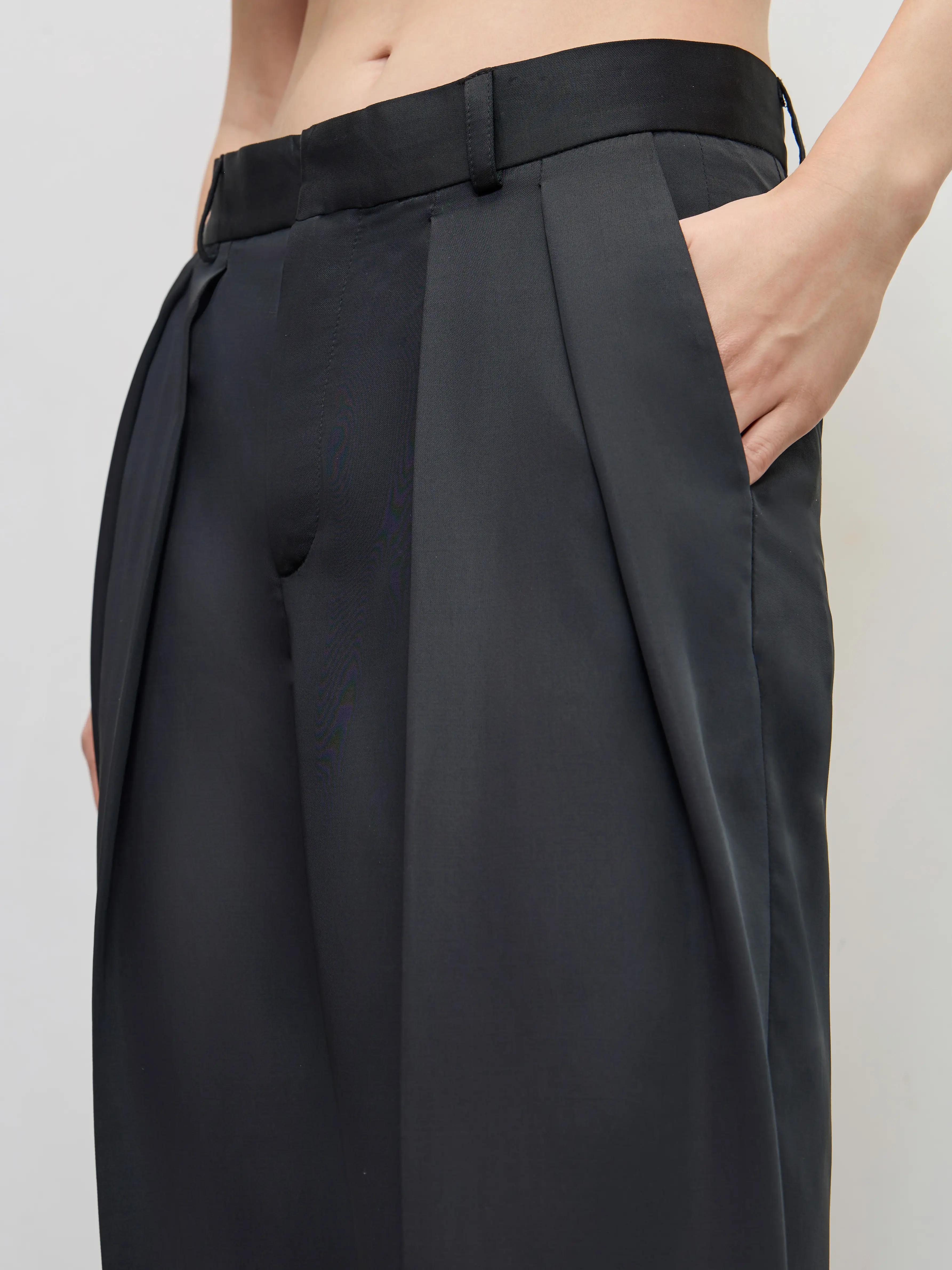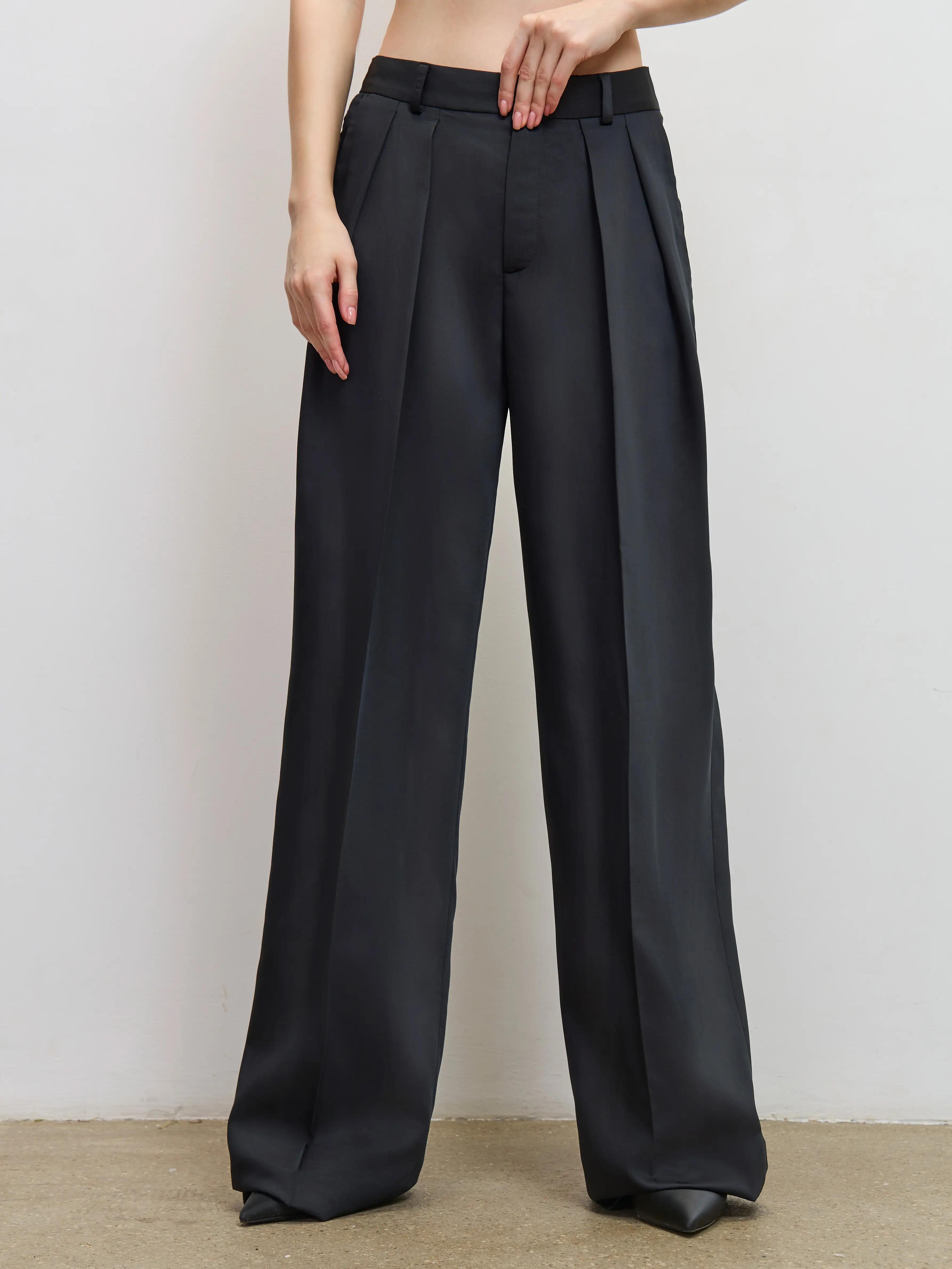 Брюки прямого кроя из мягкого материала с красивым сатиновым блеском, посадка на бедрах. Универсальная модель в гардеробе.