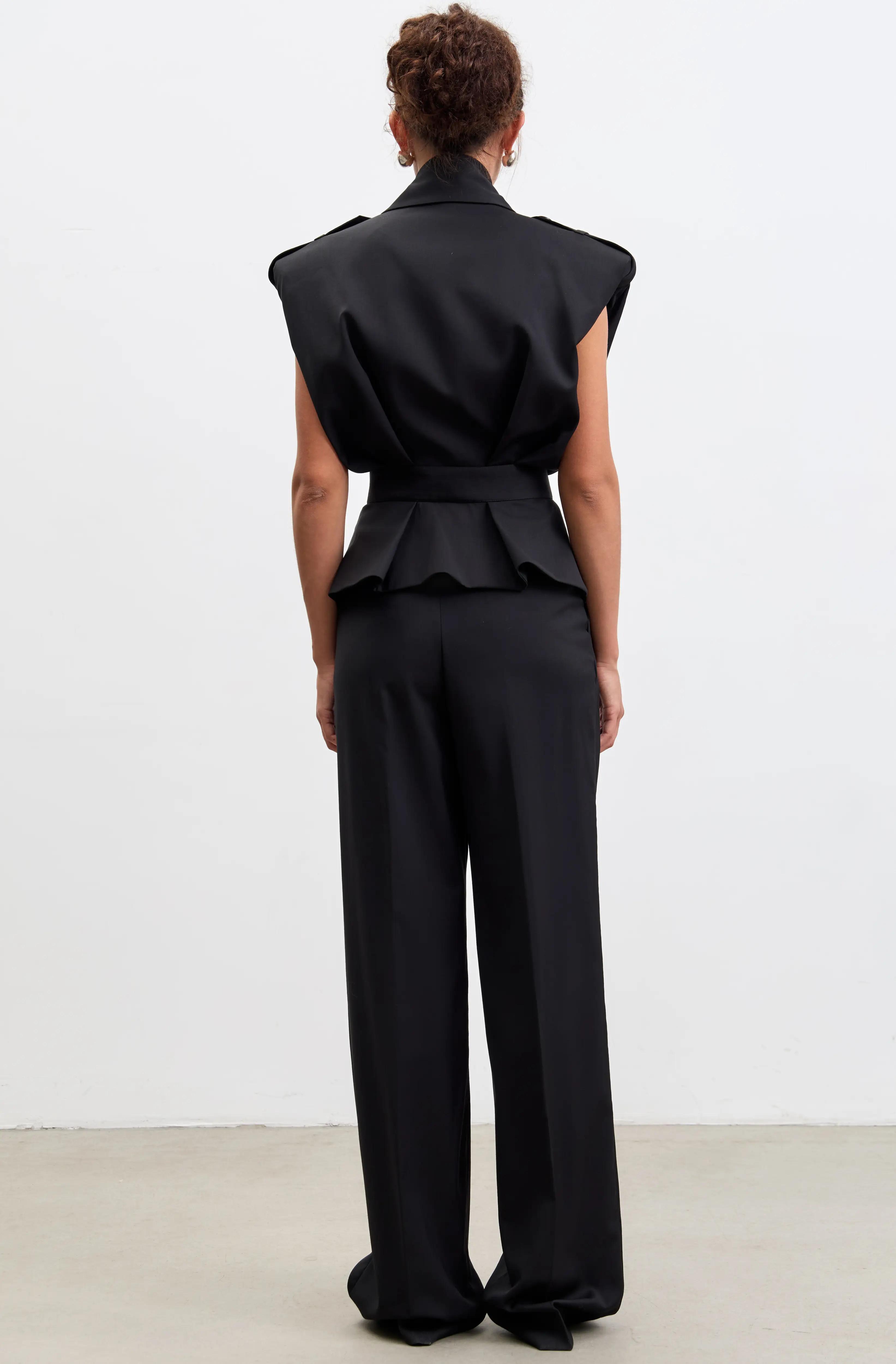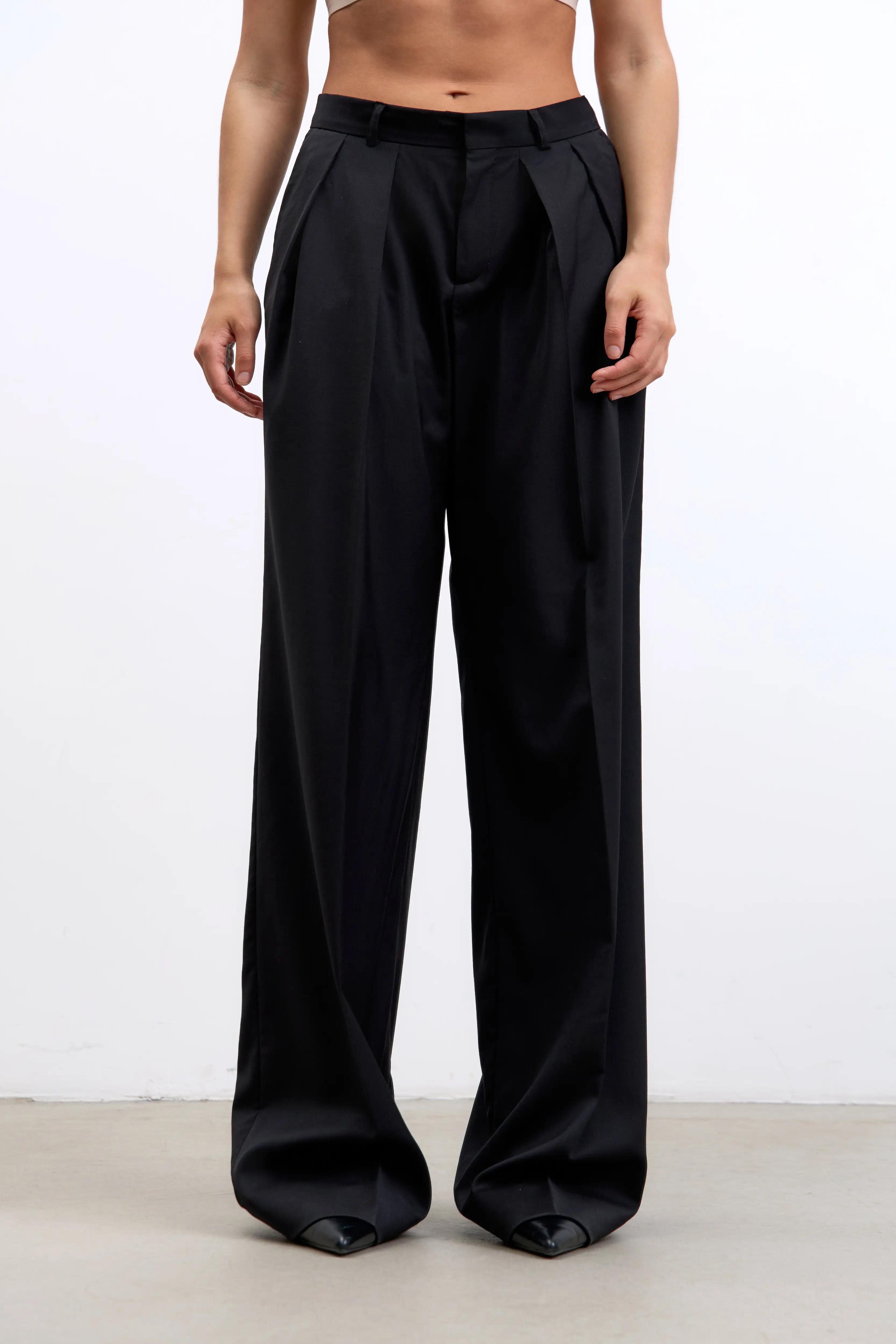 Созданные в духе современной архитектуры, эти брюки-палаццо формируют выразительную вертикаль за счёт высокой посадки и свободного, плавно ниспадающего кроя. Двойные защипы спереди добавляют объём и лёгкое движение ткани, а длинные штанины, слегка касающиеся пола, визуально вытягивают силуэт — эффектно как с каблуками, так и с плоской обувью.
