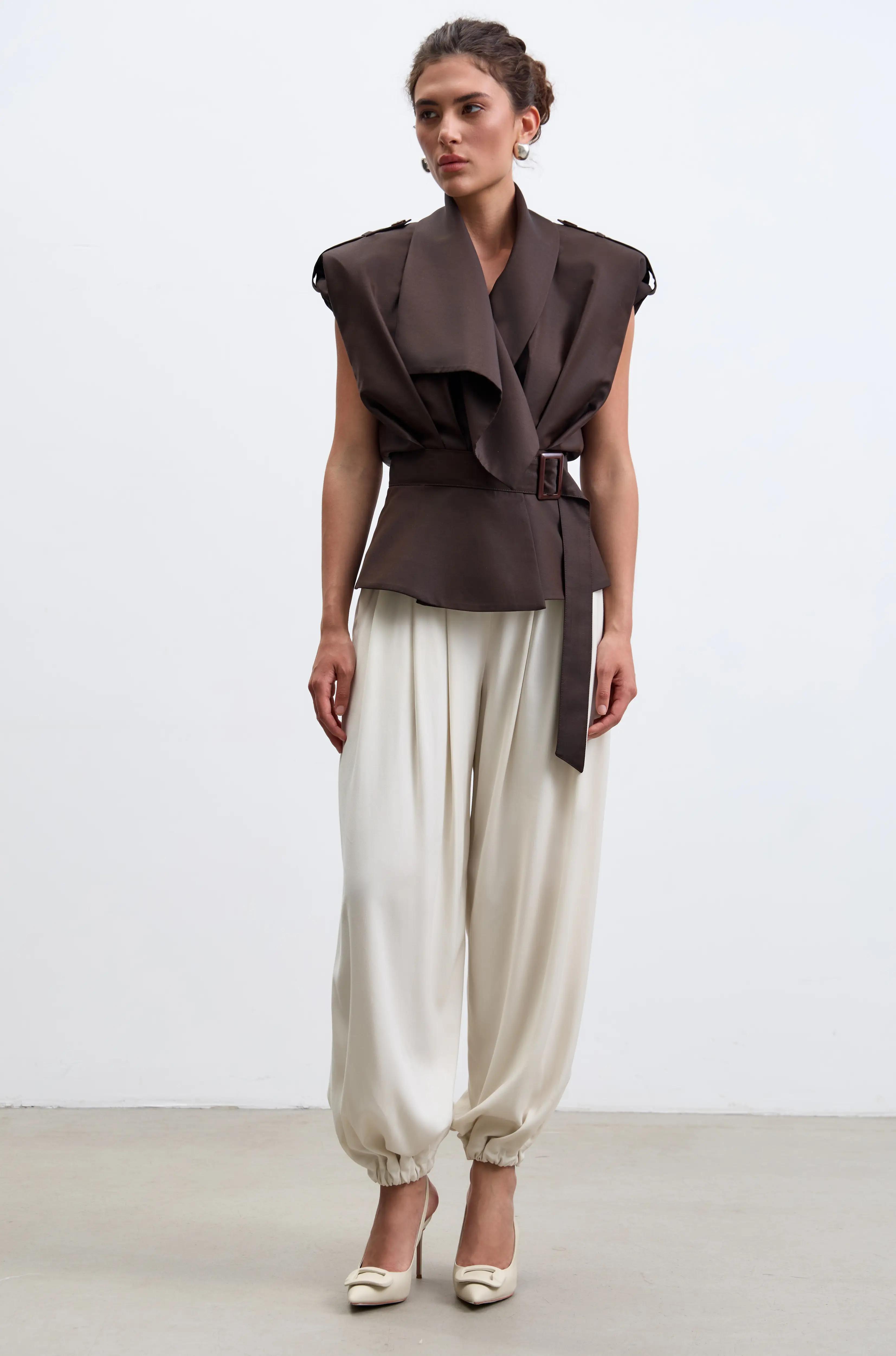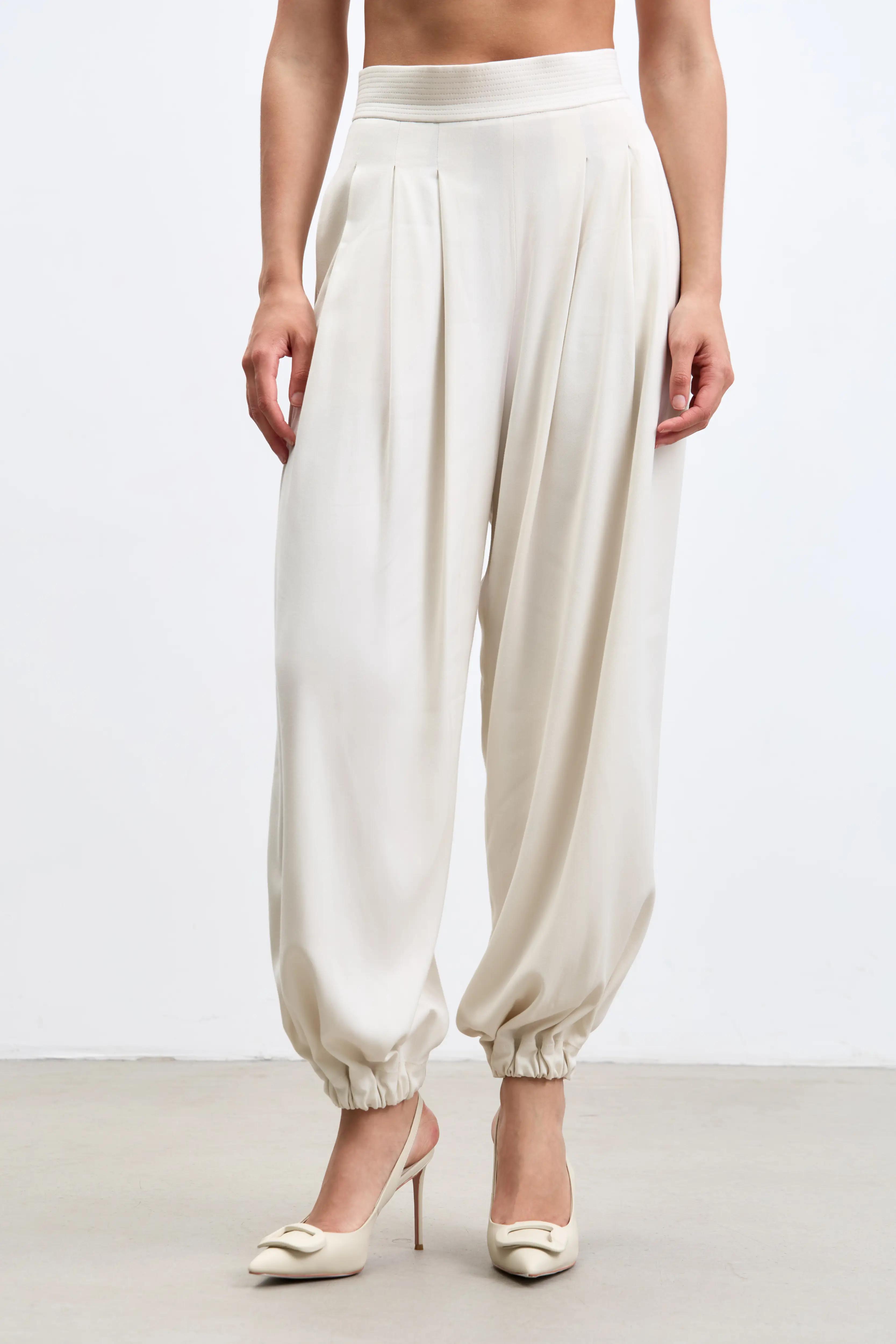Посадка – высокая талия со слегка утягивающим, но эластичным поясом-корсажем подчёркивает линию талии. Драпировка – по две глубокие односторонние складки с каждой стороны запускают дополнительный объём от пояса, позволяя ткани свободно играть при каждом шаге. Силуэт – расслабленный по бедру и игриво сужающийся к низу ballon-крой; эластичные манжеты собирают брюки на щиколотке, визуально вытягивая фигуру и открывая обувь.