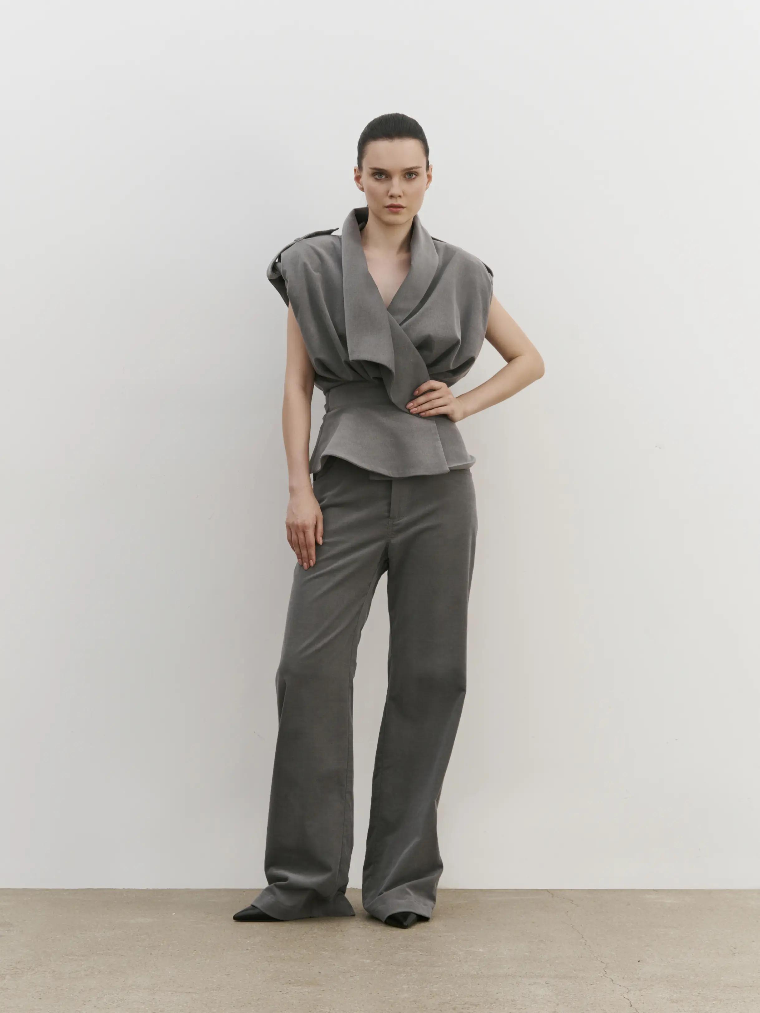 Вельветовые брюки: выполнены из мягкого хлопкового материала, в классическом прямом крое, посадка на бедрах, красивый серо-лиловый оттенок. На сайте также представлена рубашка и жилет из такого же материала, модели можно сочетать между собой.