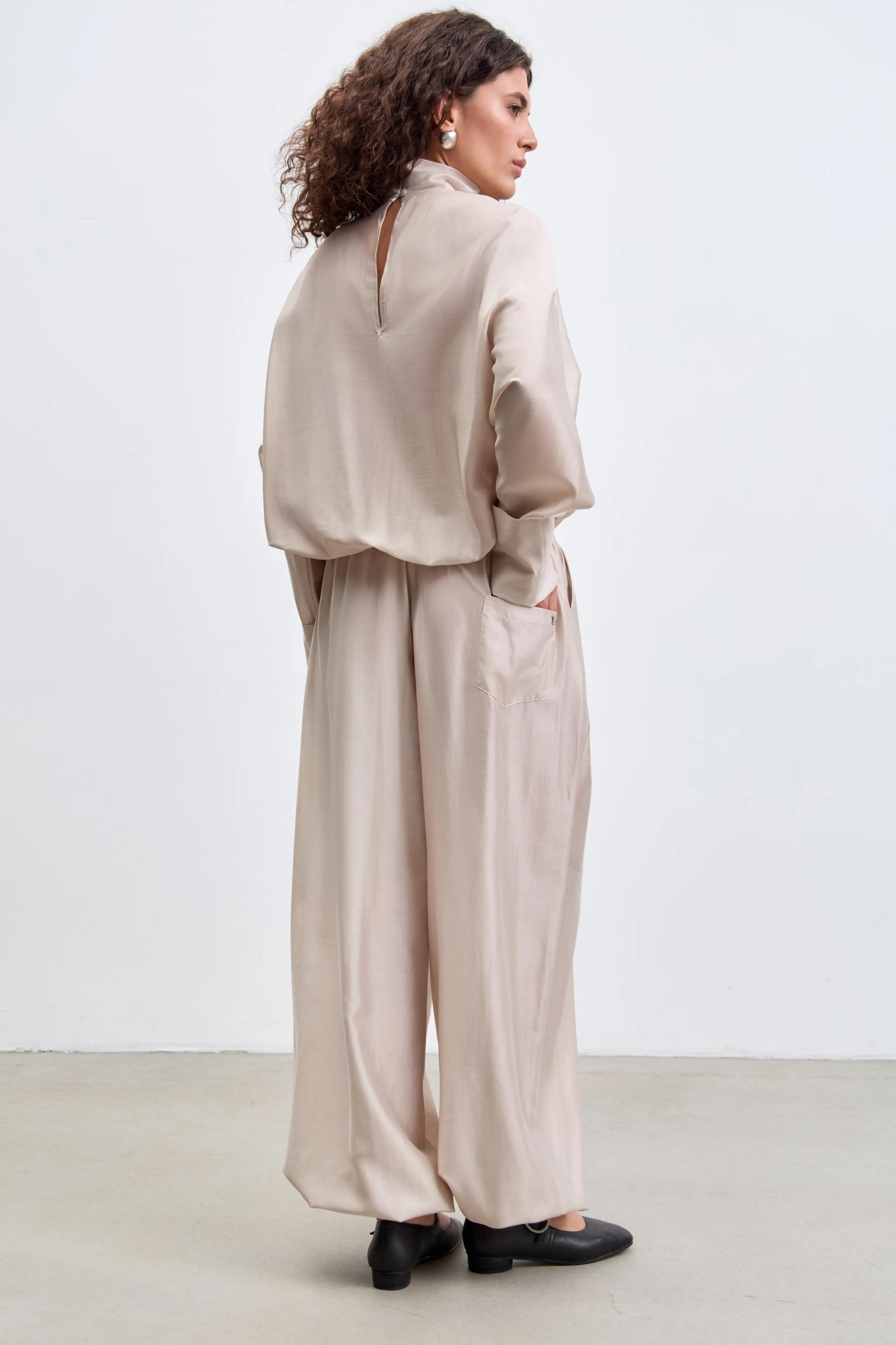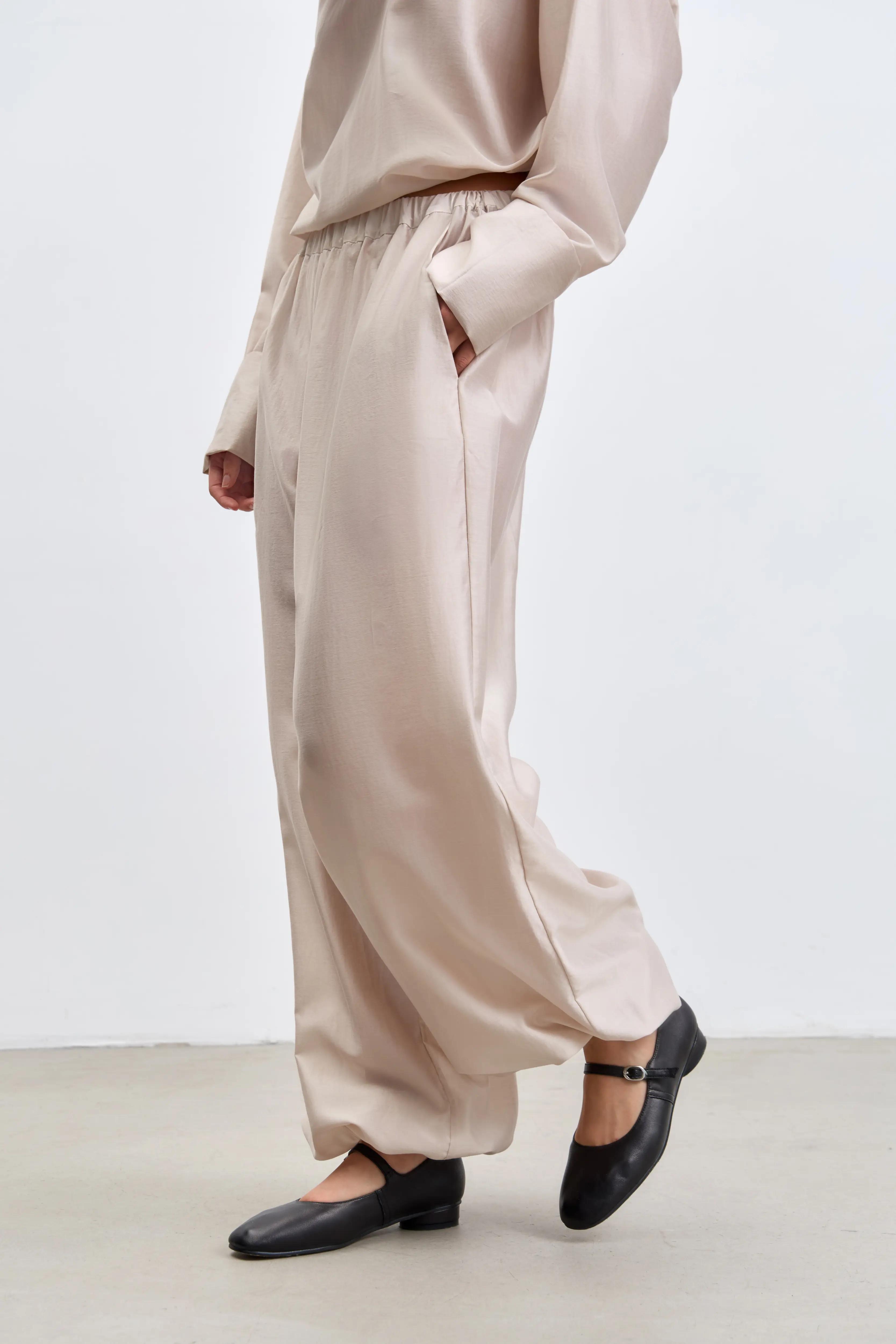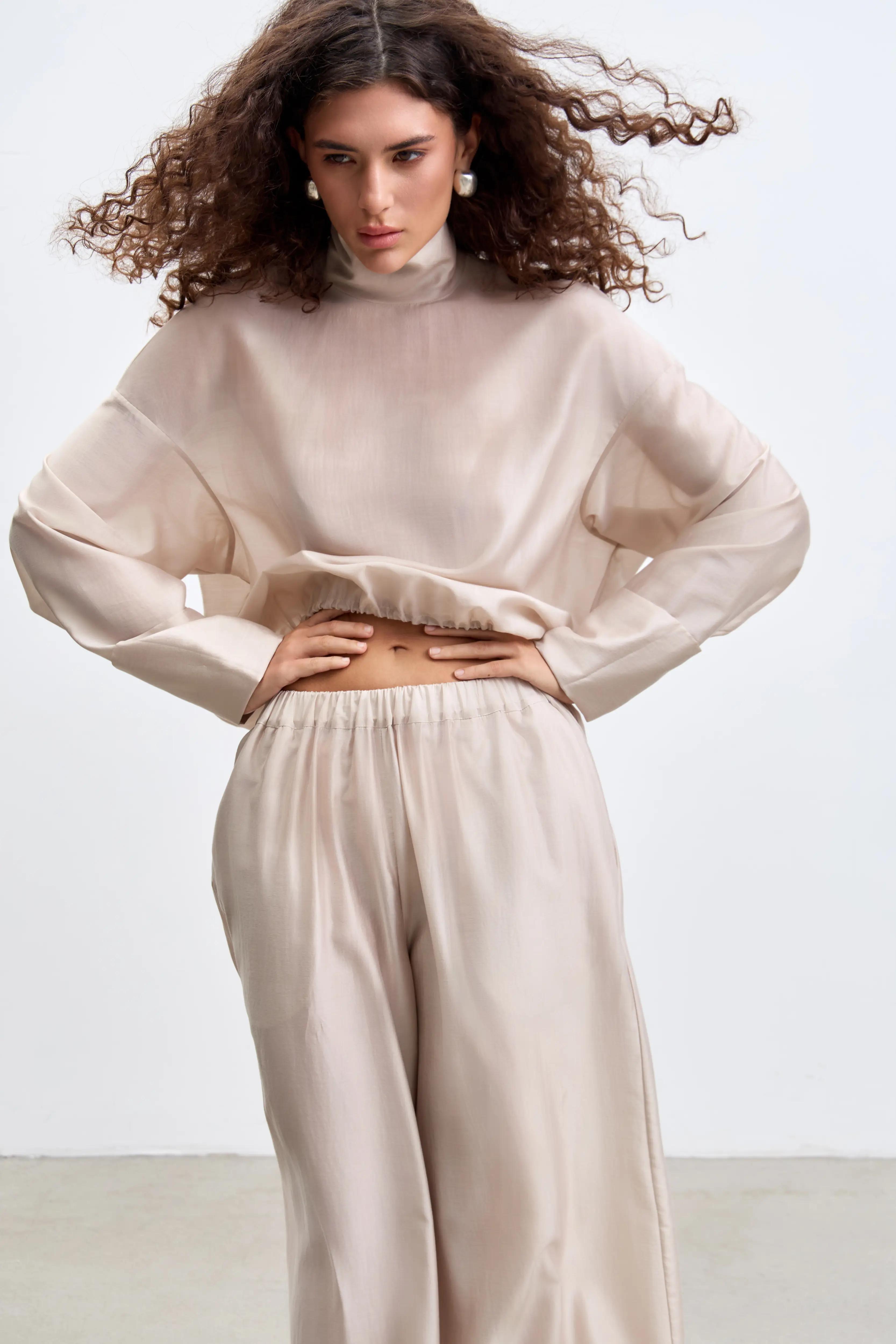 Брюки «Willie » — струящийся комфорт в оттенке latte silk— это воплощение расслабленной элегантности: ткань с деликатным сатиновым отливом, а широкие брючины создают эффект «жидкого шёлка» при каждом шаге. Лёгкие складки от пояса удлиняют силуэт.
