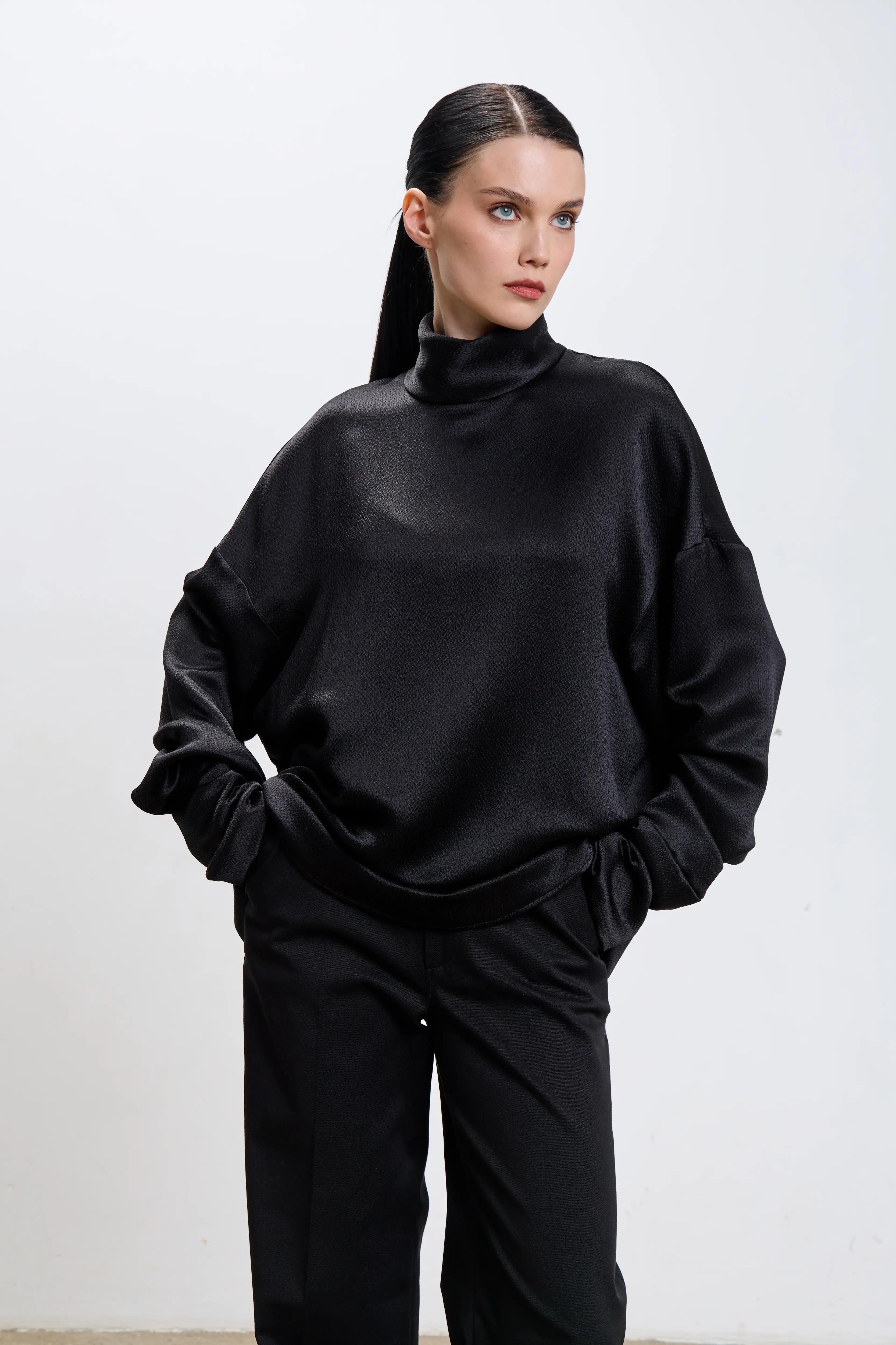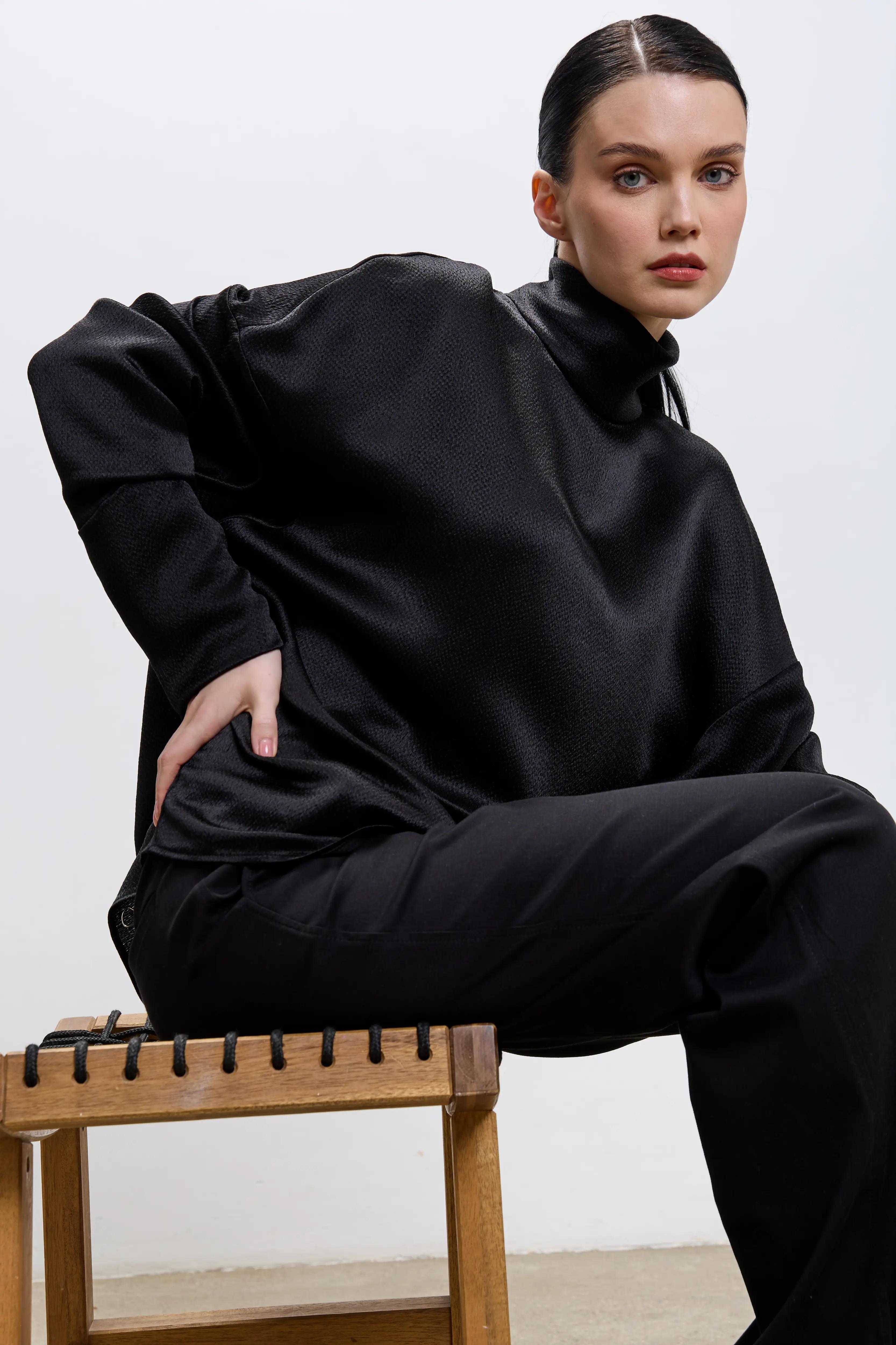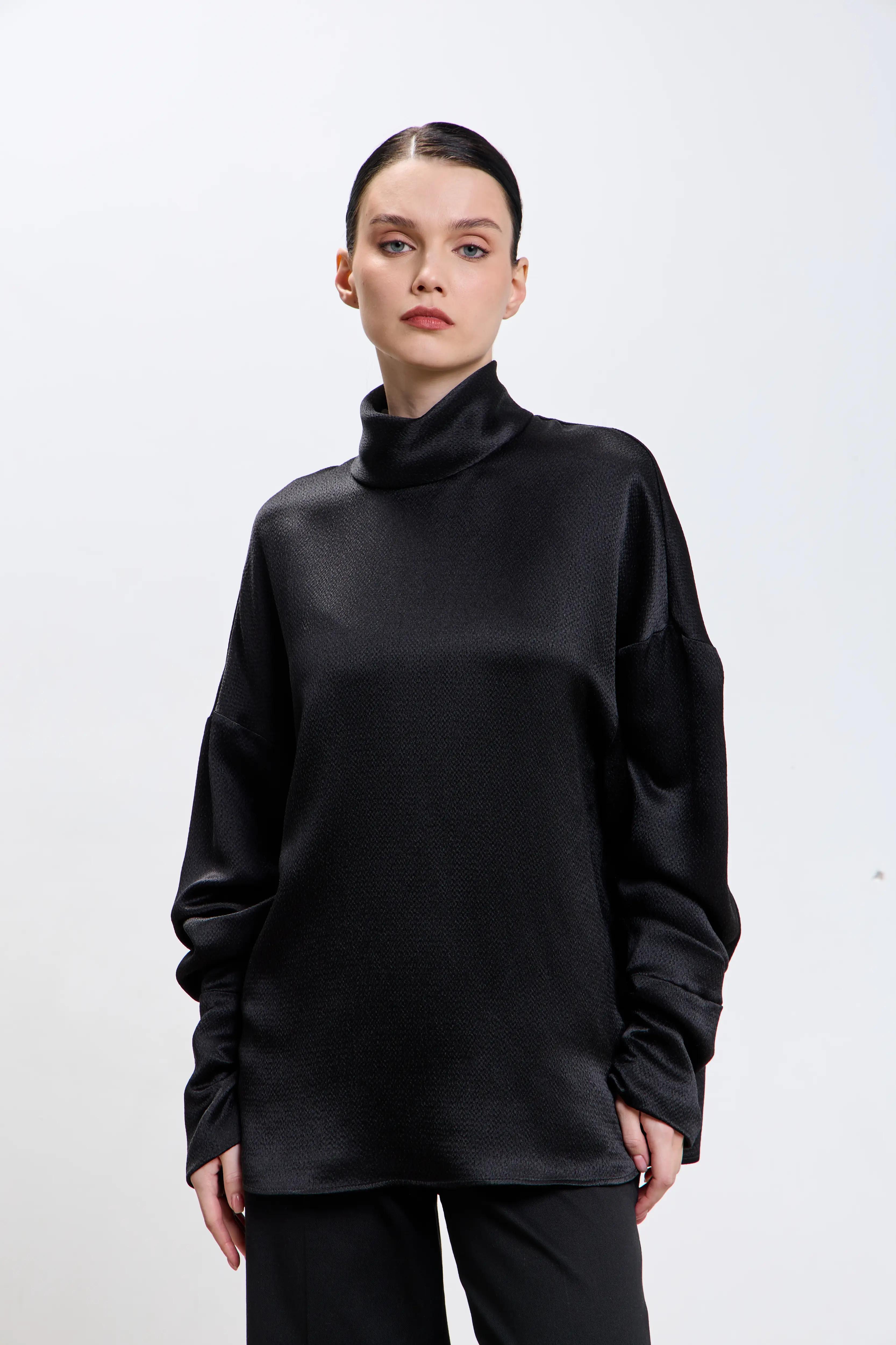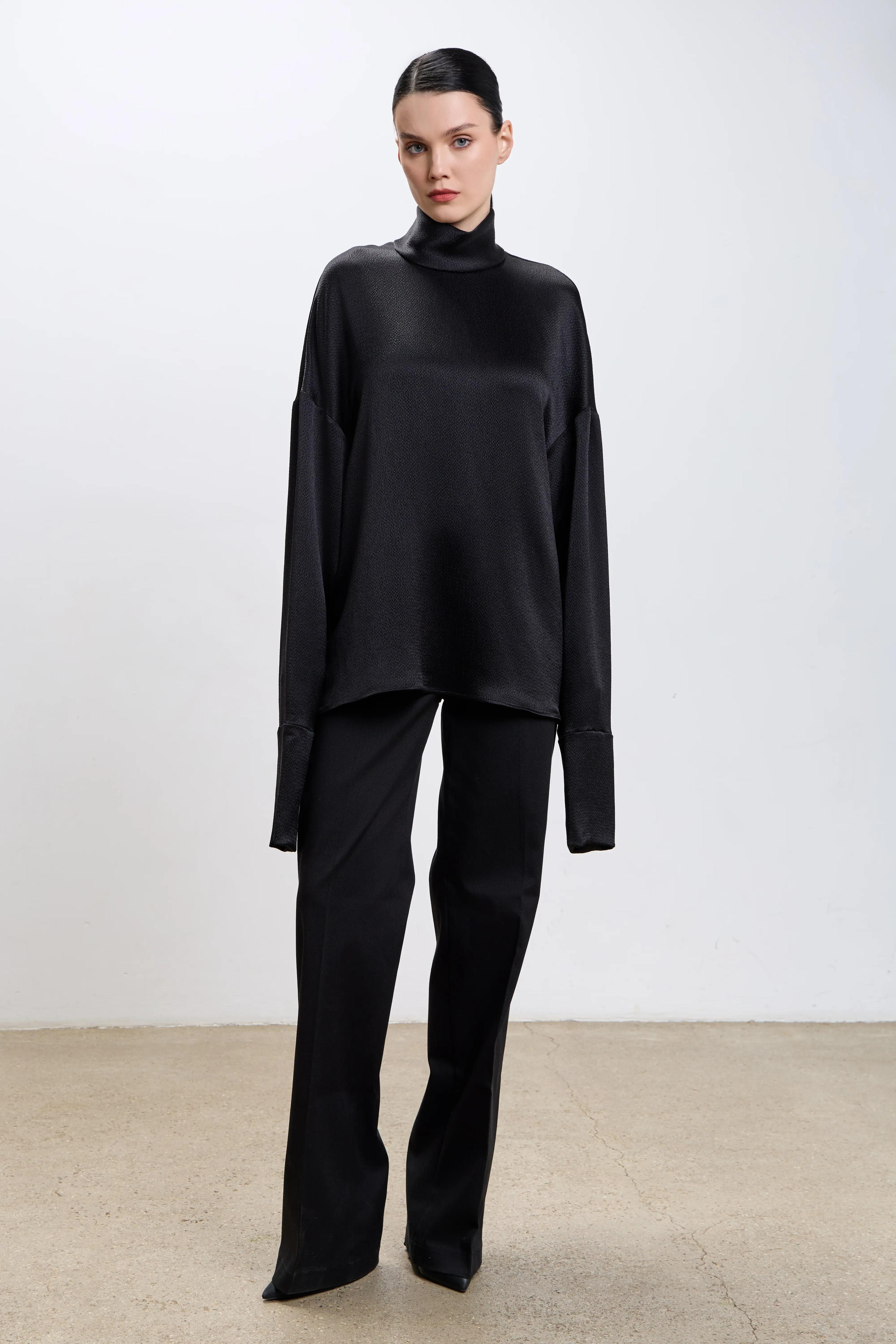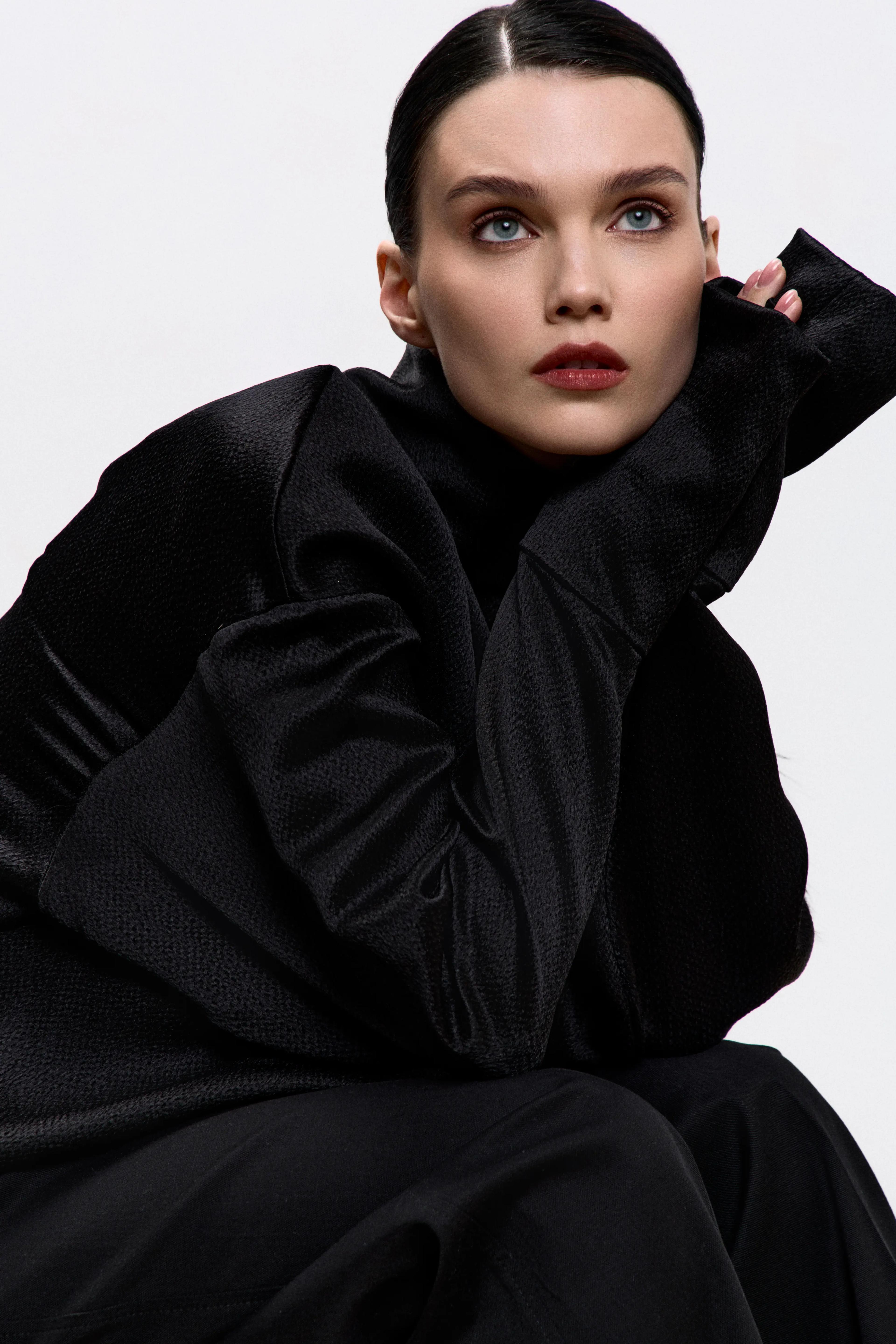 Элегантная блуза свободной посадки с цельнокроеным воротом, длинными рукавами и застежкой-петлей на спинке. Модель выполнена из шелка с рельефом.