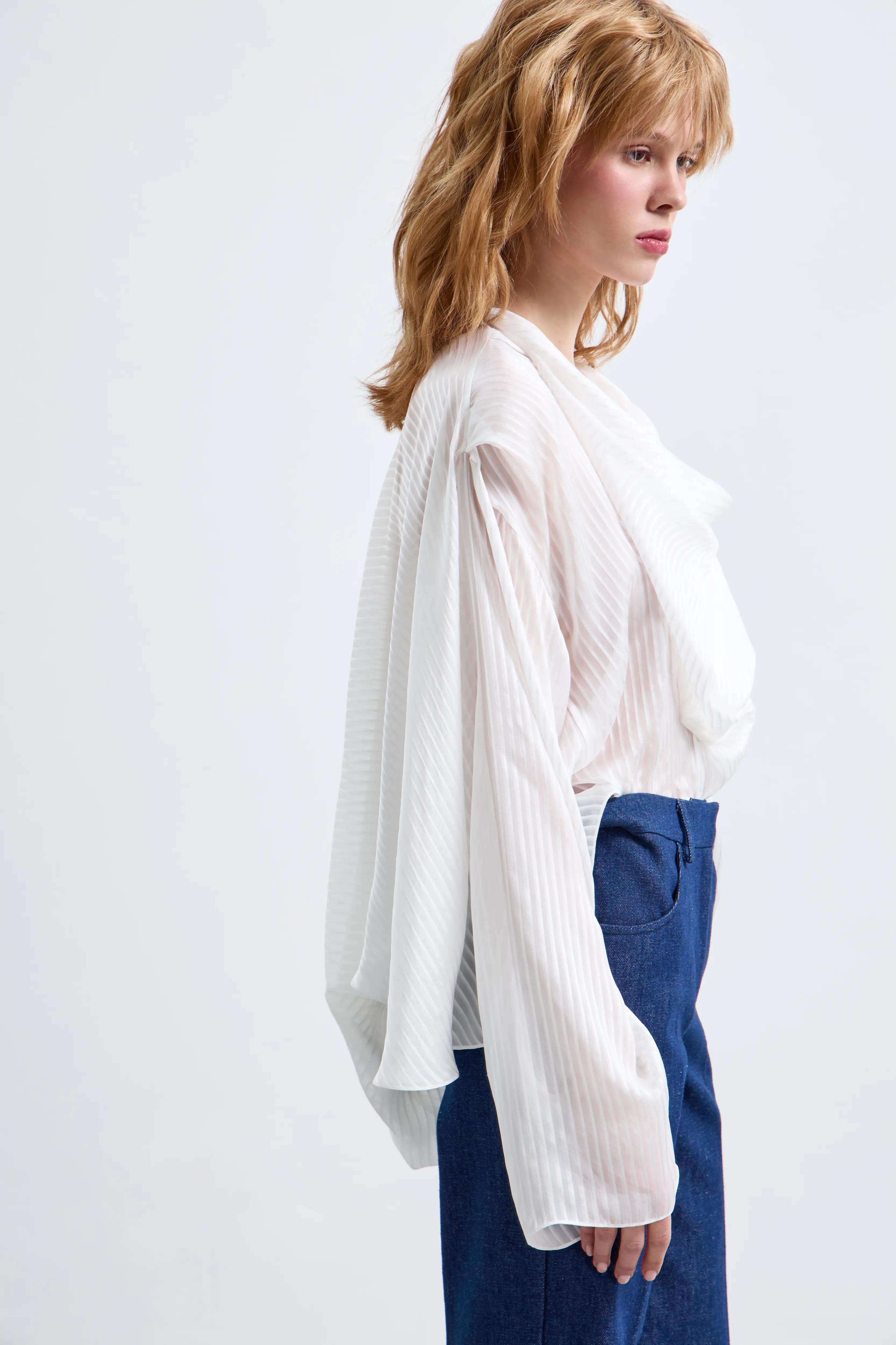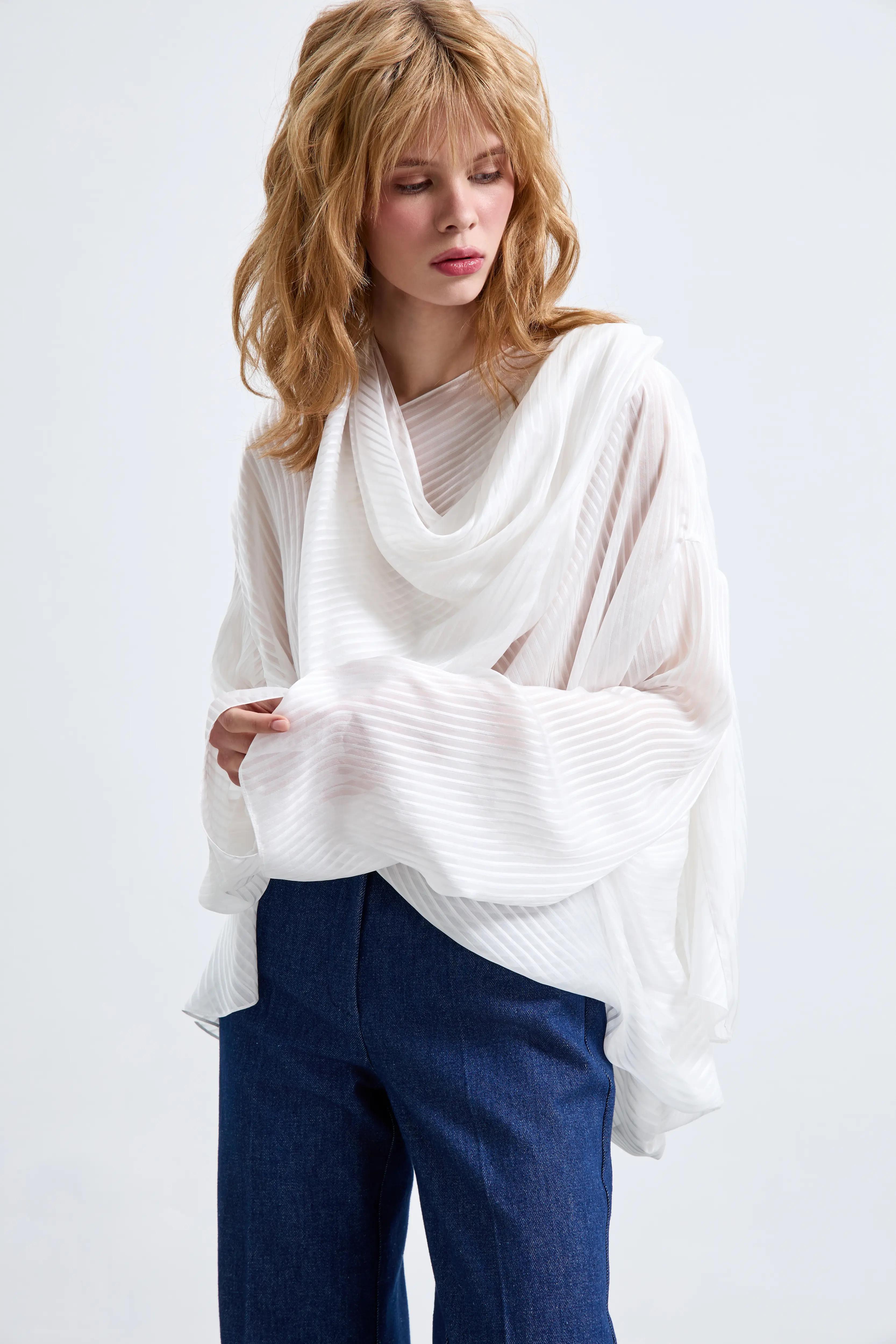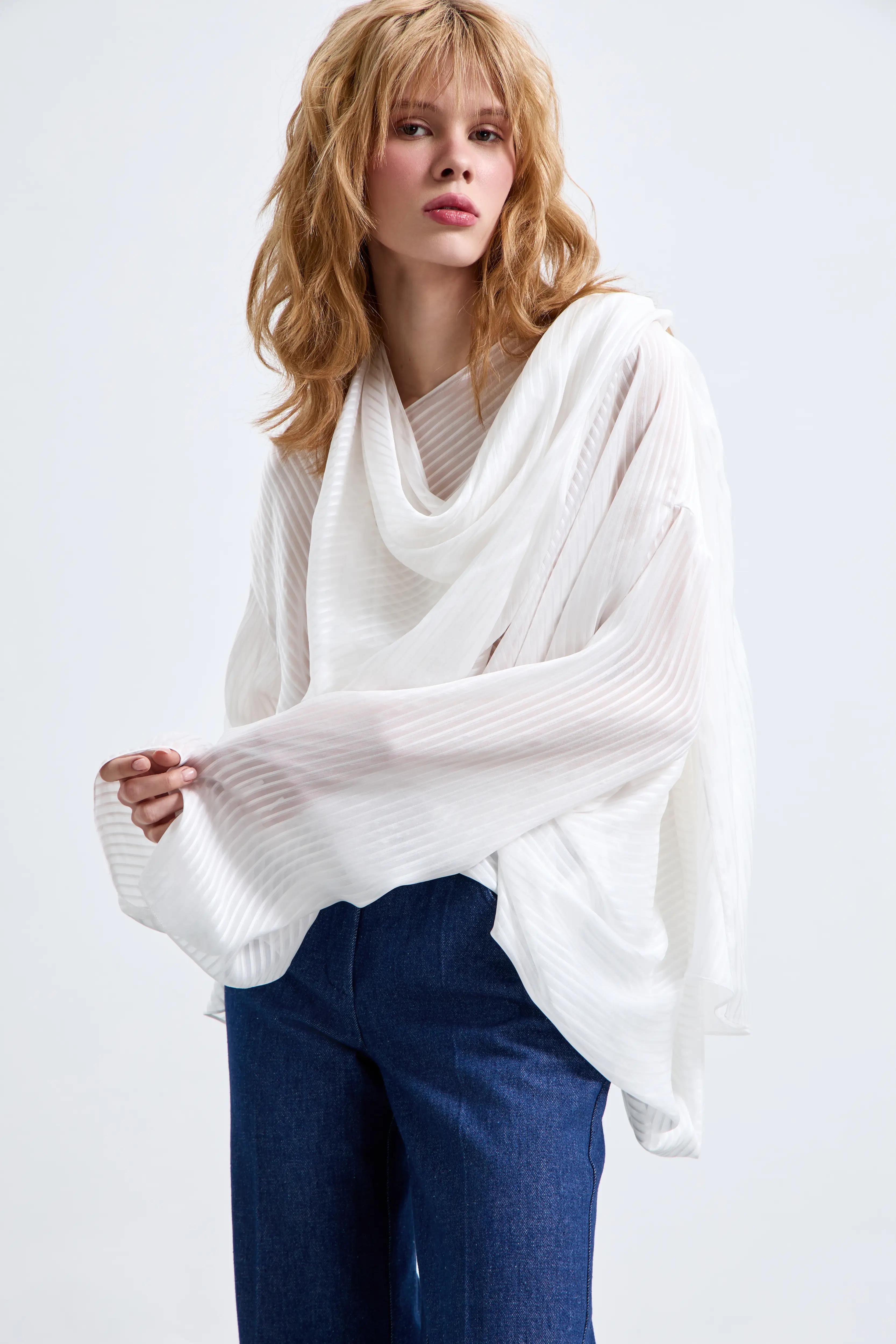 Мягкая драпировка, удлинённая асимметричная линия и объёмные рукава создают эффект текучего силуэта. Полупрозрачность добавляет образу легкость и делает модель универсальной для дневных и вечерних образов.
