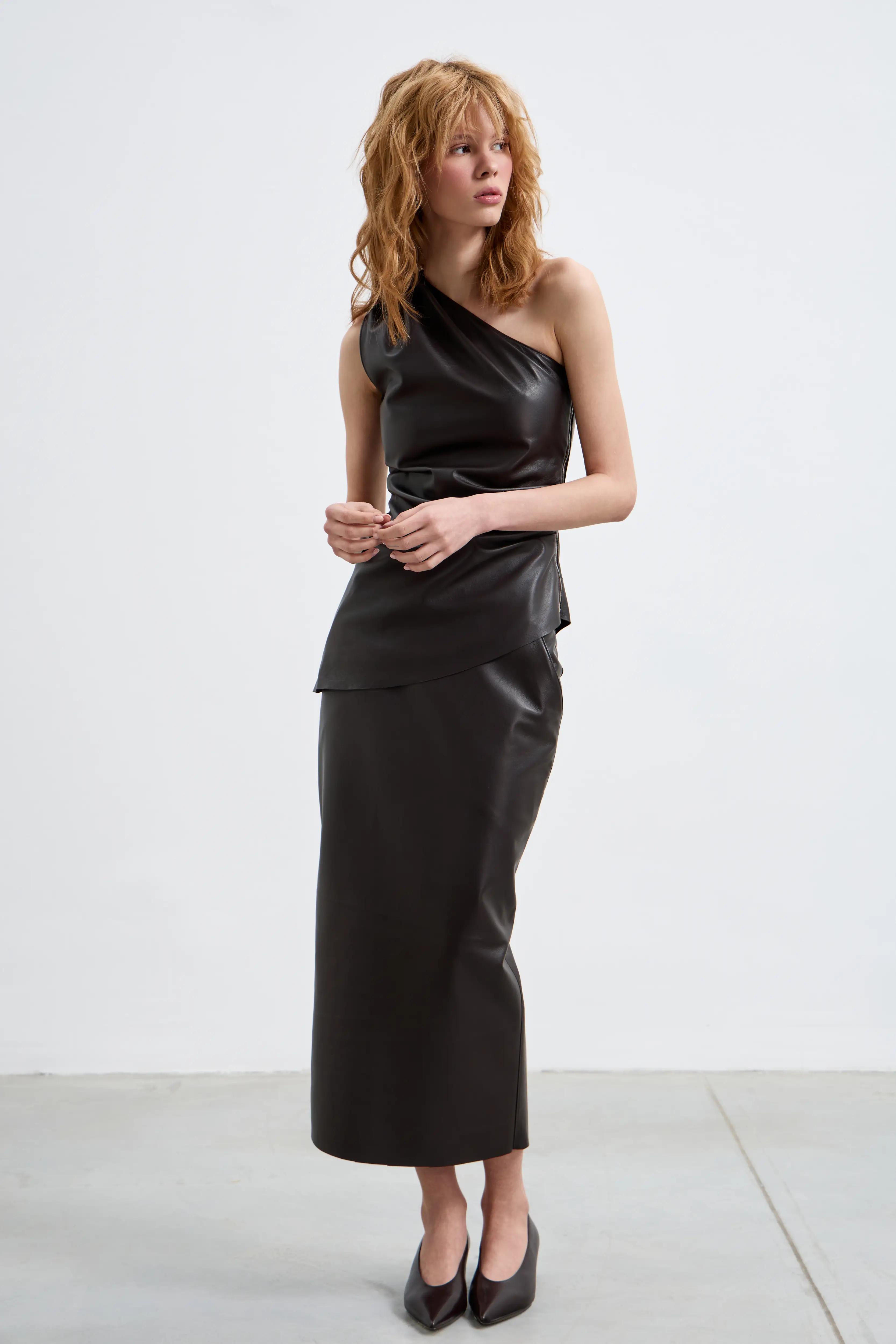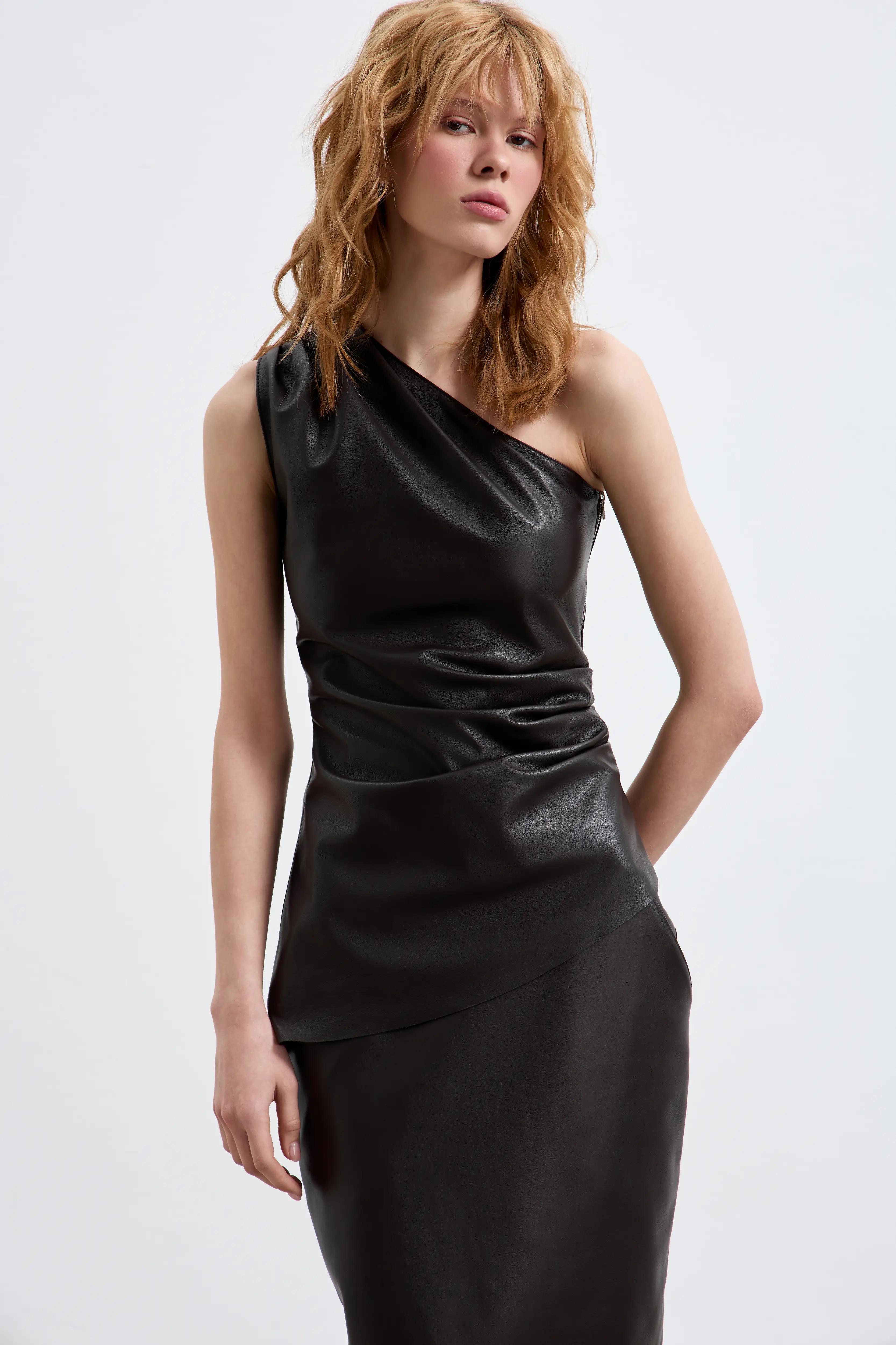 Асимметричный топ из гладкой мягкой кожи. Линия одного плеча открывает ключицы и придаёт образу современную графичность. Топ выполнен из натуральной кожи.