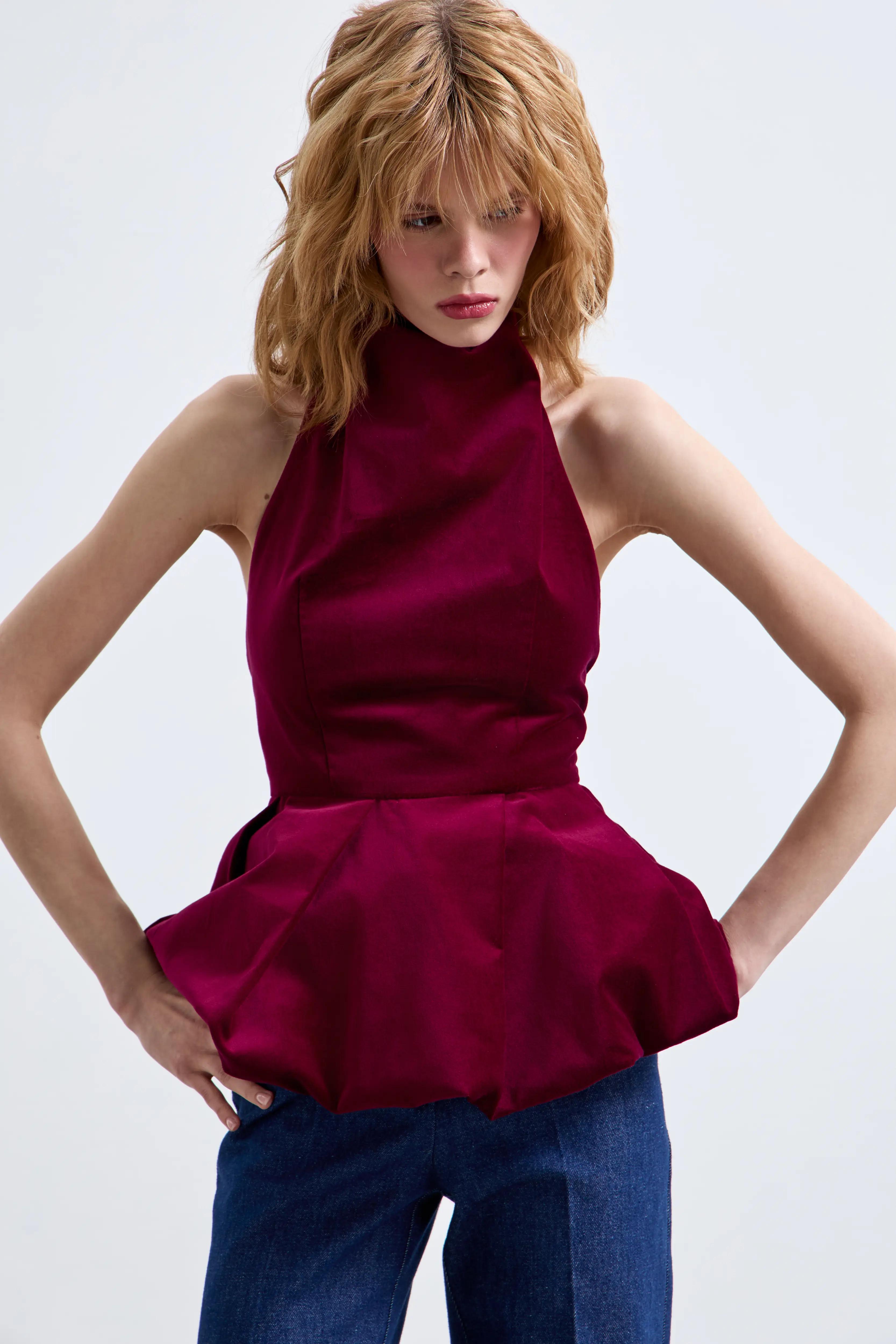 Выразительный топ из бархата в глубоком винном оттенке. Скульптурный силуэт, высокий ворот и открытая спина создают чувственный образ с безупречной линией. Объемная баска добавляет архитектурность и подчеркивает талию.
