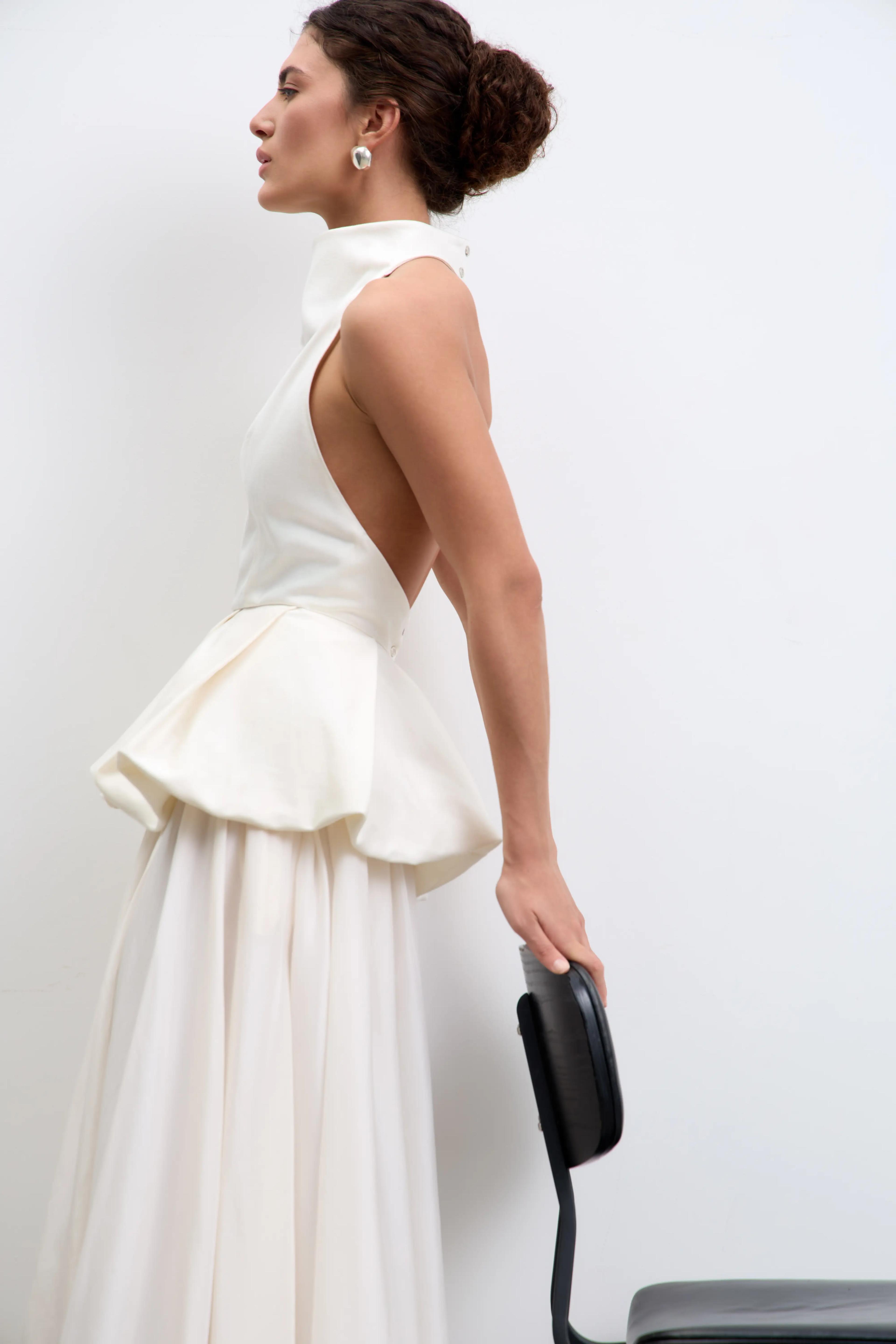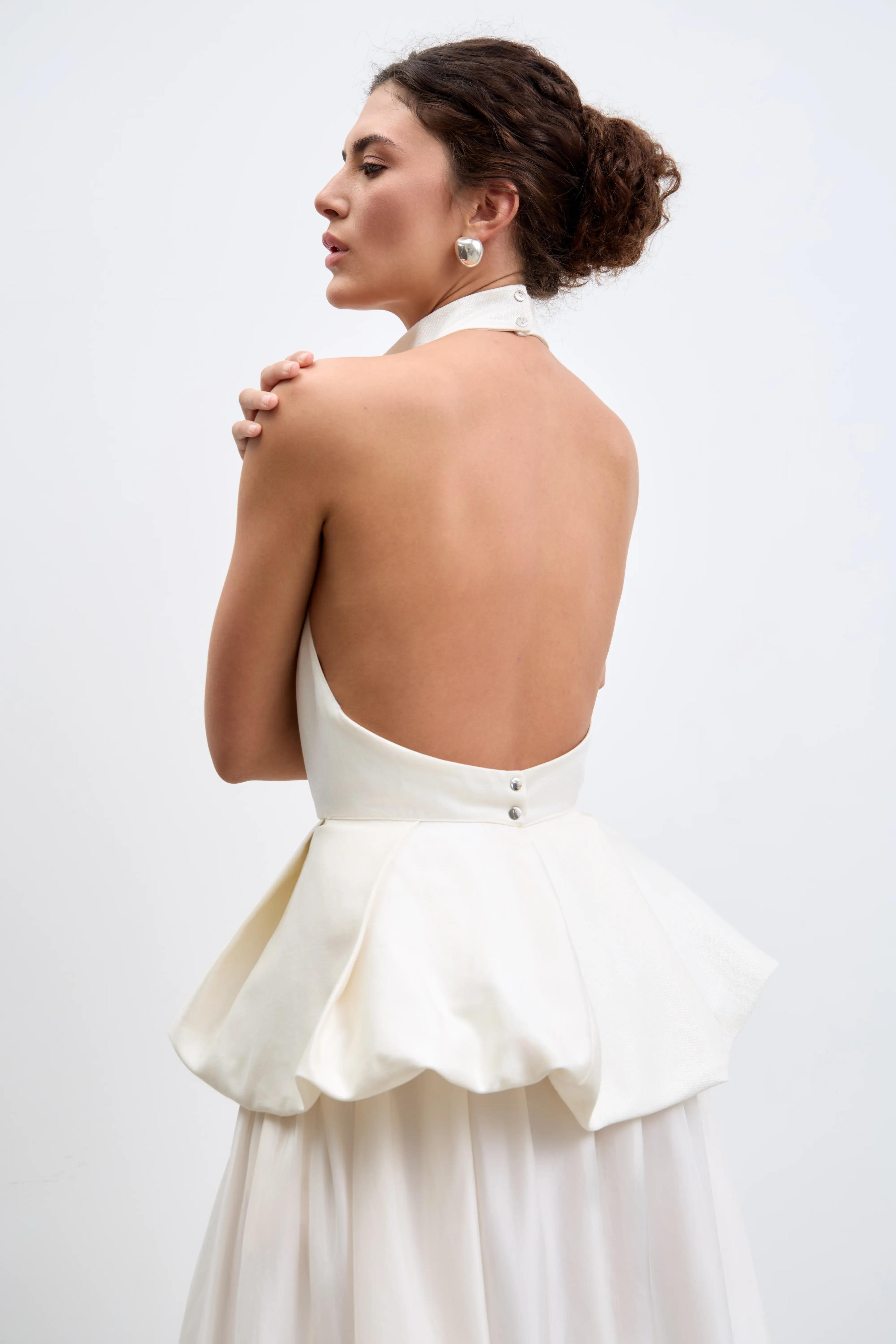 Высокий ворот-стойка, открытая спина на двух кнопках.