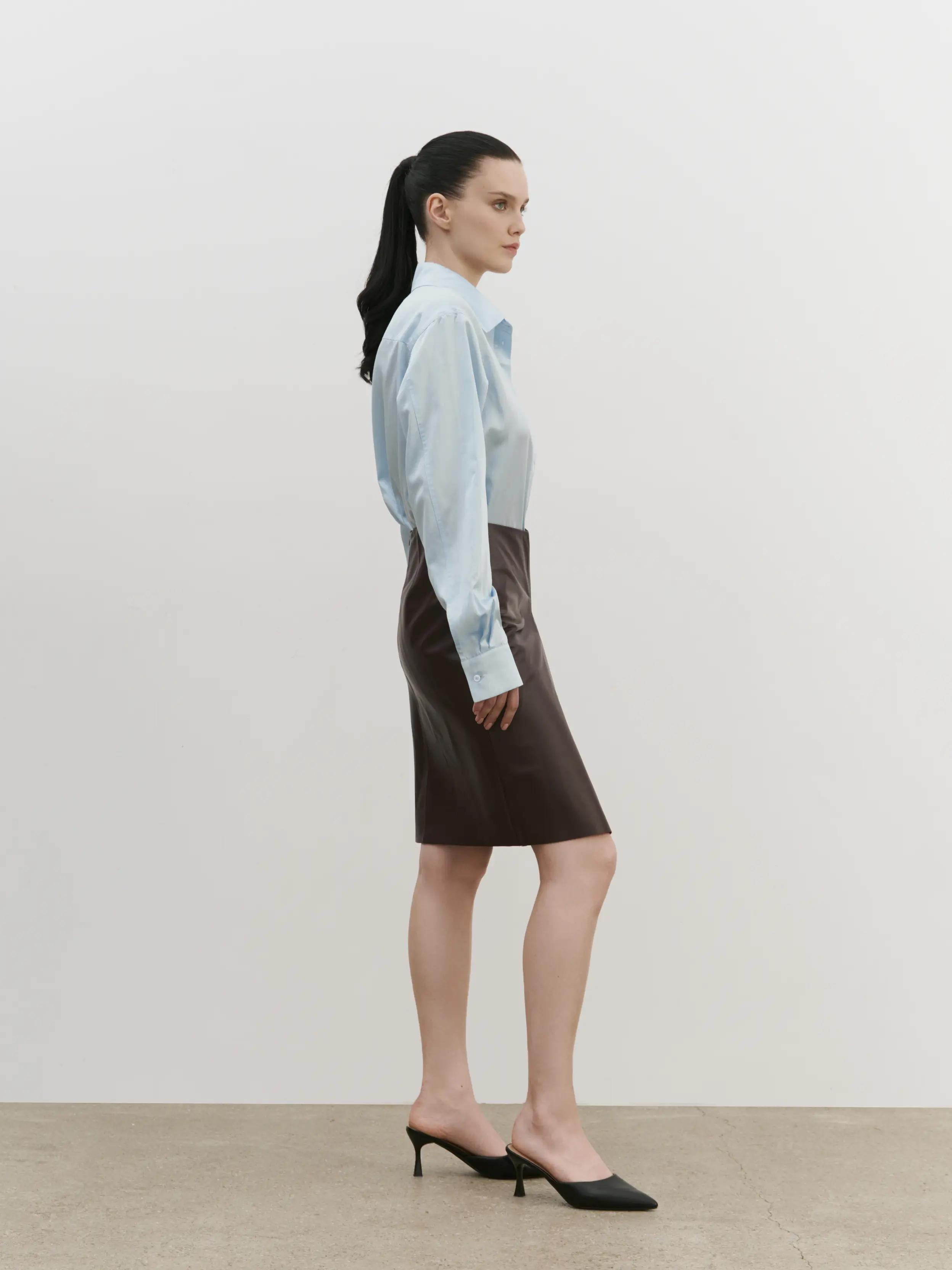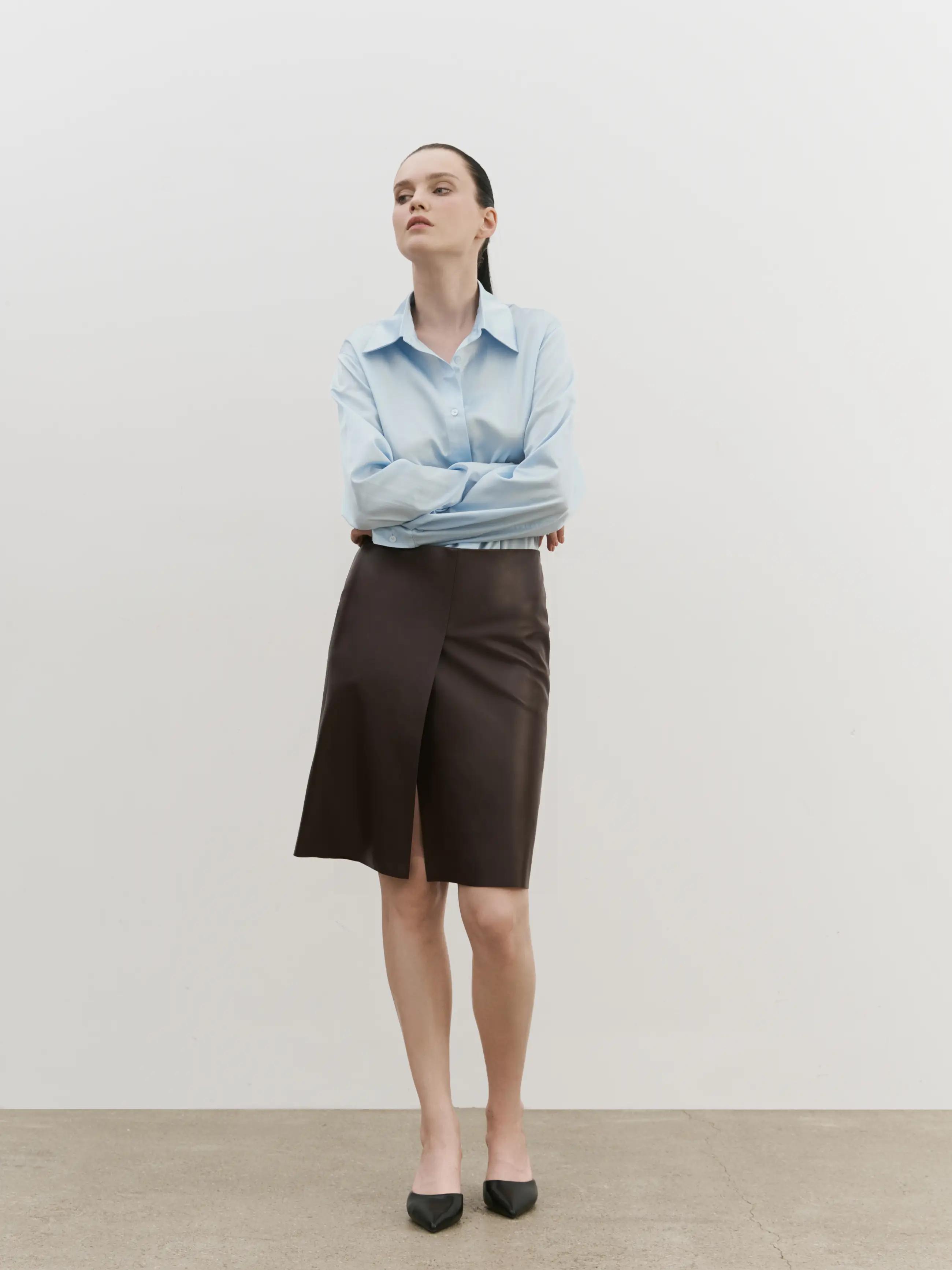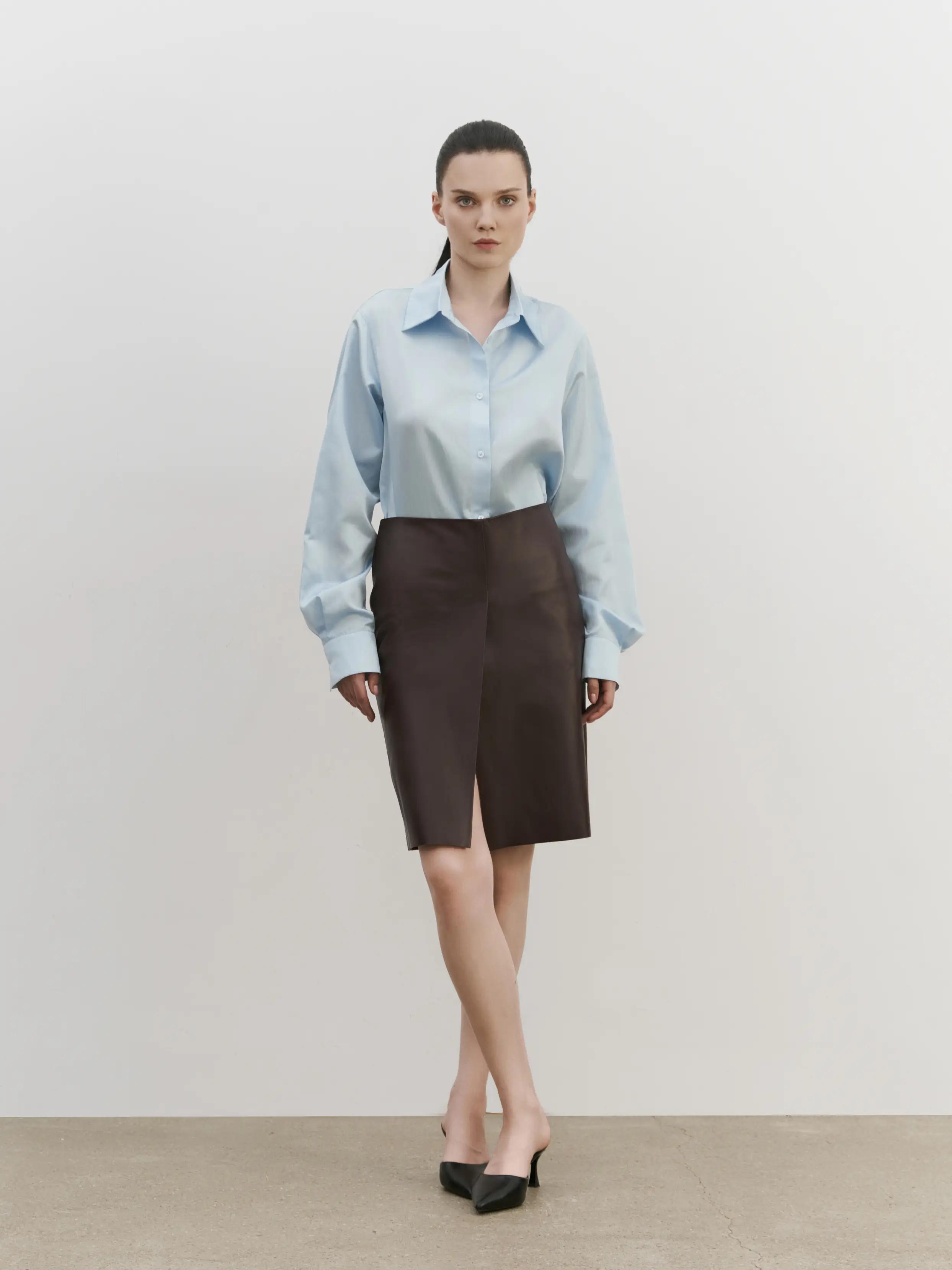 Кожаная юбка с разрезом спереди, из мягкой итальянской телячьей кожи, посадка на бедрах.
