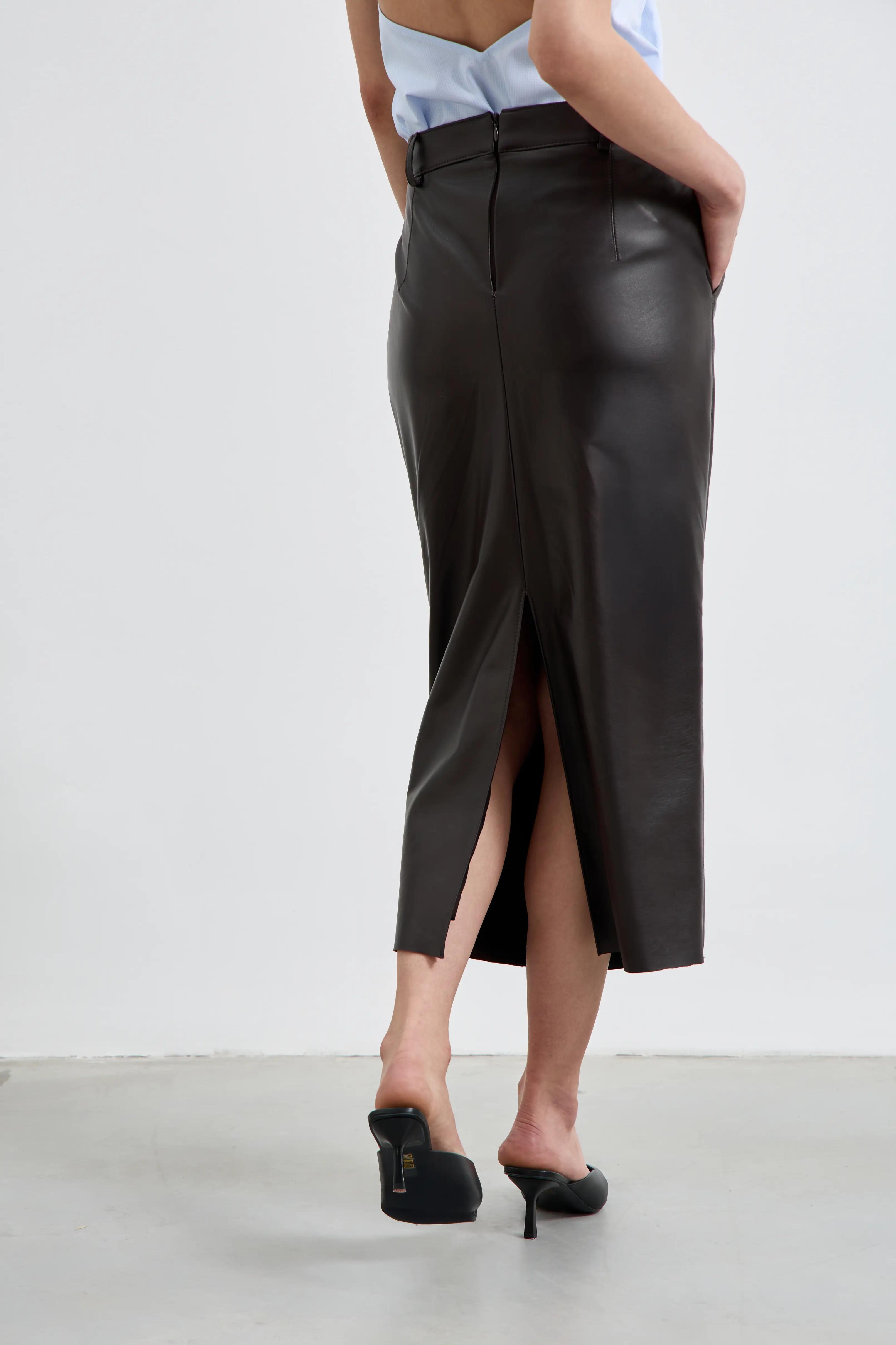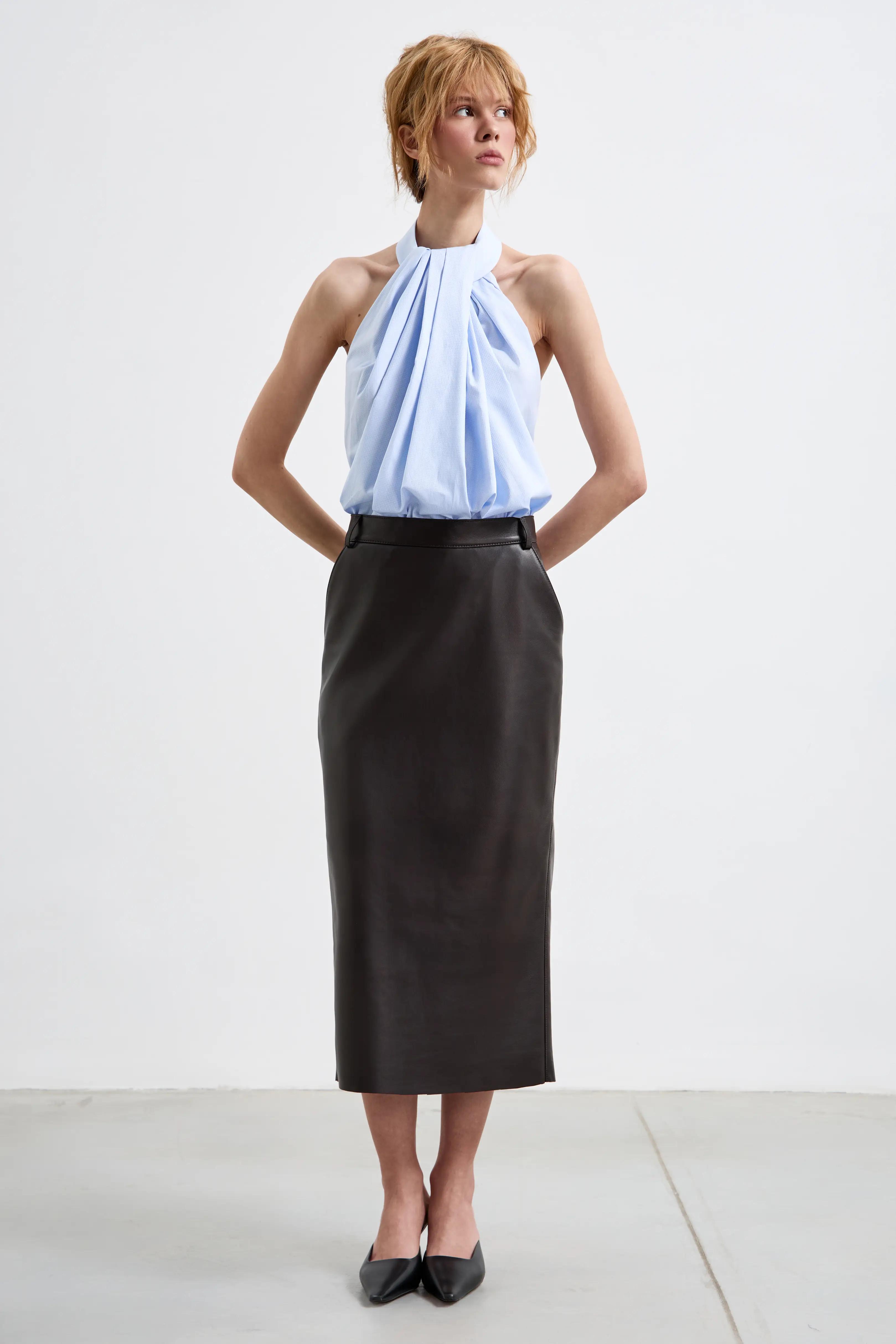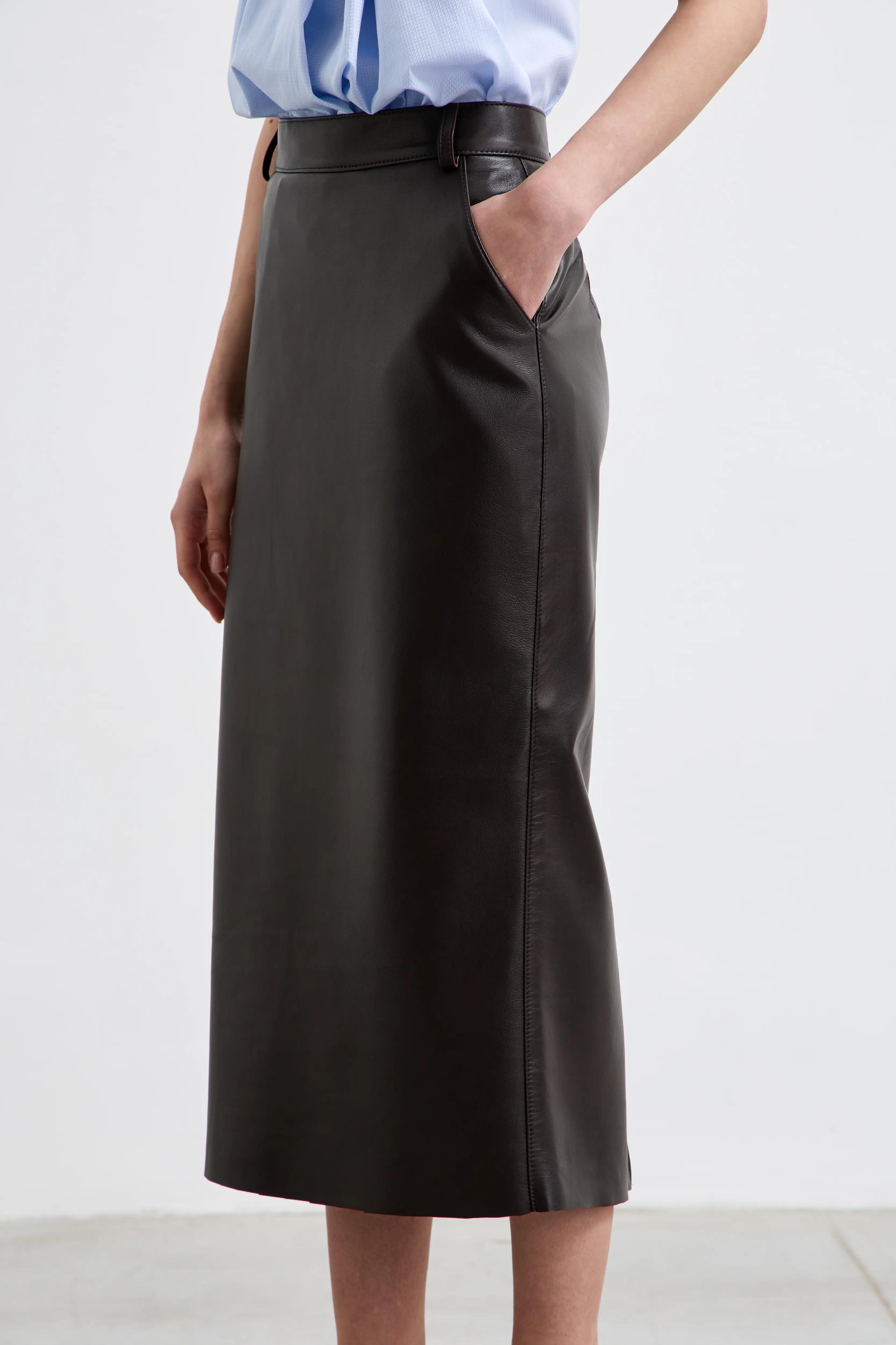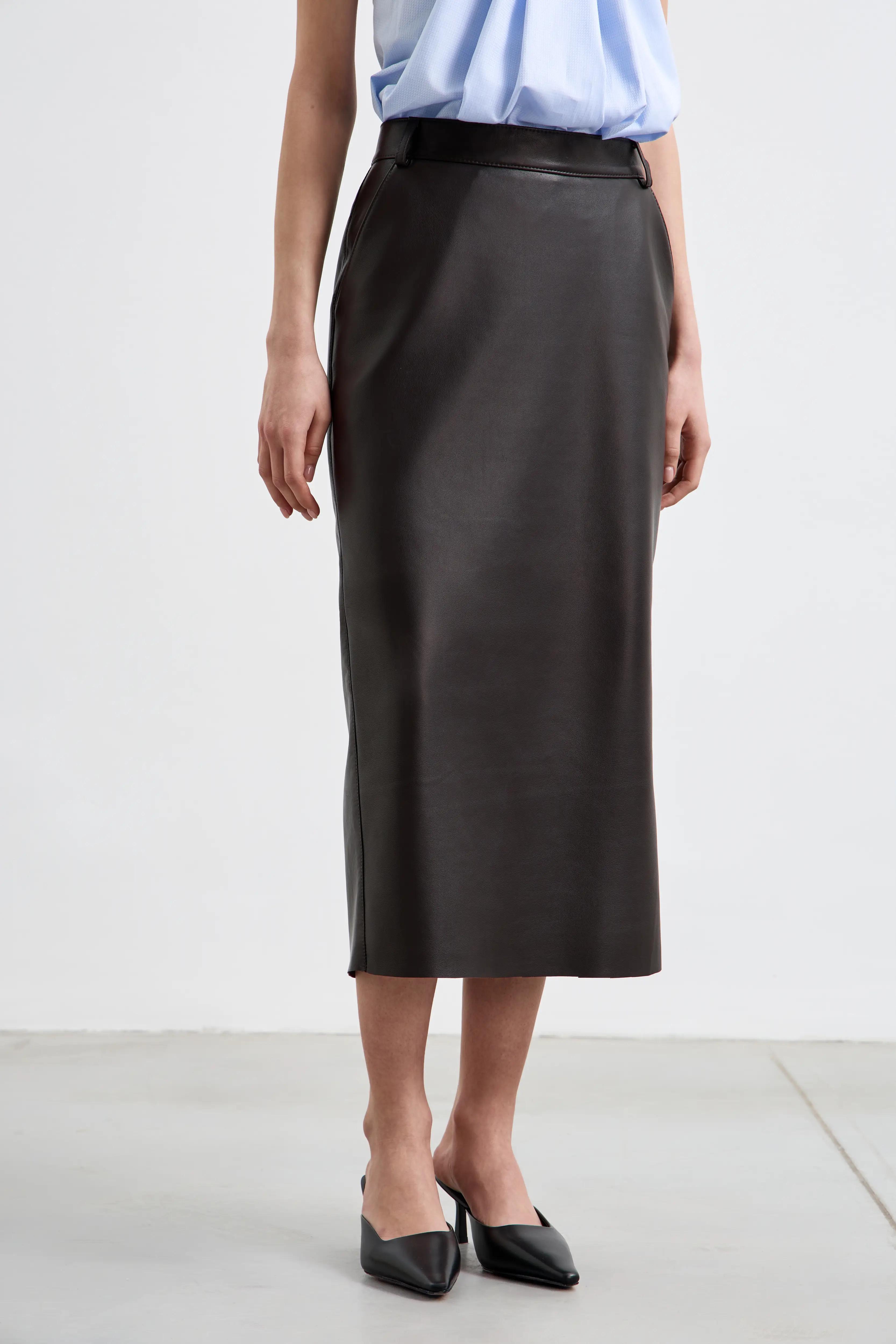 Юбка миди из гладкой мягкой кожи с прямым силуэтом. Высокая посадка аккуратно подчёркивает линию талии, а разрез сзади обеспечивает свободу движения. Боковые карманы добавляют практичности и делают модель более расслабленной в стилизации.
