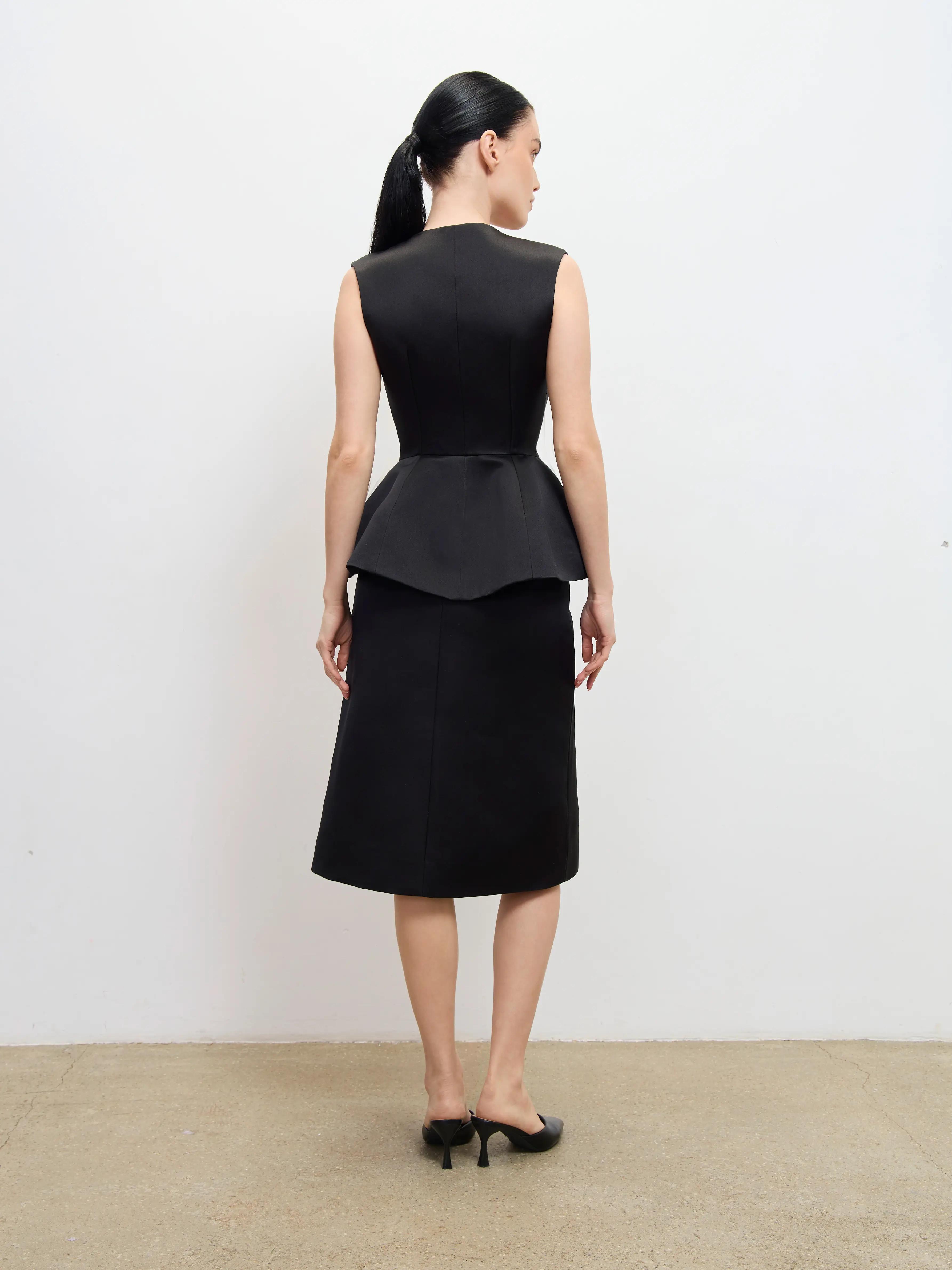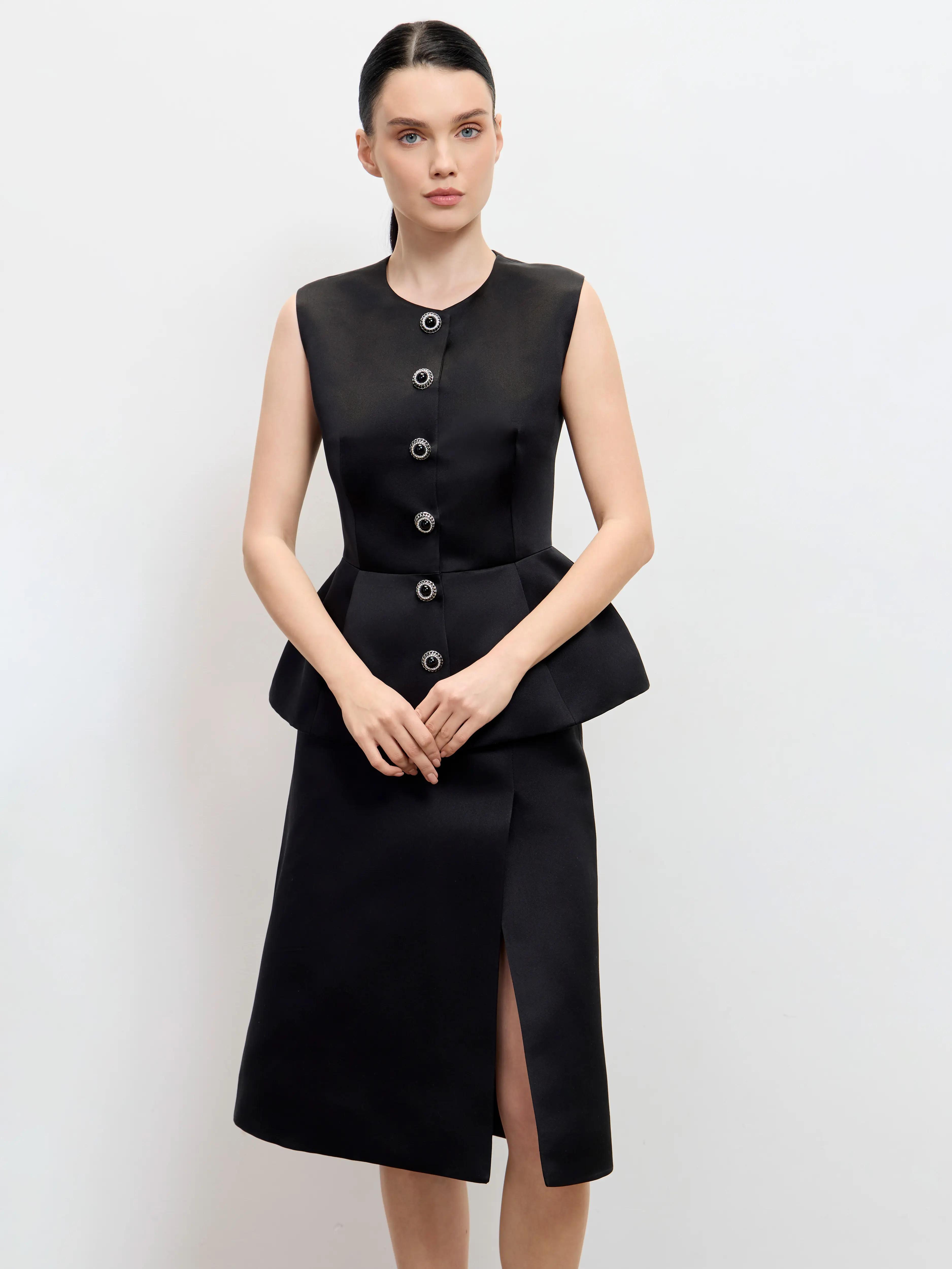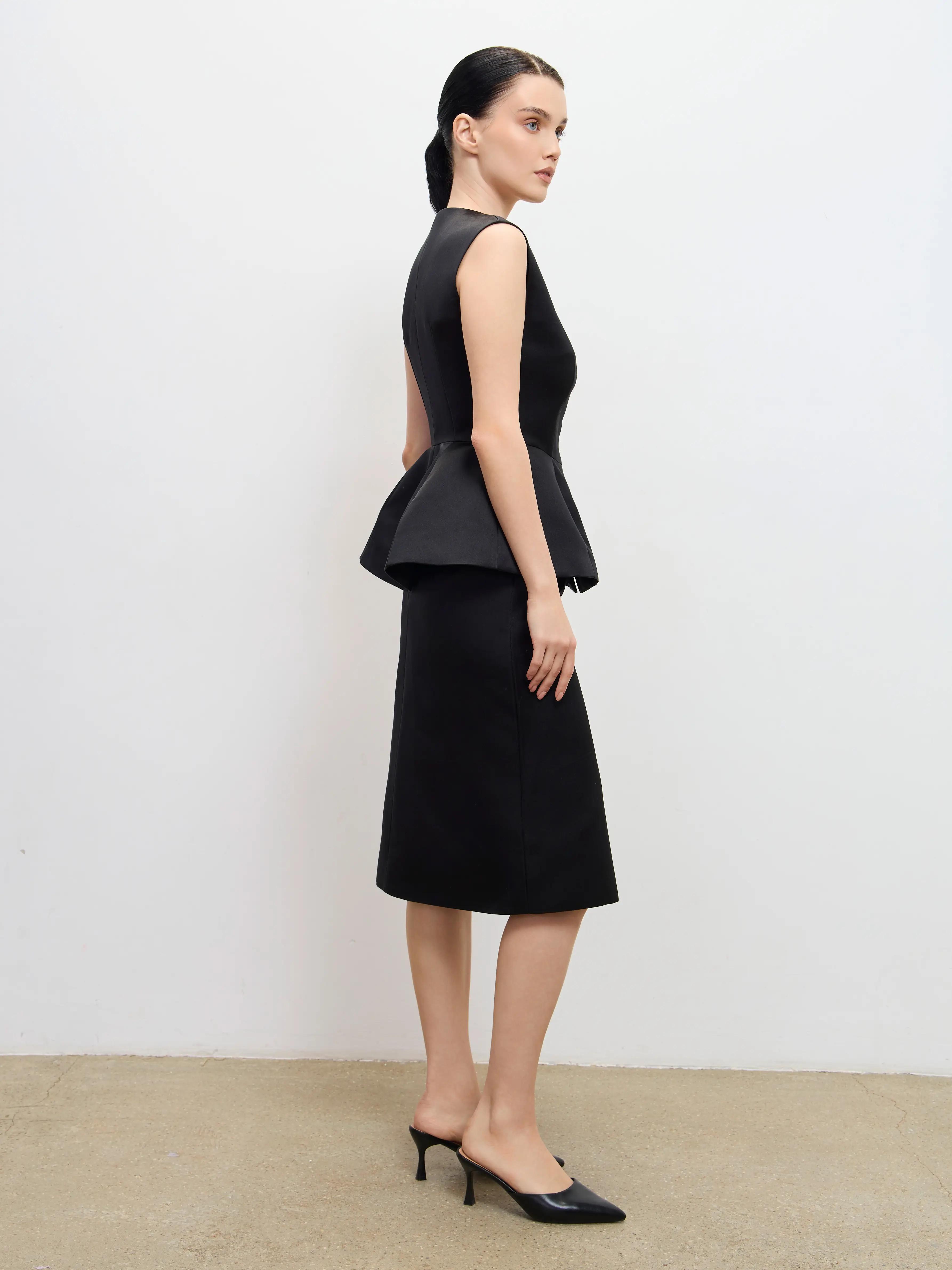 Юбка прямого кроя из плотного шелка, на молнии с разрезом, посадка на бедрах.