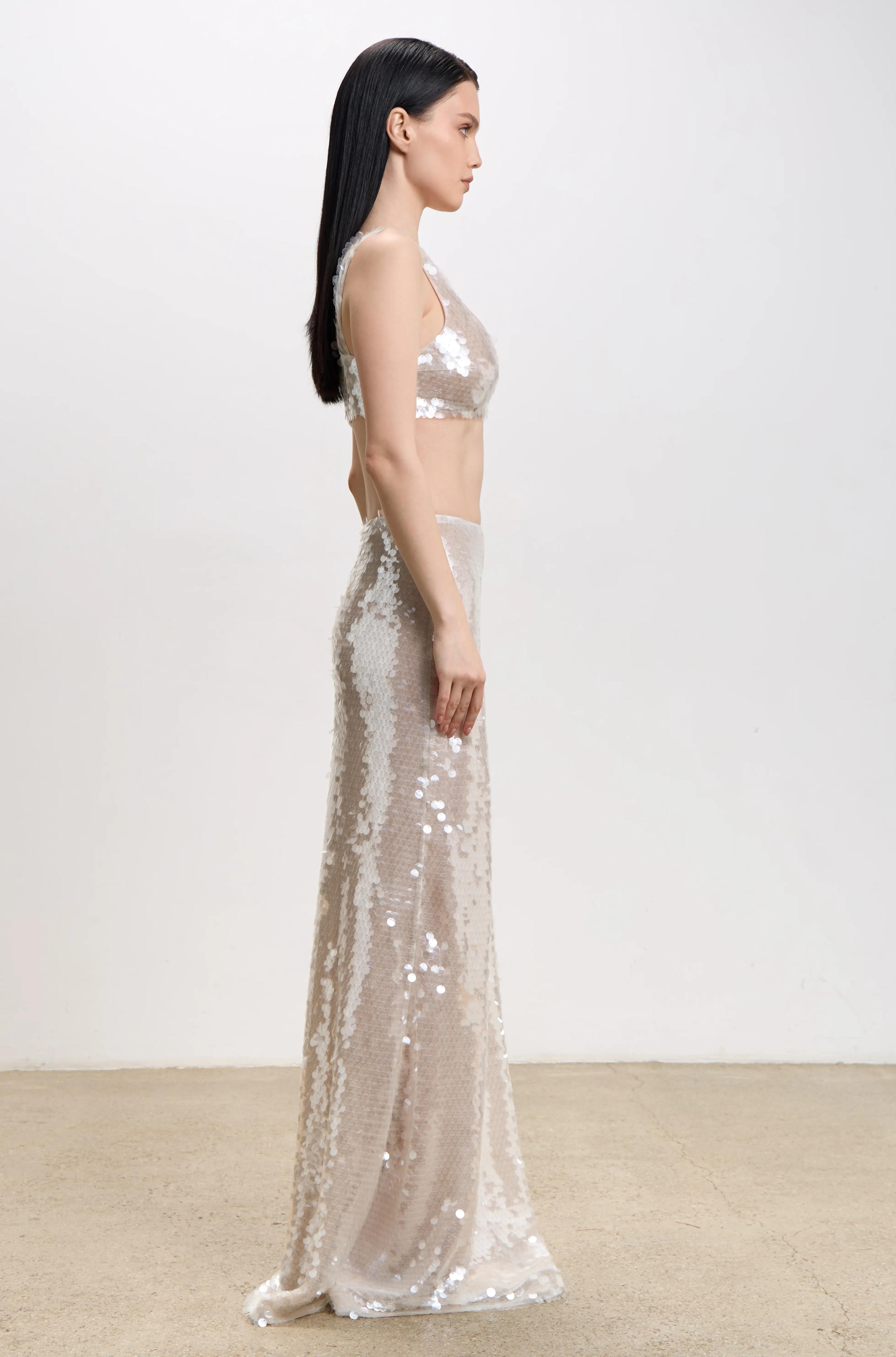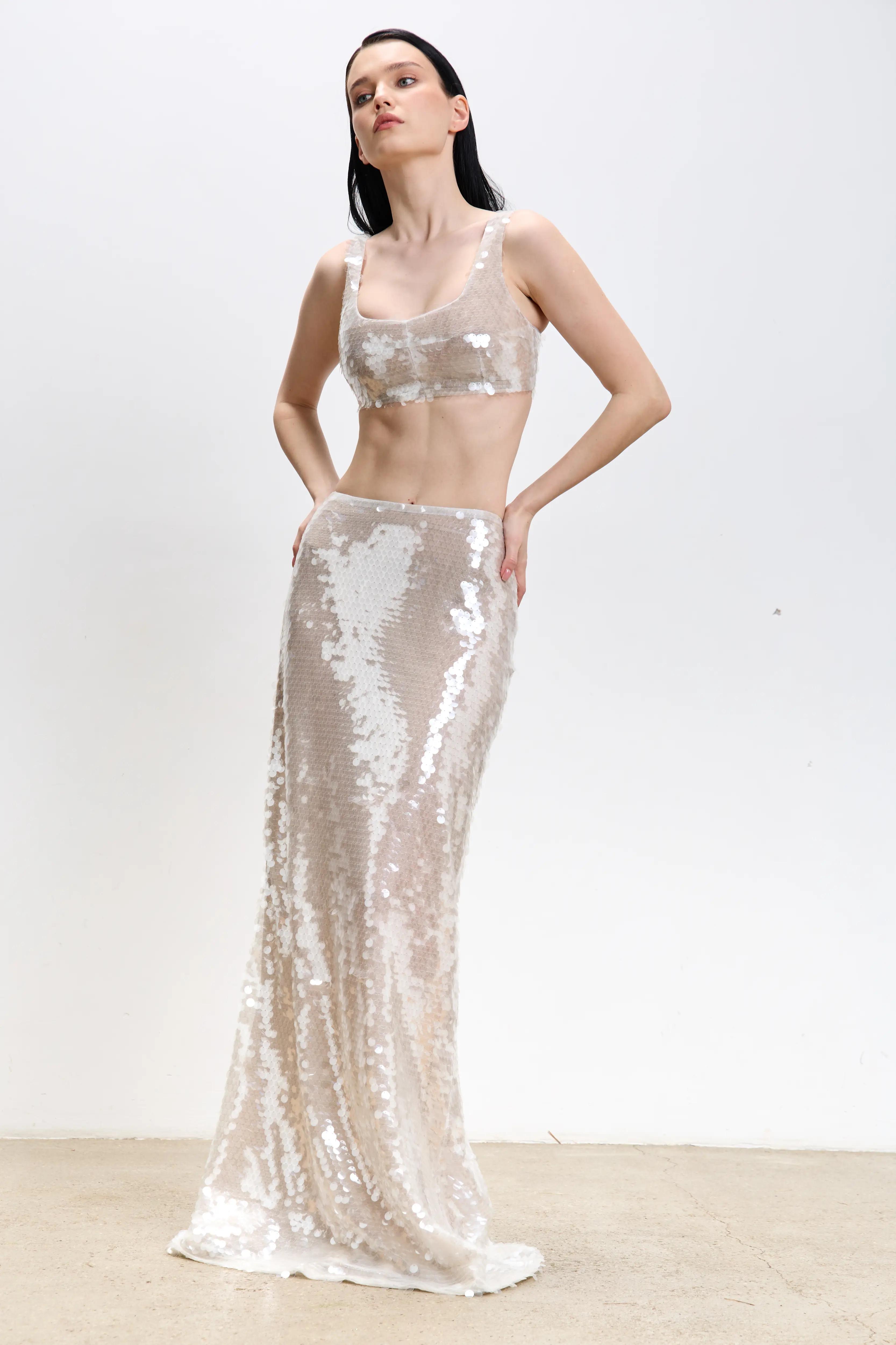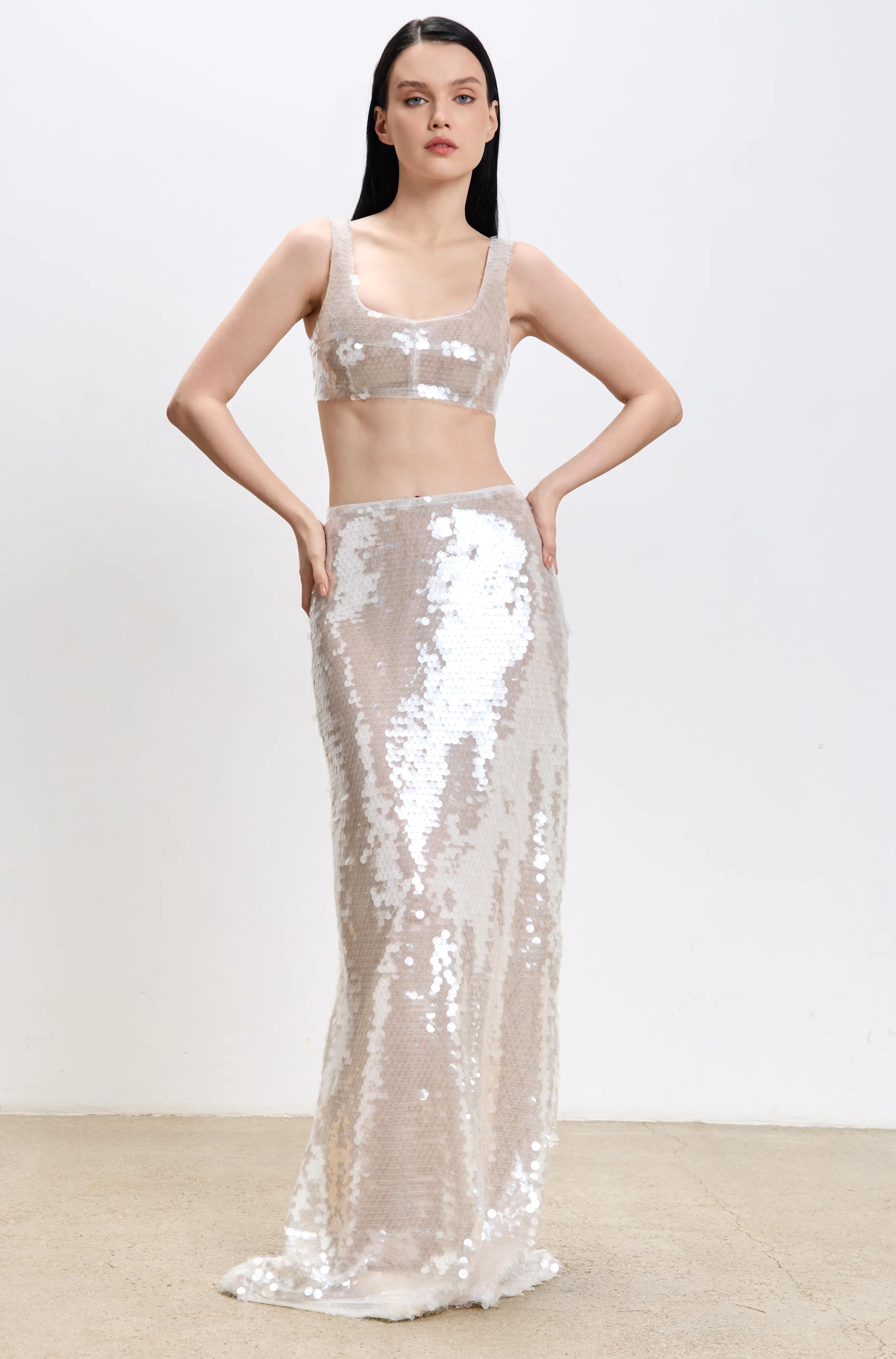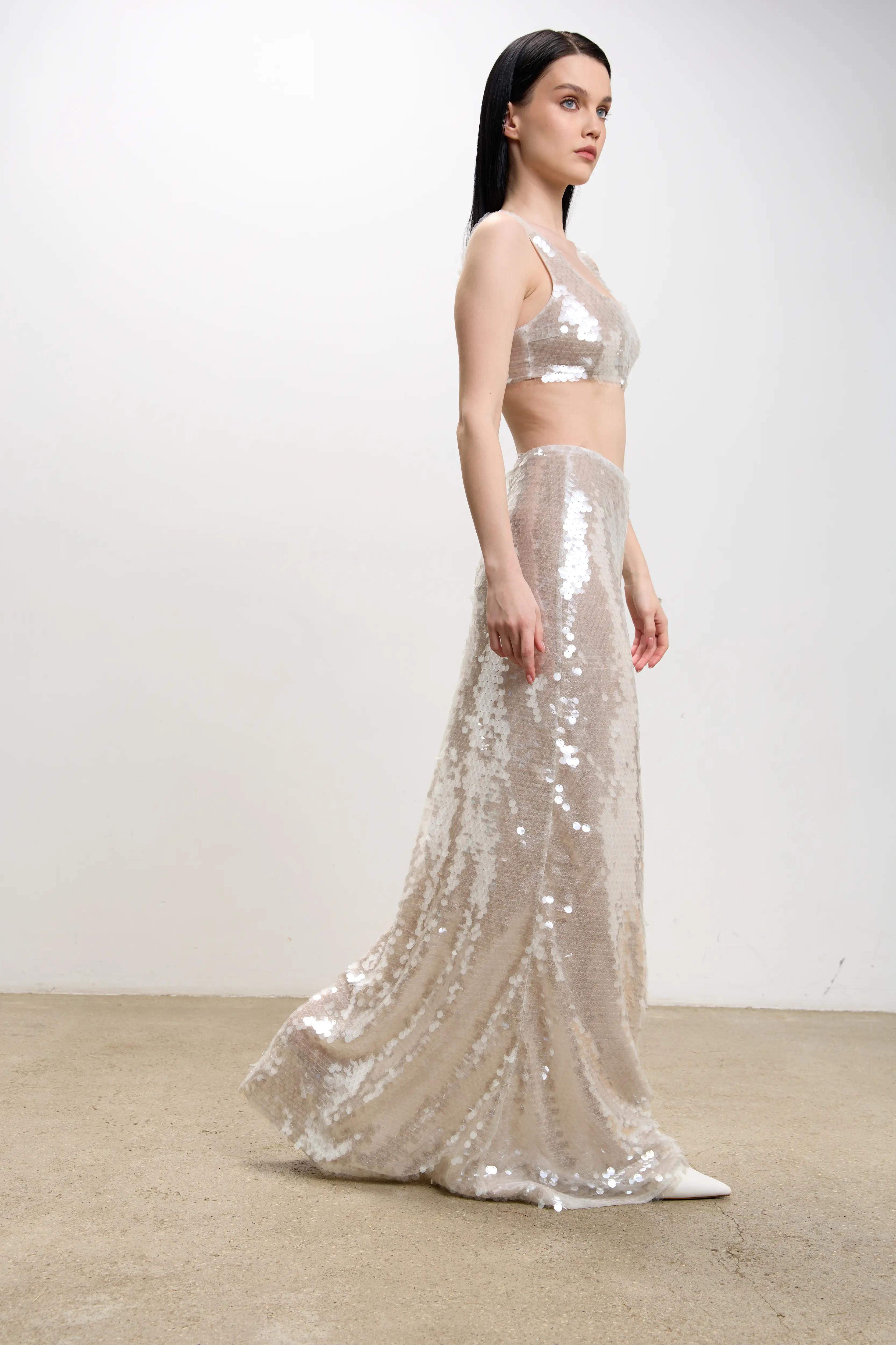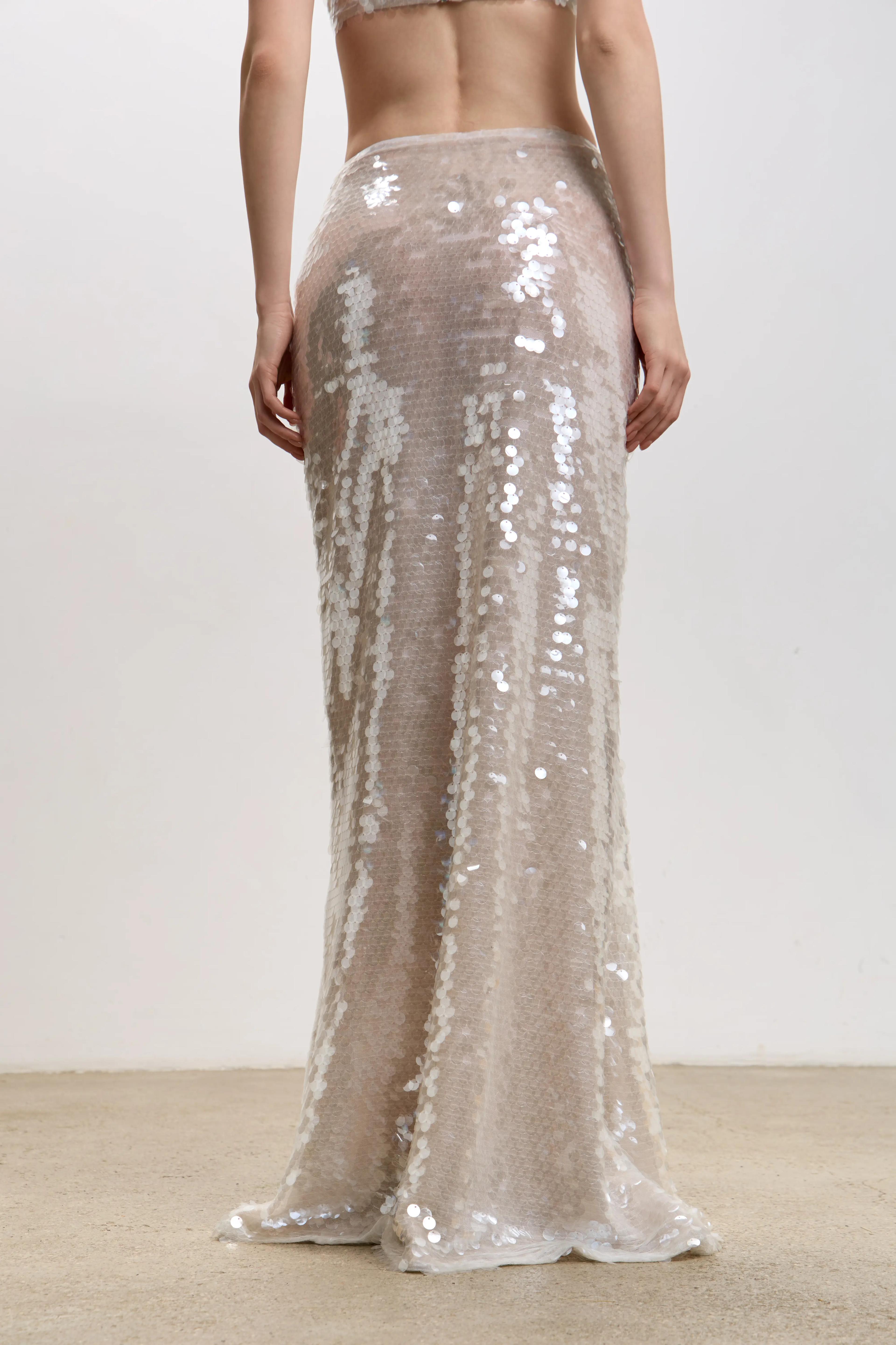 Юбка длины макси из прозрачных пайеток на хлопковом подкладе. Модель со средне-низкой посадкой. Юбку можно стилизовать с топом из прозрачных пайеток.
