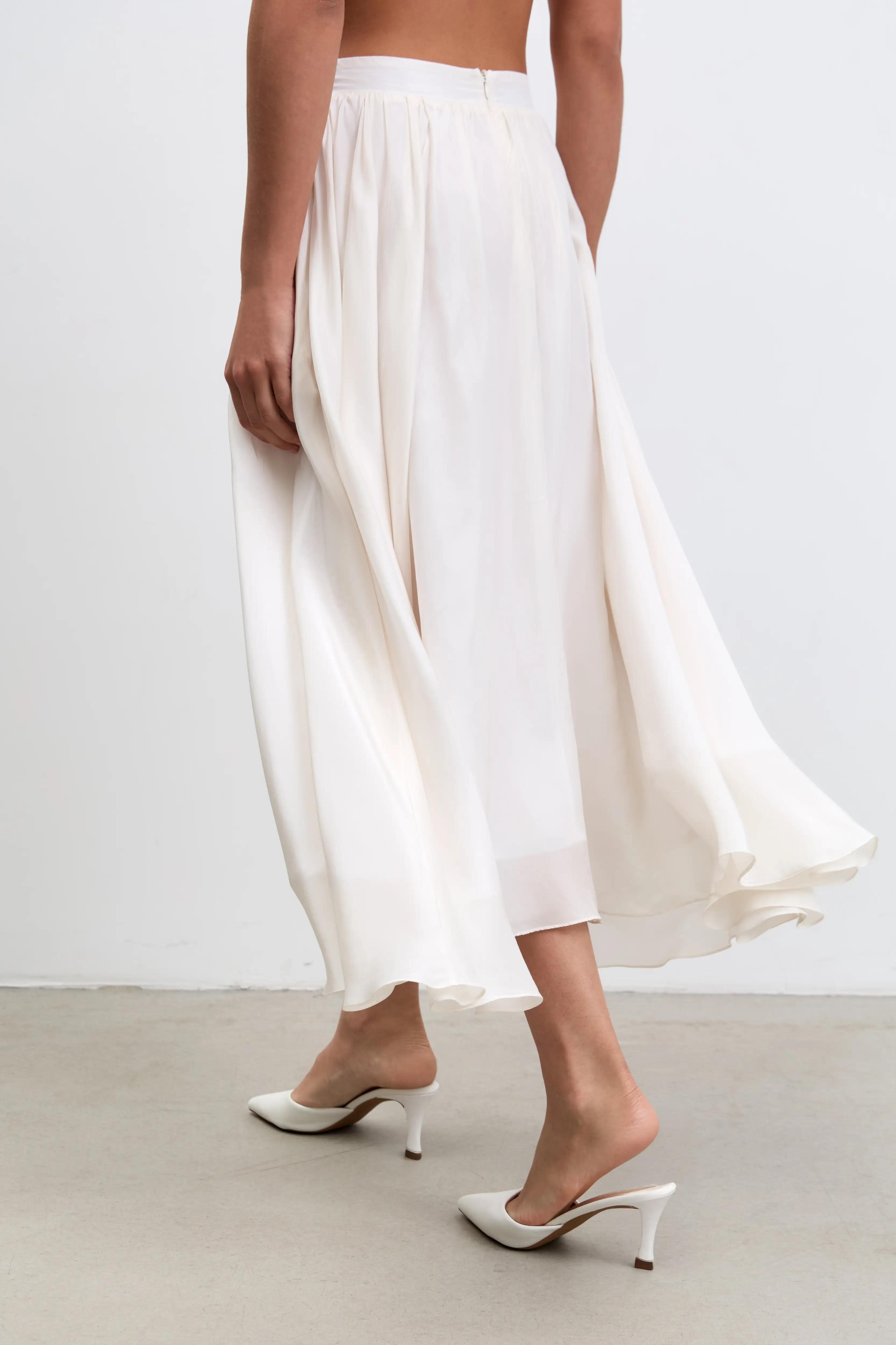 А-силуэт до середины икры: мягкие складки от притачного пояса добавляют объём, оставаясь лёгкими.