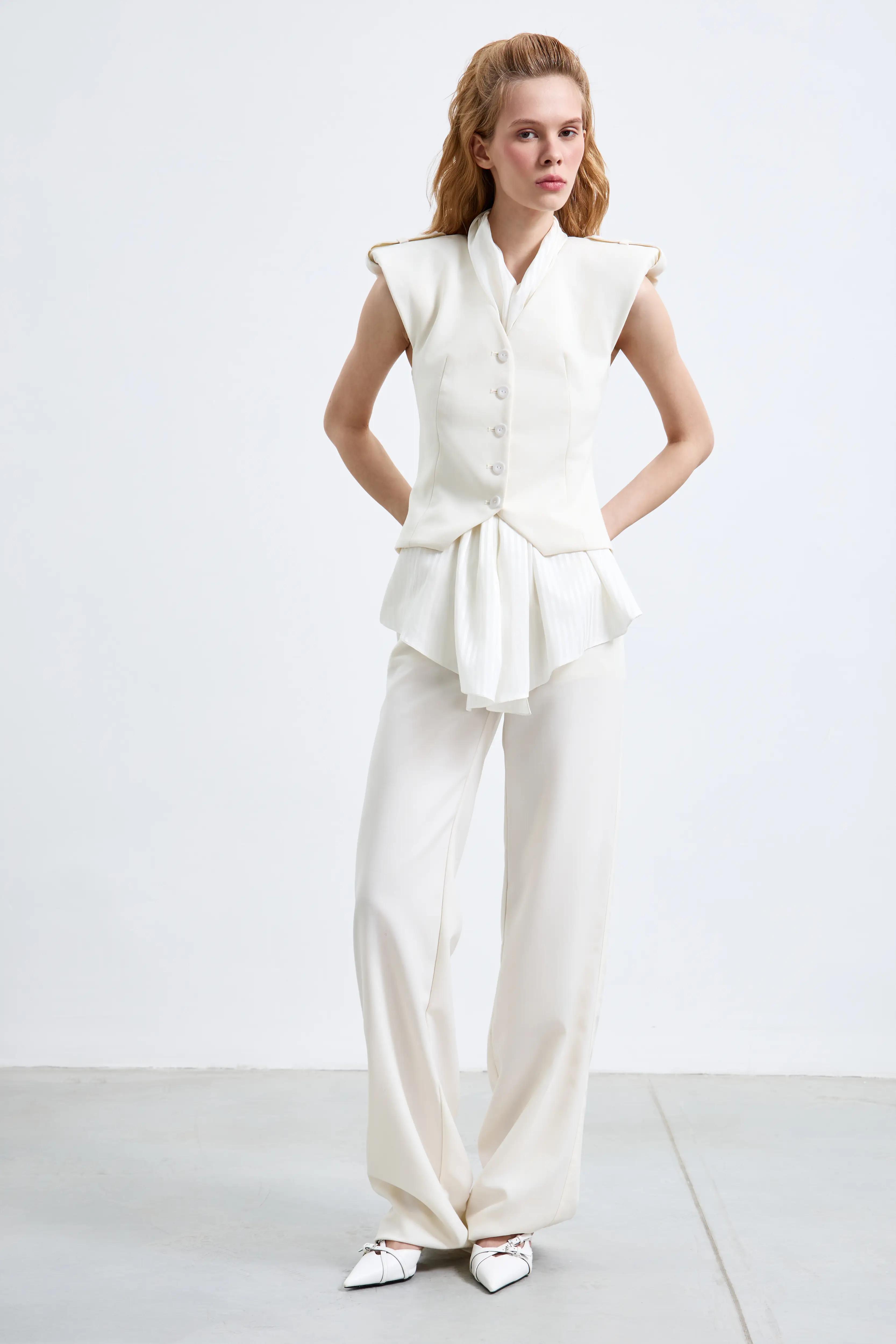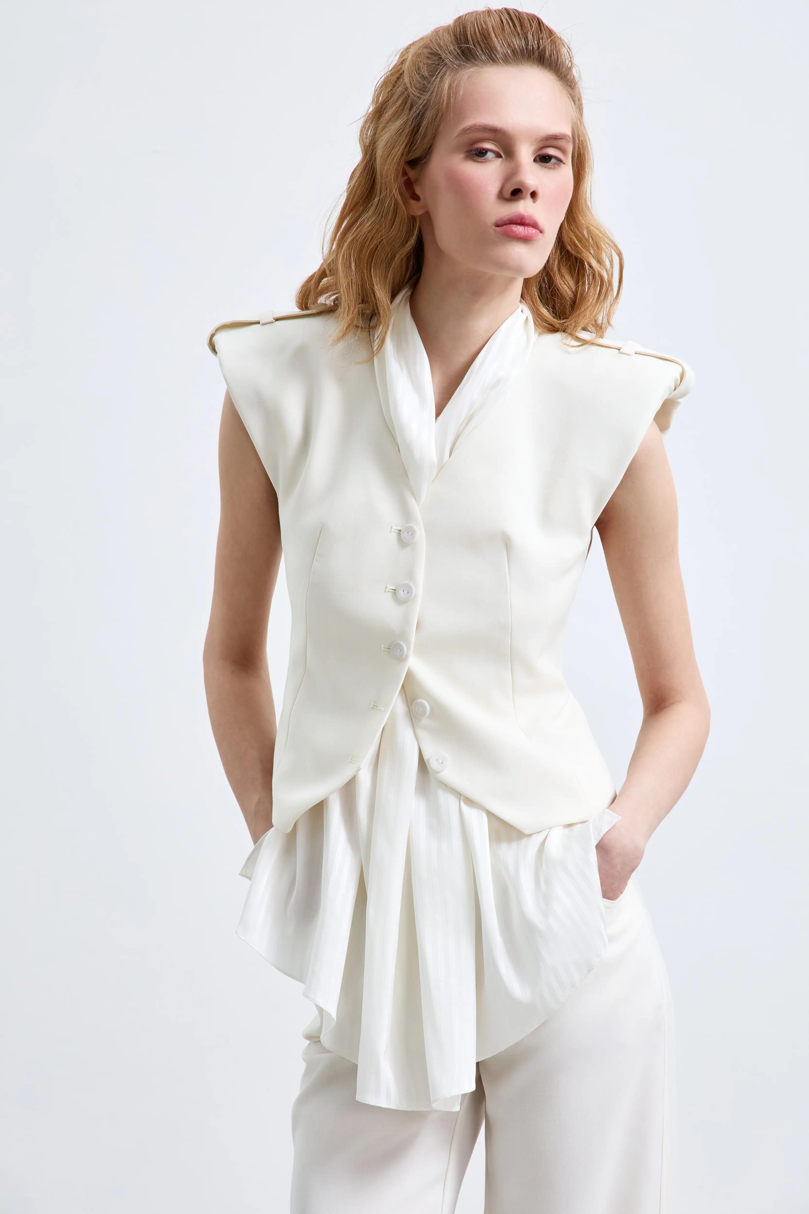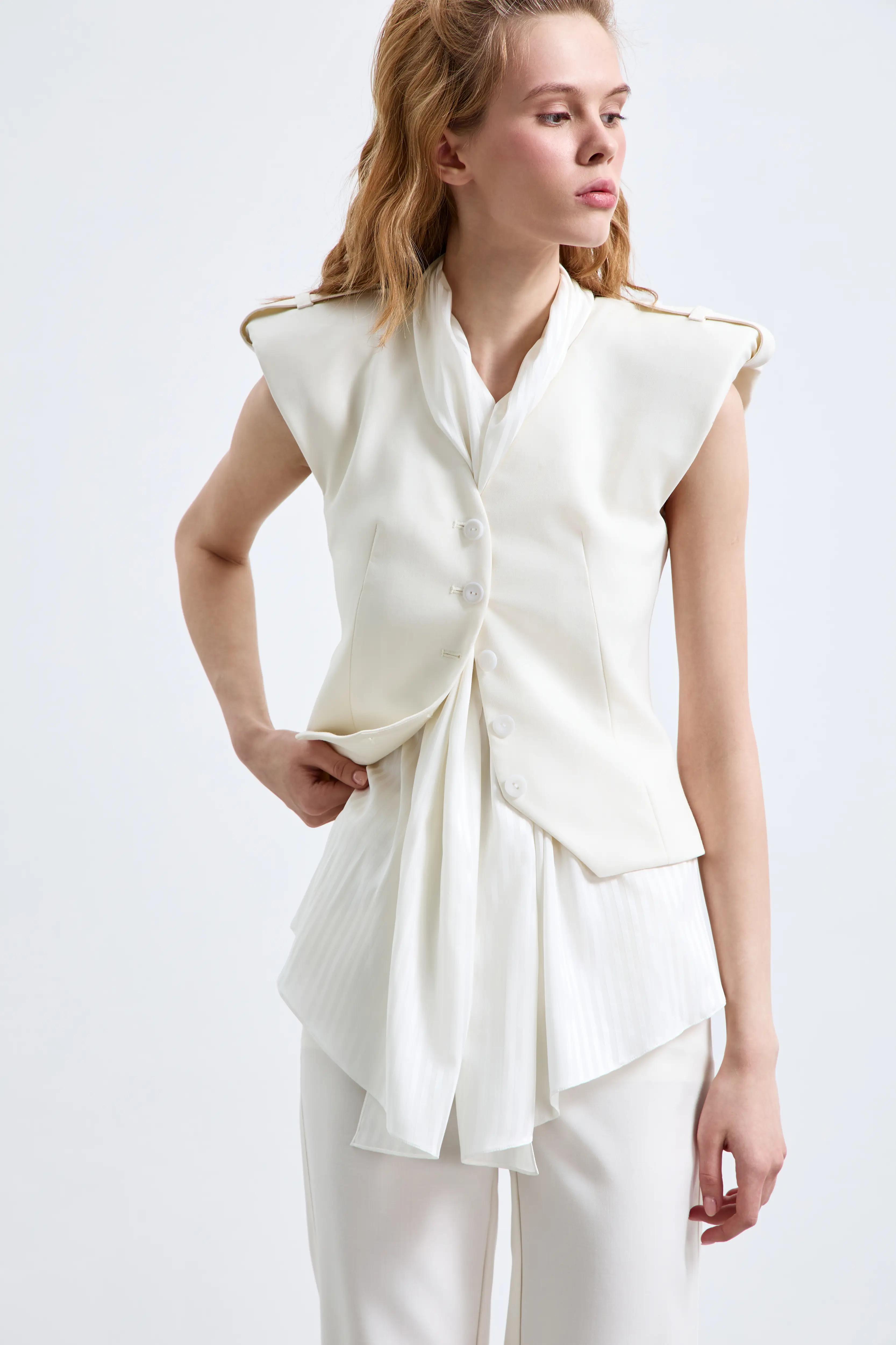 Жилет с открытыми плечами и мягкой драпировкой у горловины. Изделие имеет приталенный фасон, застегивается на пуговицах спереди, что ещё больше подчеркивает талию и делает её визуально уже. Можно носить как самостоятельный топ или в комплекте с брюками из той же ткани.