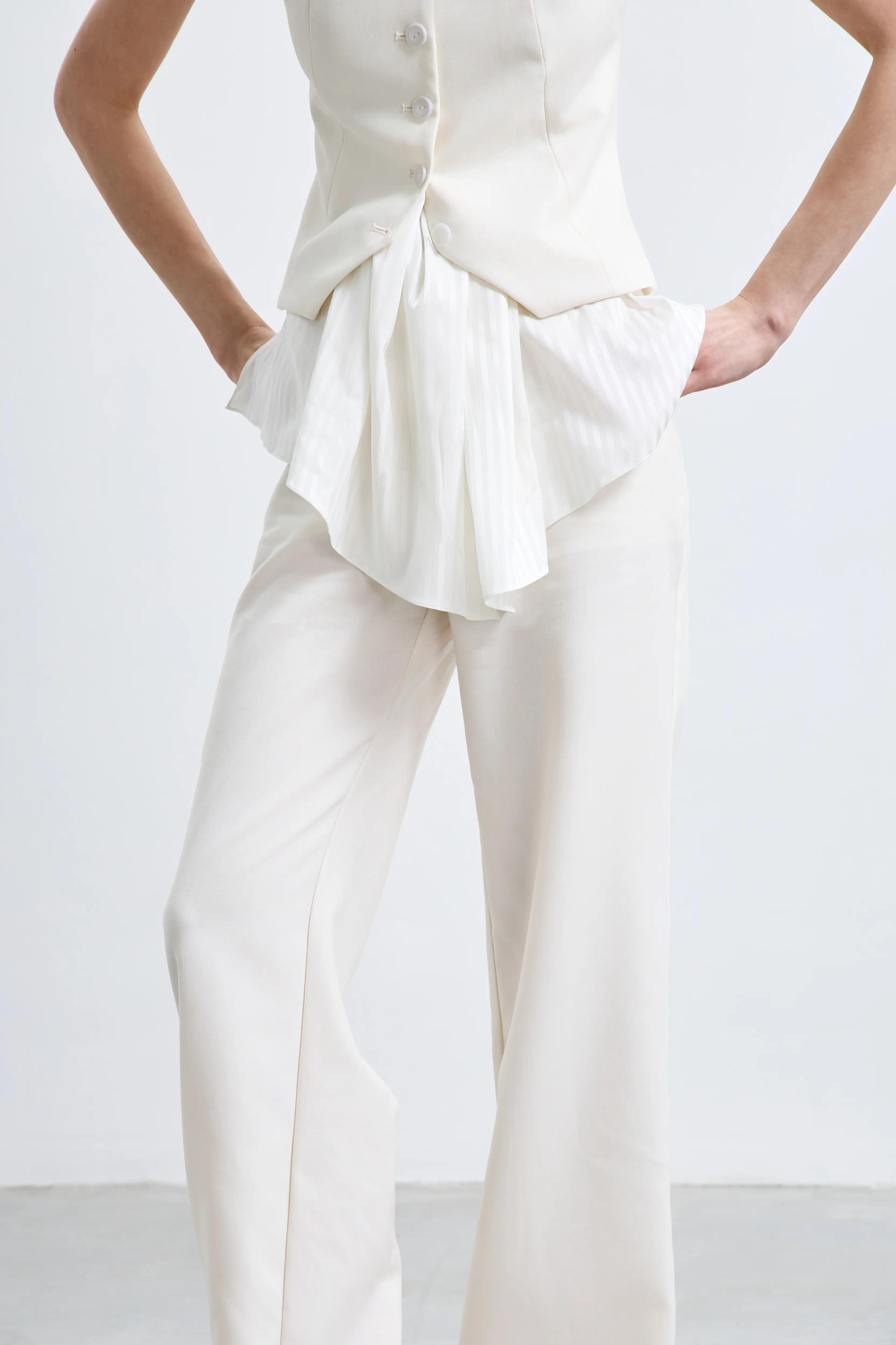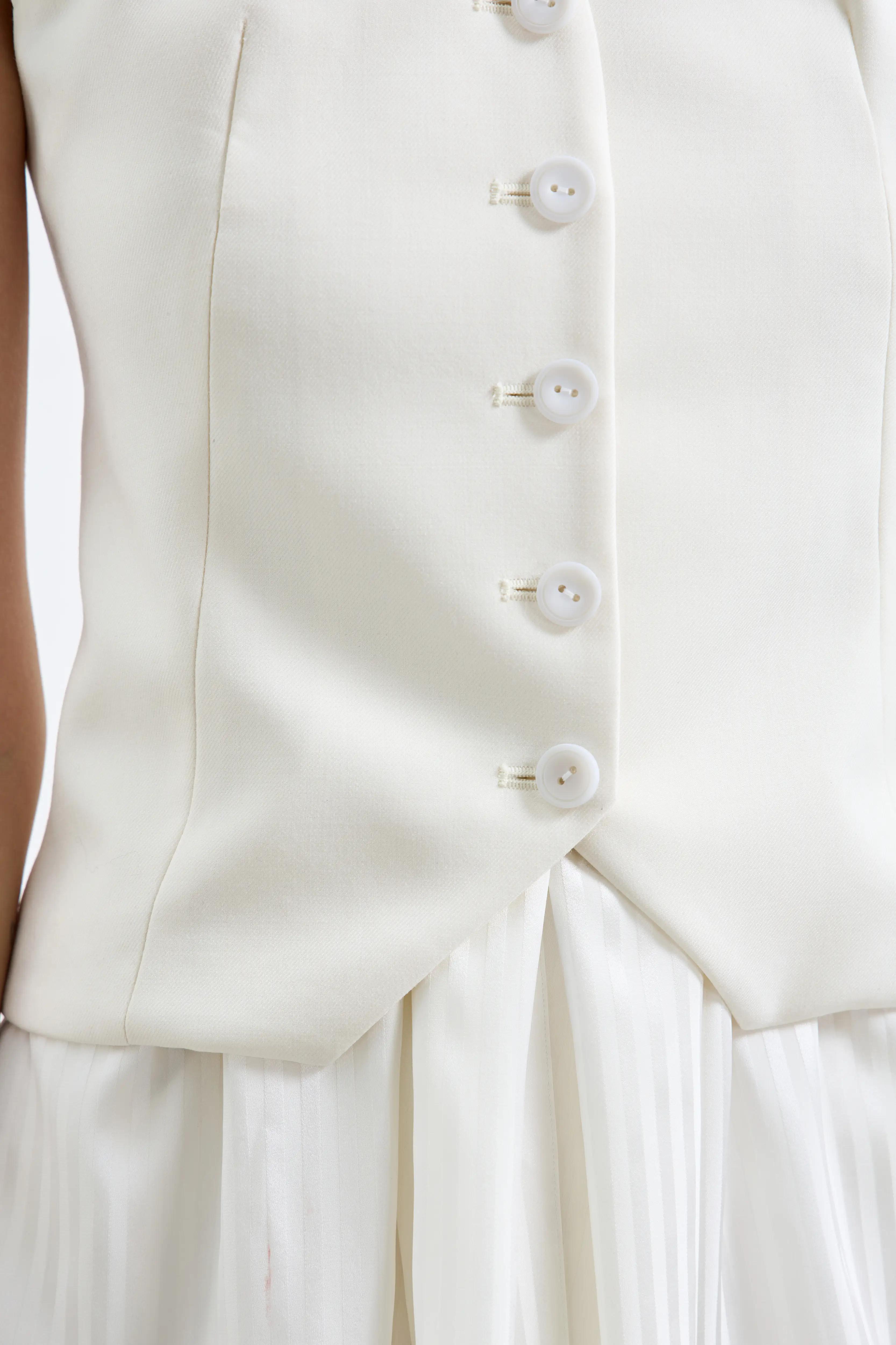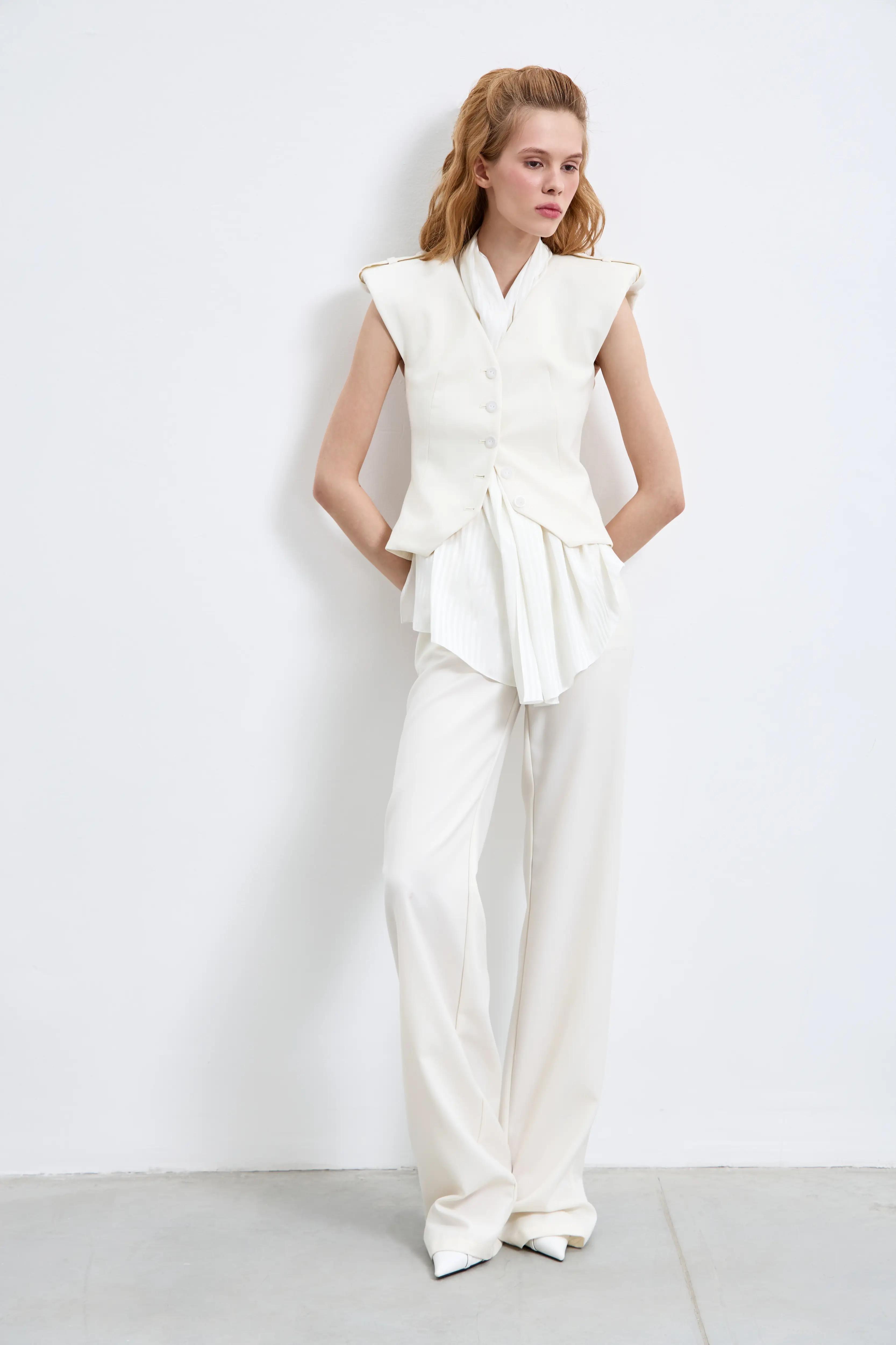 Жилет с открытыми плечами и мягкой драпировкой у горловины. Изделие имеет приталенный фасон, застегивается на пуговицах спереди, что ещё больше подчеркивает талию и делает её визуально уже. Можно носить как самостоятельный топ или в комплекте с брюками из той же ткани.
